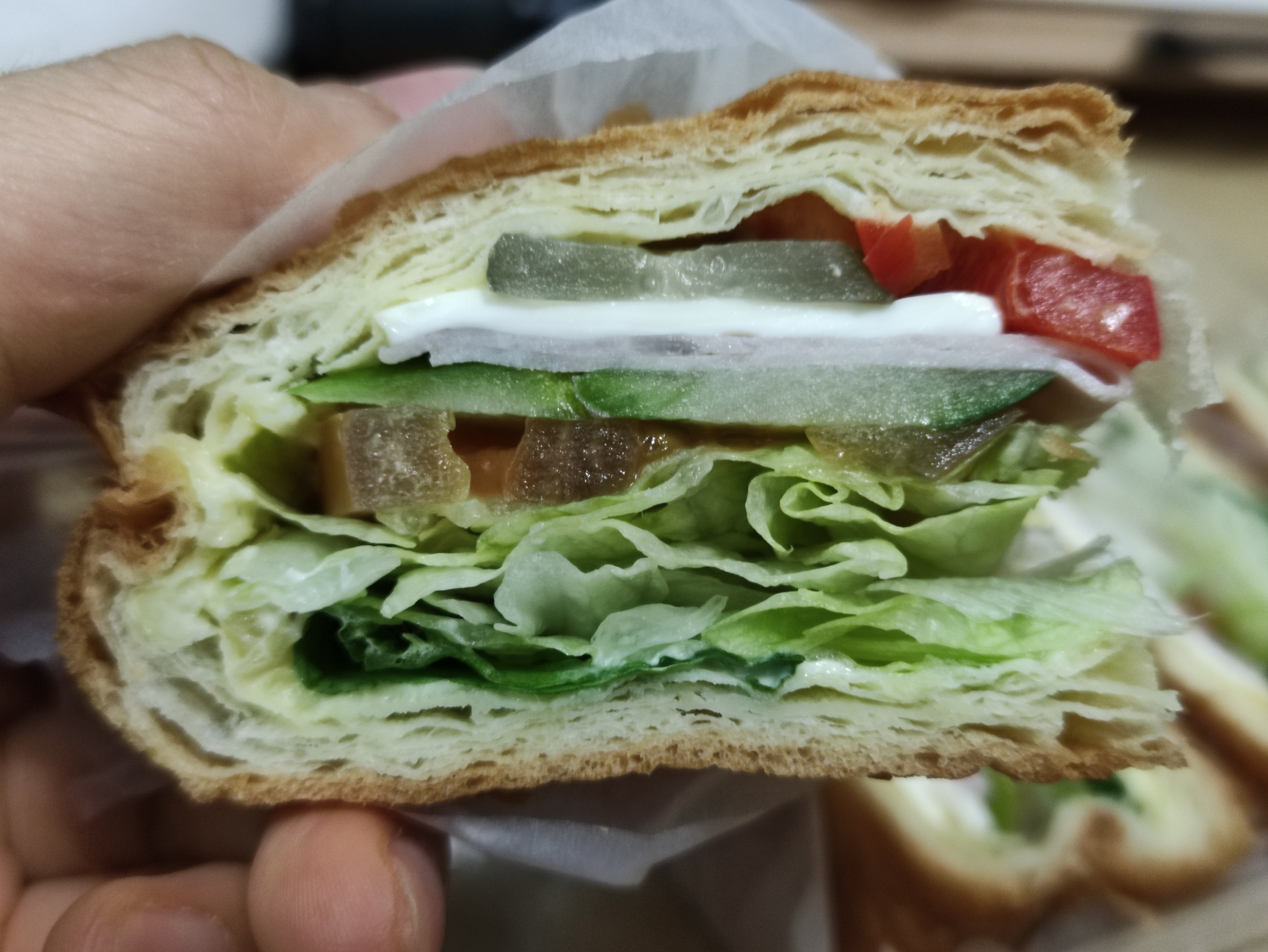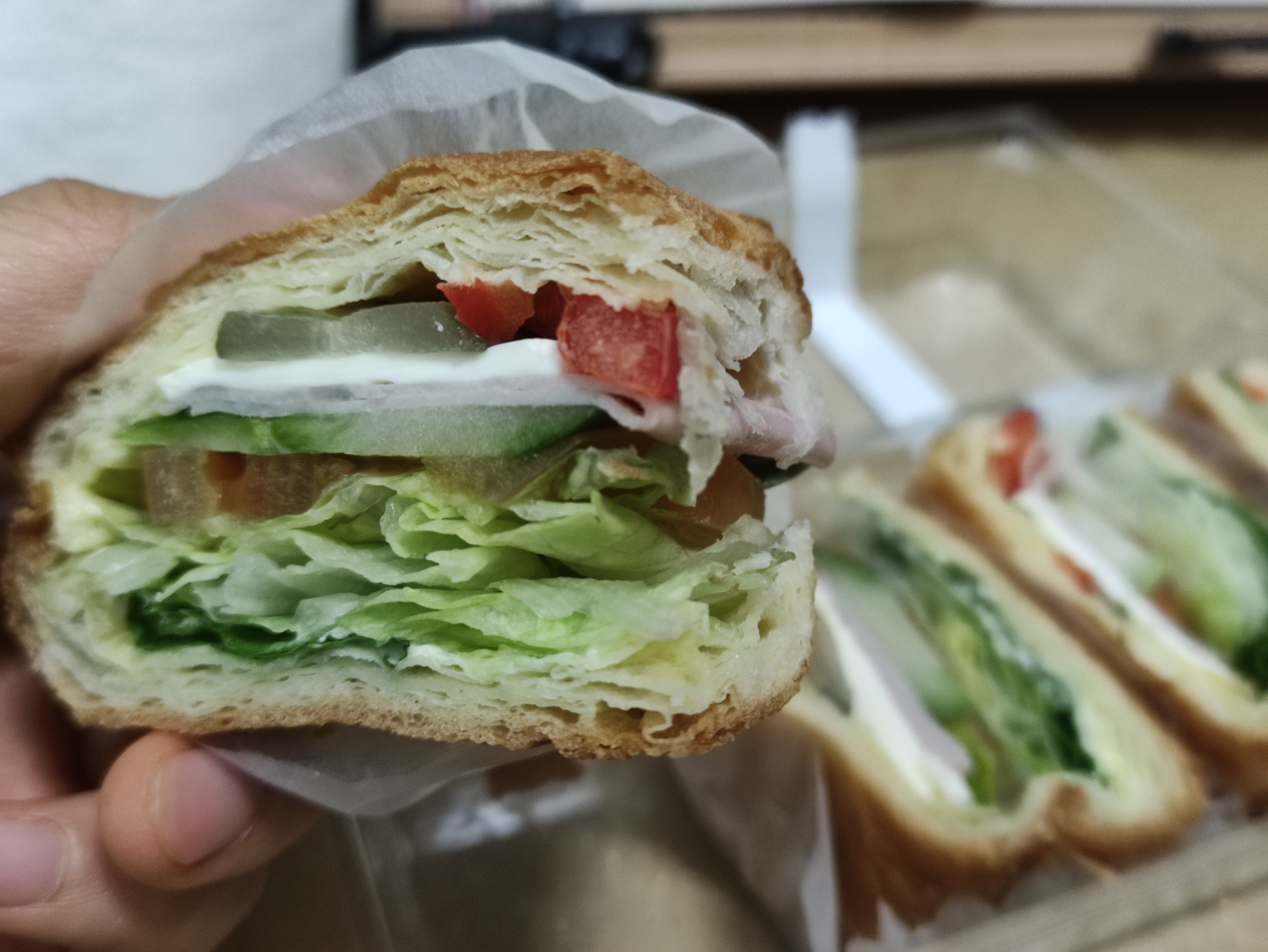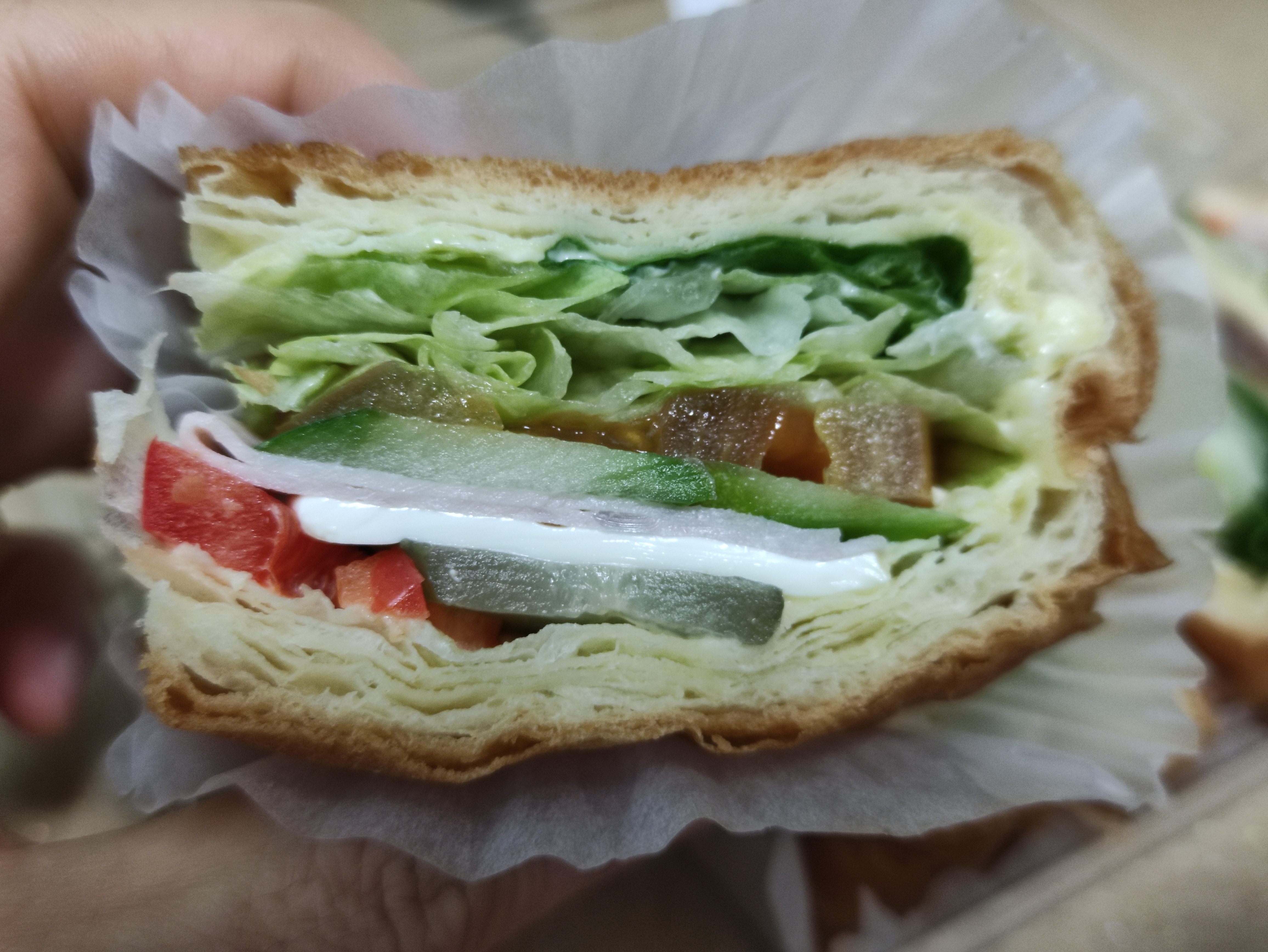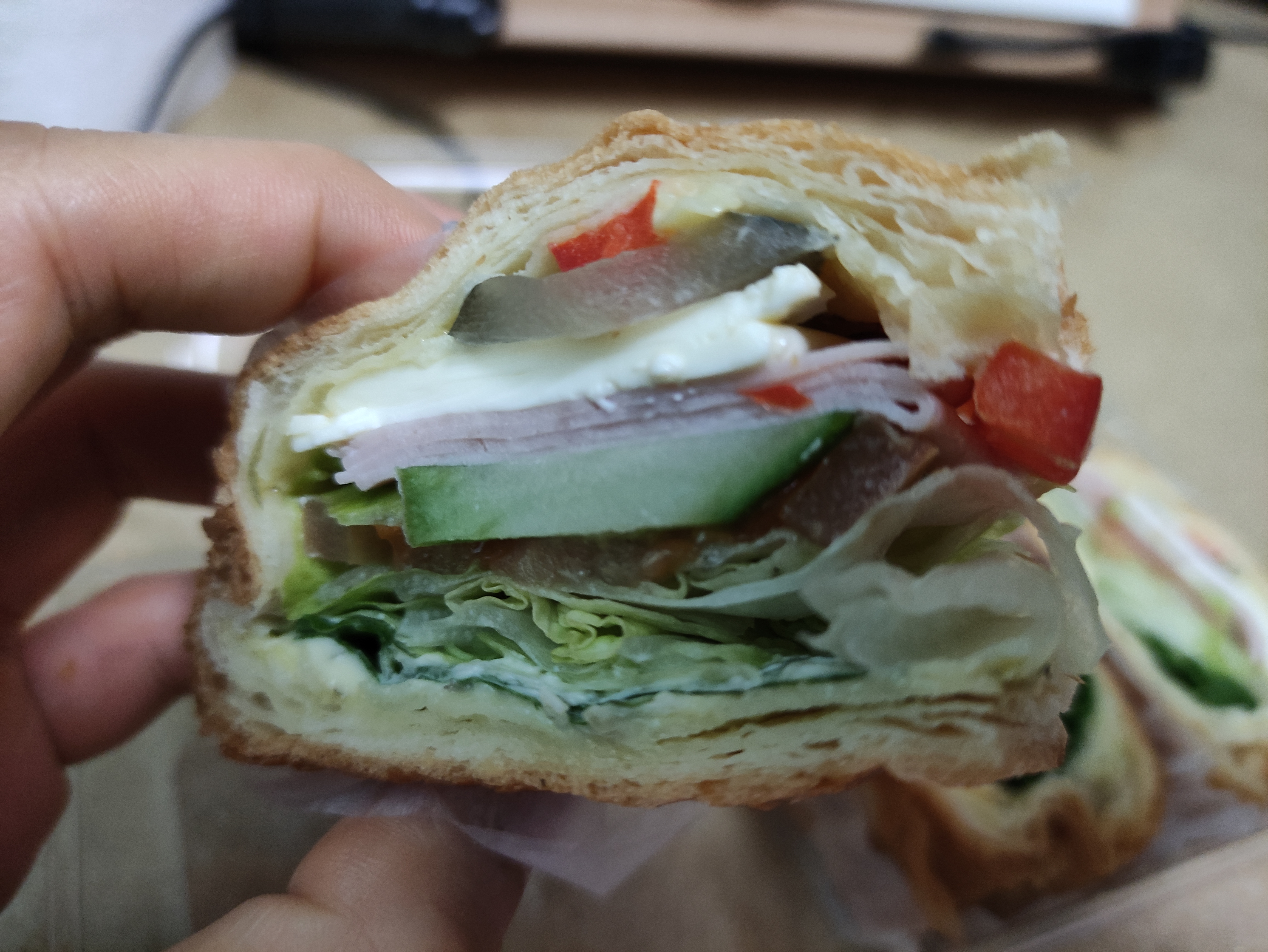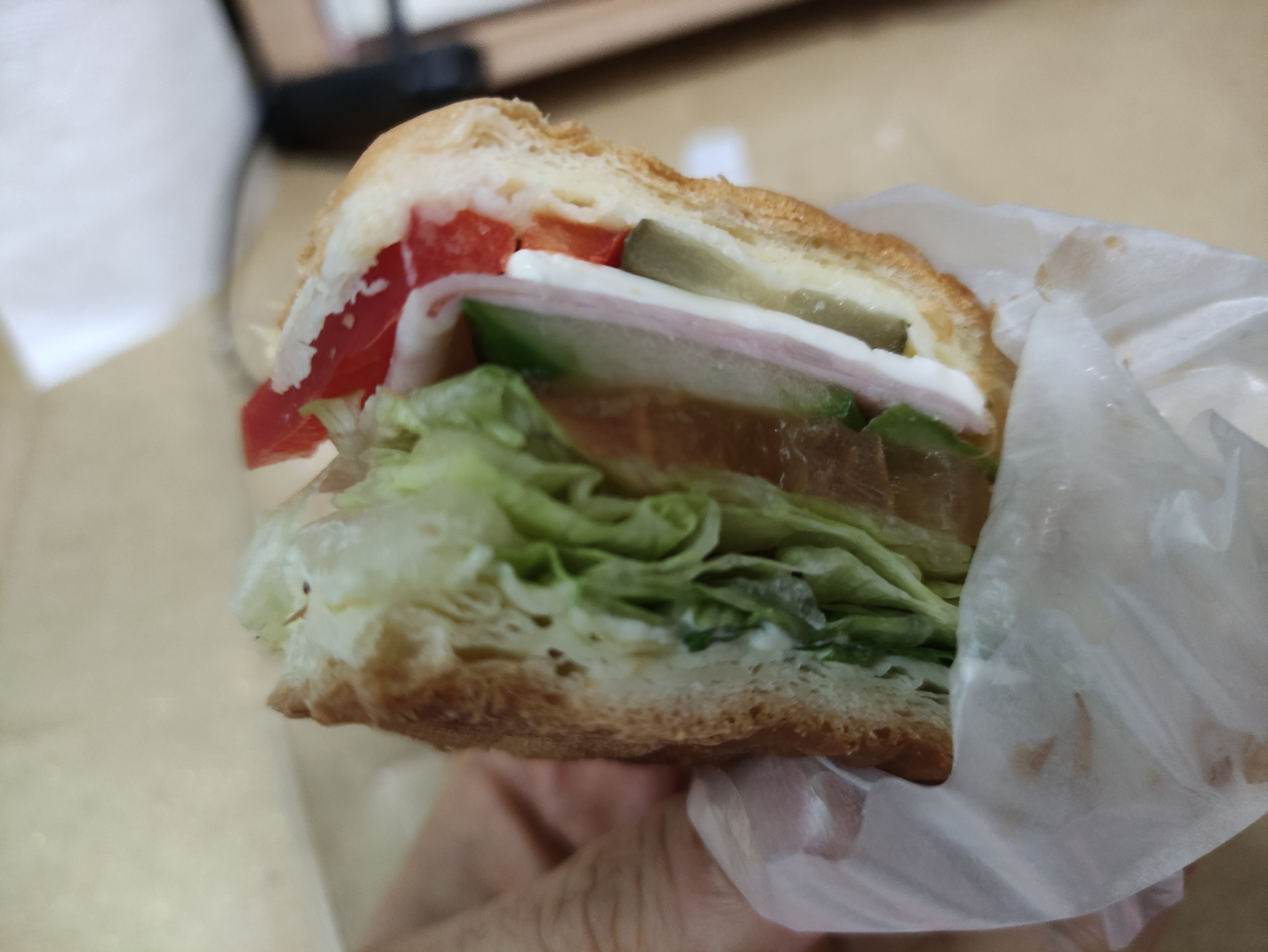 모닝샌드위치는 햄과 양상추 치즈 토마토 등이 들어있어요. 모닝샌드위치는 안쪽까지 토핑이 가득들어있어서 만족스럽습니다. 여러겹의 크로아상빵안에 들어있어요.
