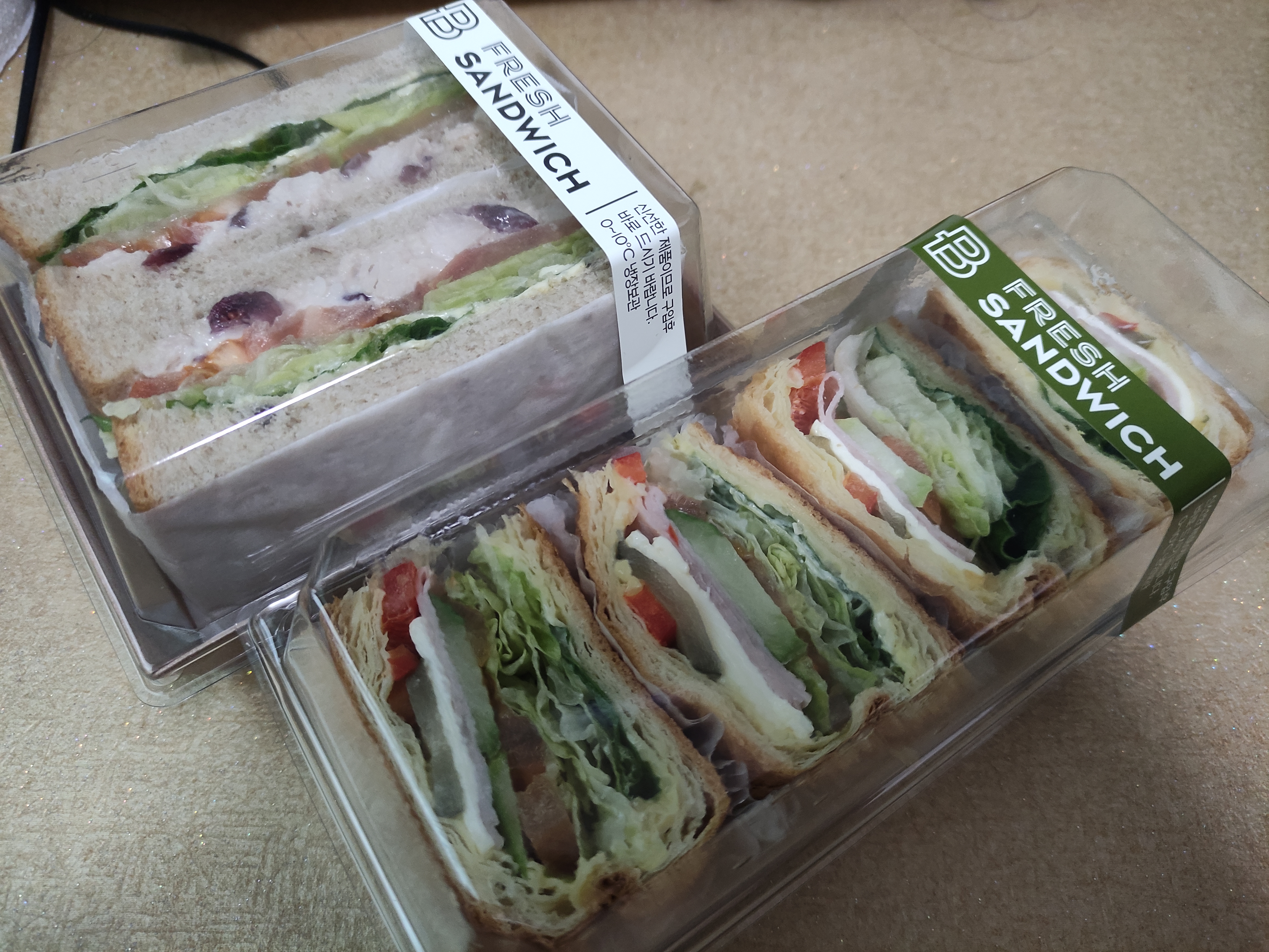 위가 크랜배리치킨호밀샌드위치고 아래가 런치샌드위치에요. 각각 2개 , 4개 한세트로 구성되어있어요.