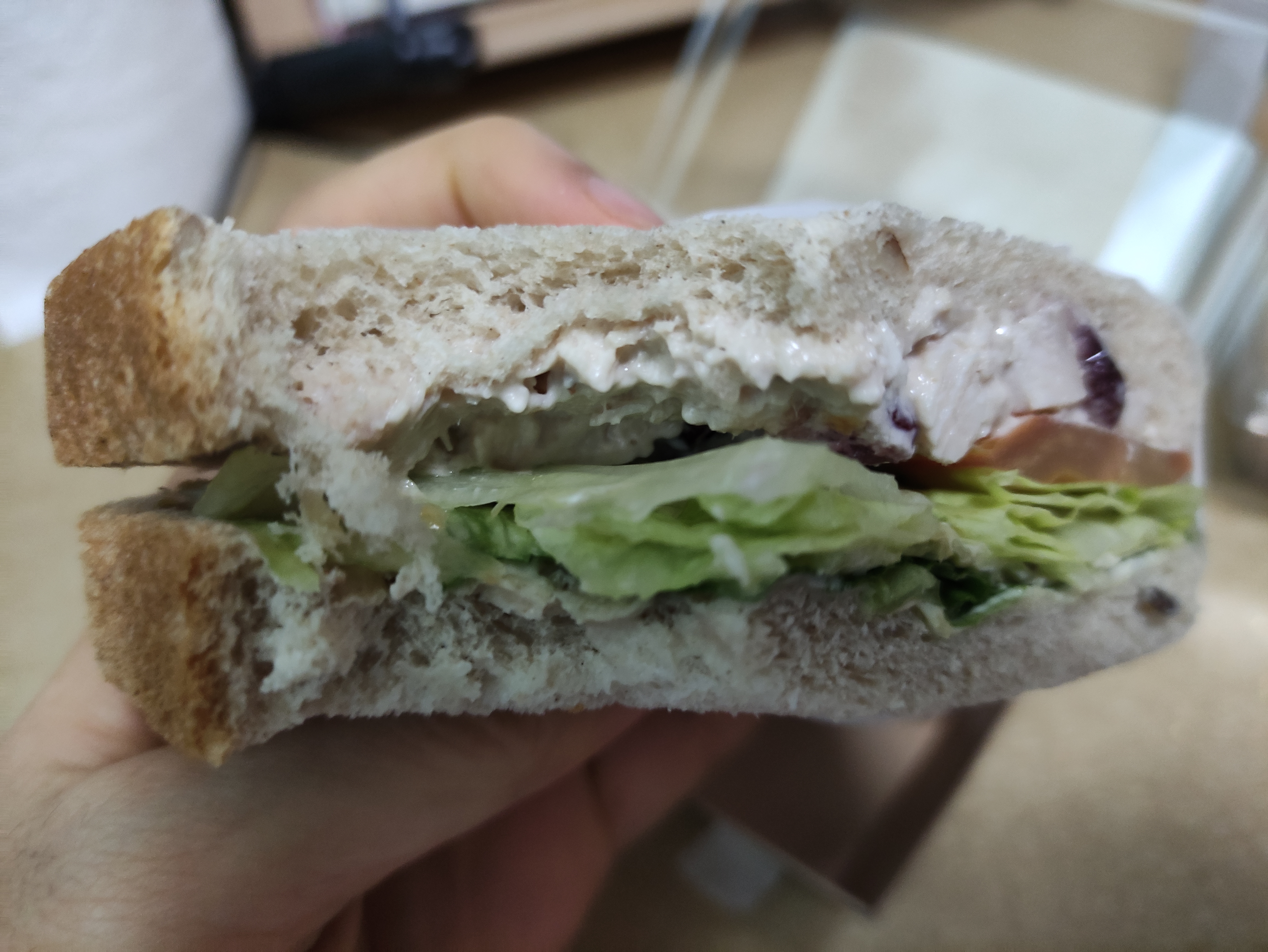 크랜배리치킨호밀샌드위치는 담백한호밀빵안에 양상추 크랜배리치킨토핑이 들어있어요. 한가지아쉬운건 토핑이 안쪽까지 가득들어있진 않아요. 대개 샌드위치가 그라하듯... ㅜ