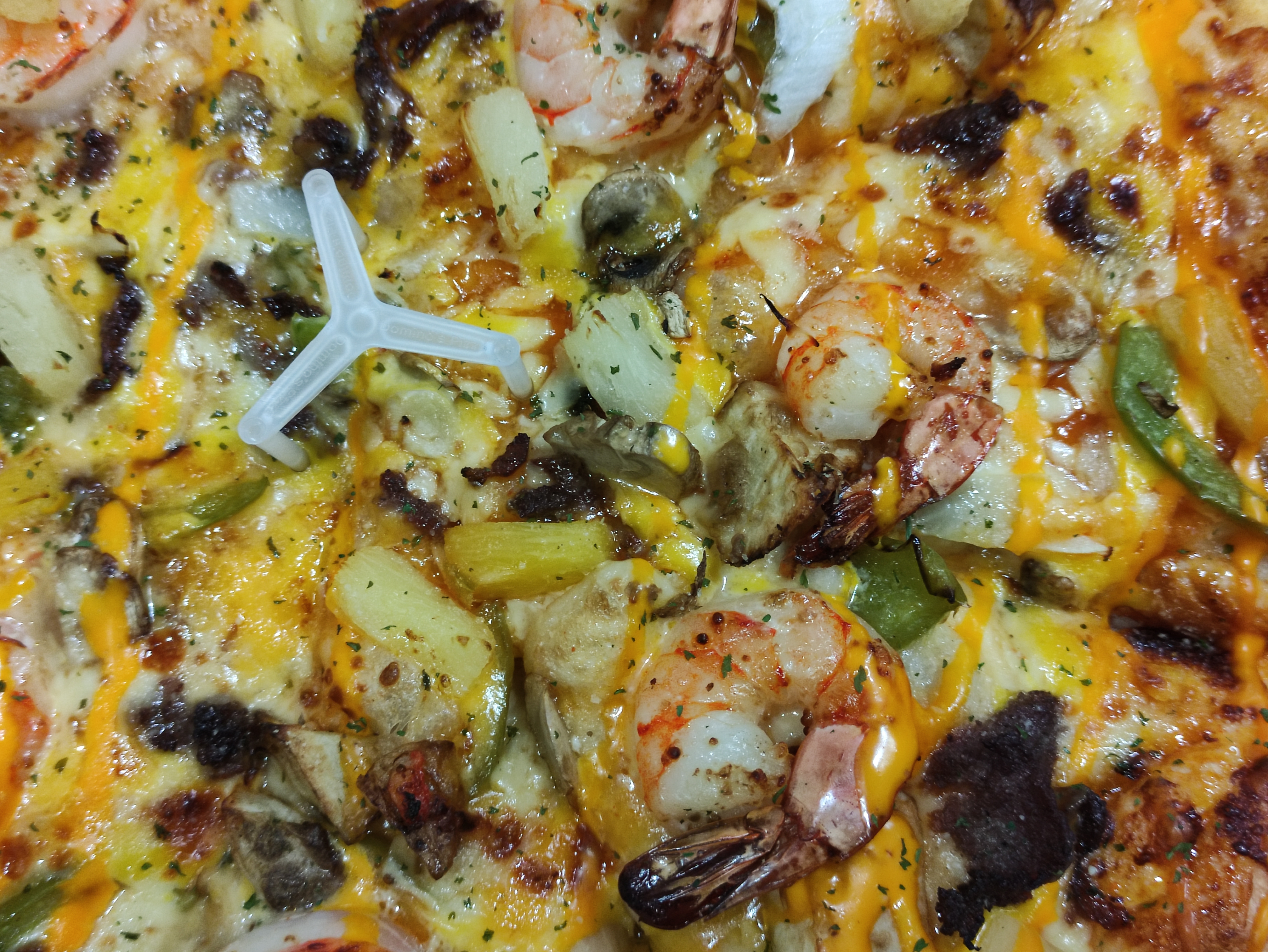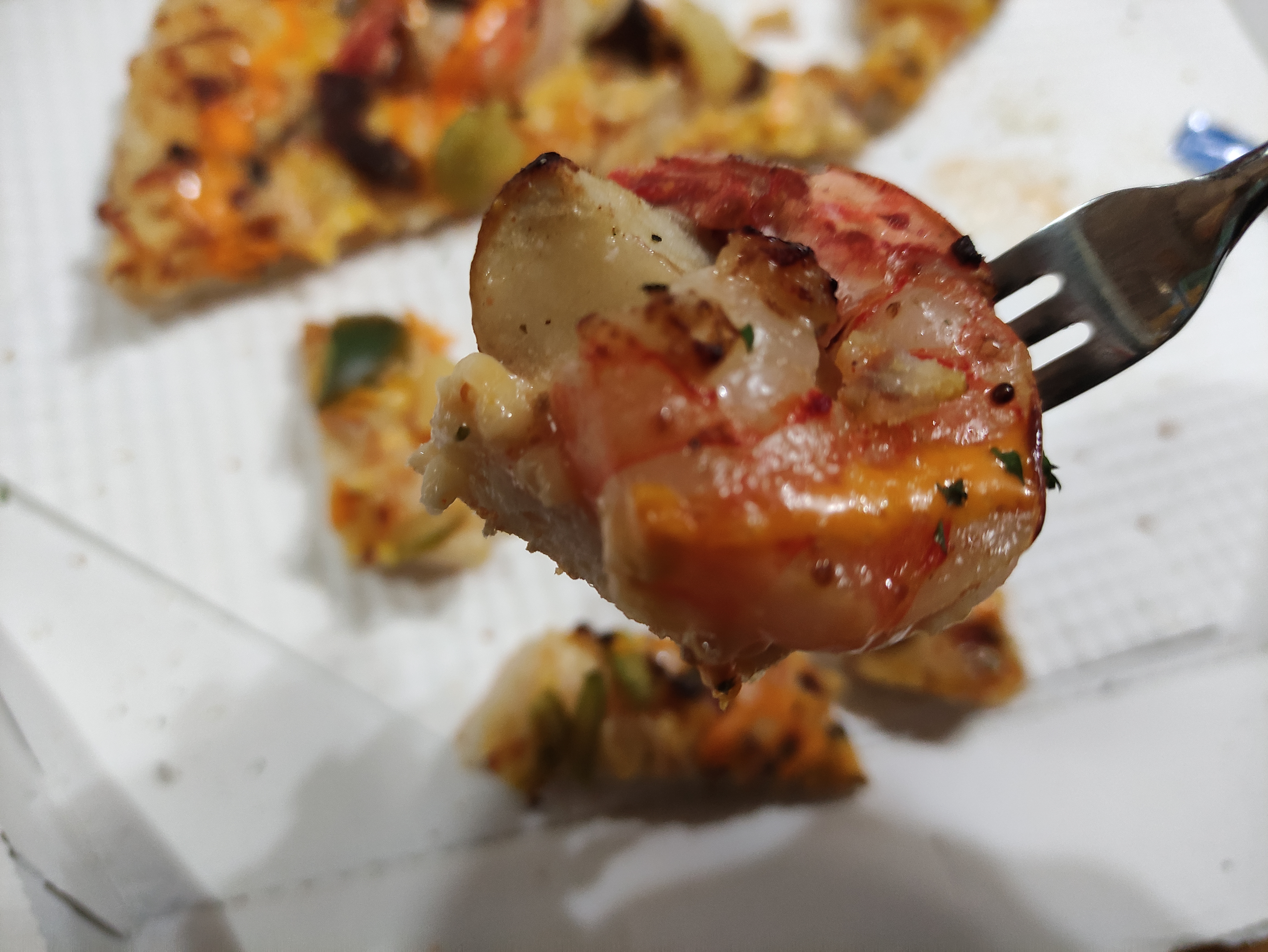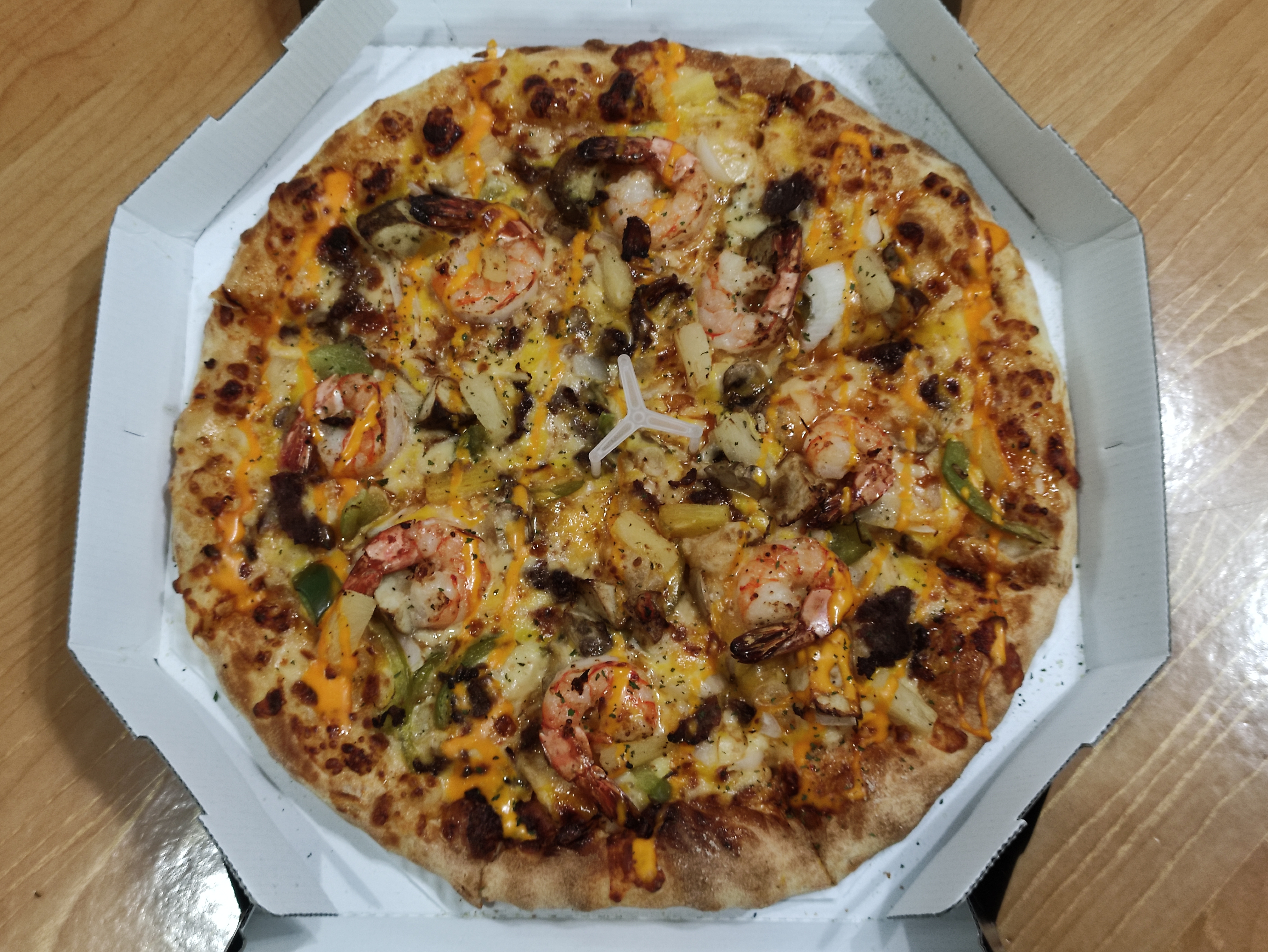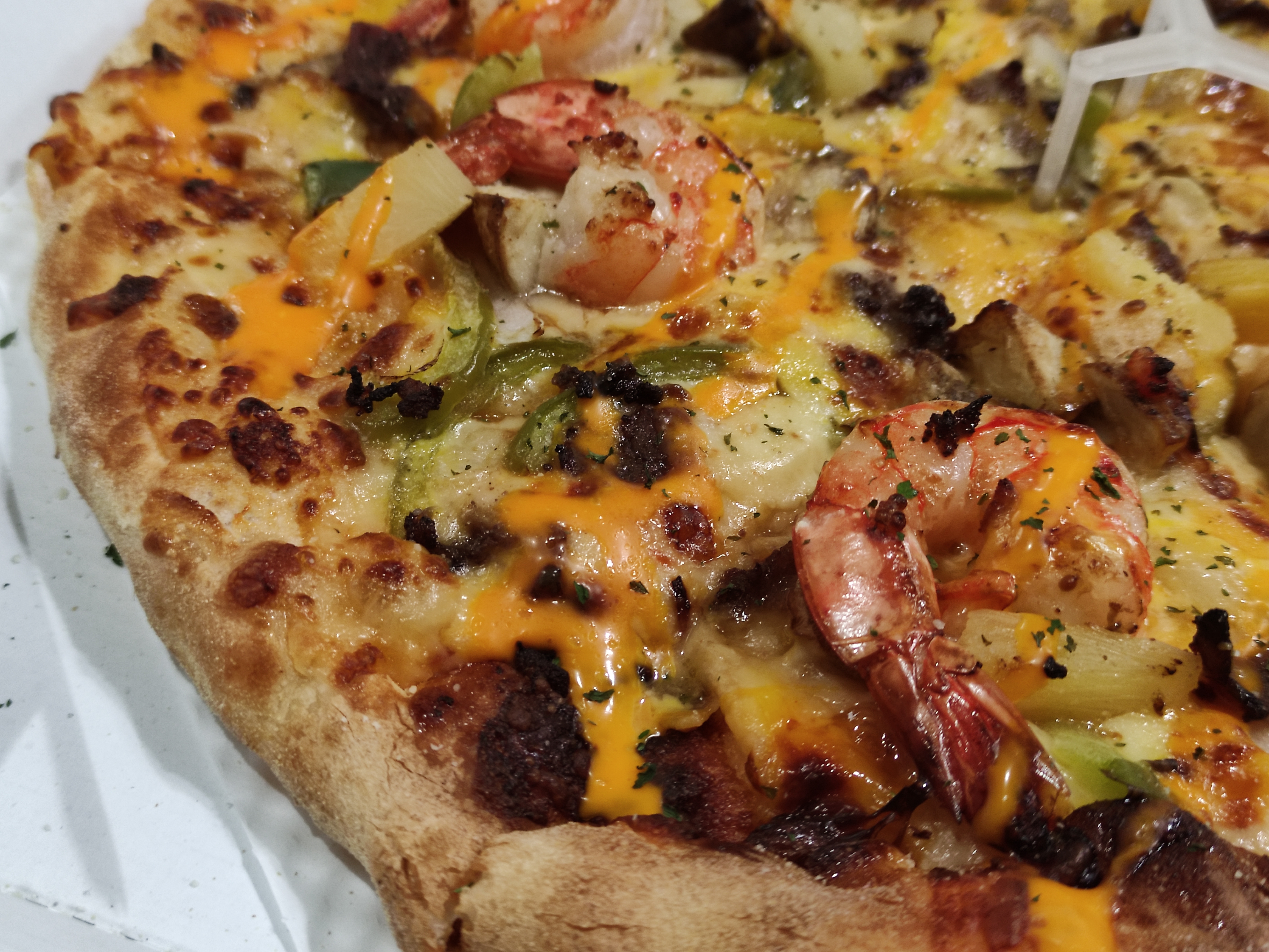 블랙슈림프피자입니다. 토핑이 가득가득 들어있어요. 특히 피자 가운데즈음에 큼지막한 블랙쉬림프가 눈에 띄네요.