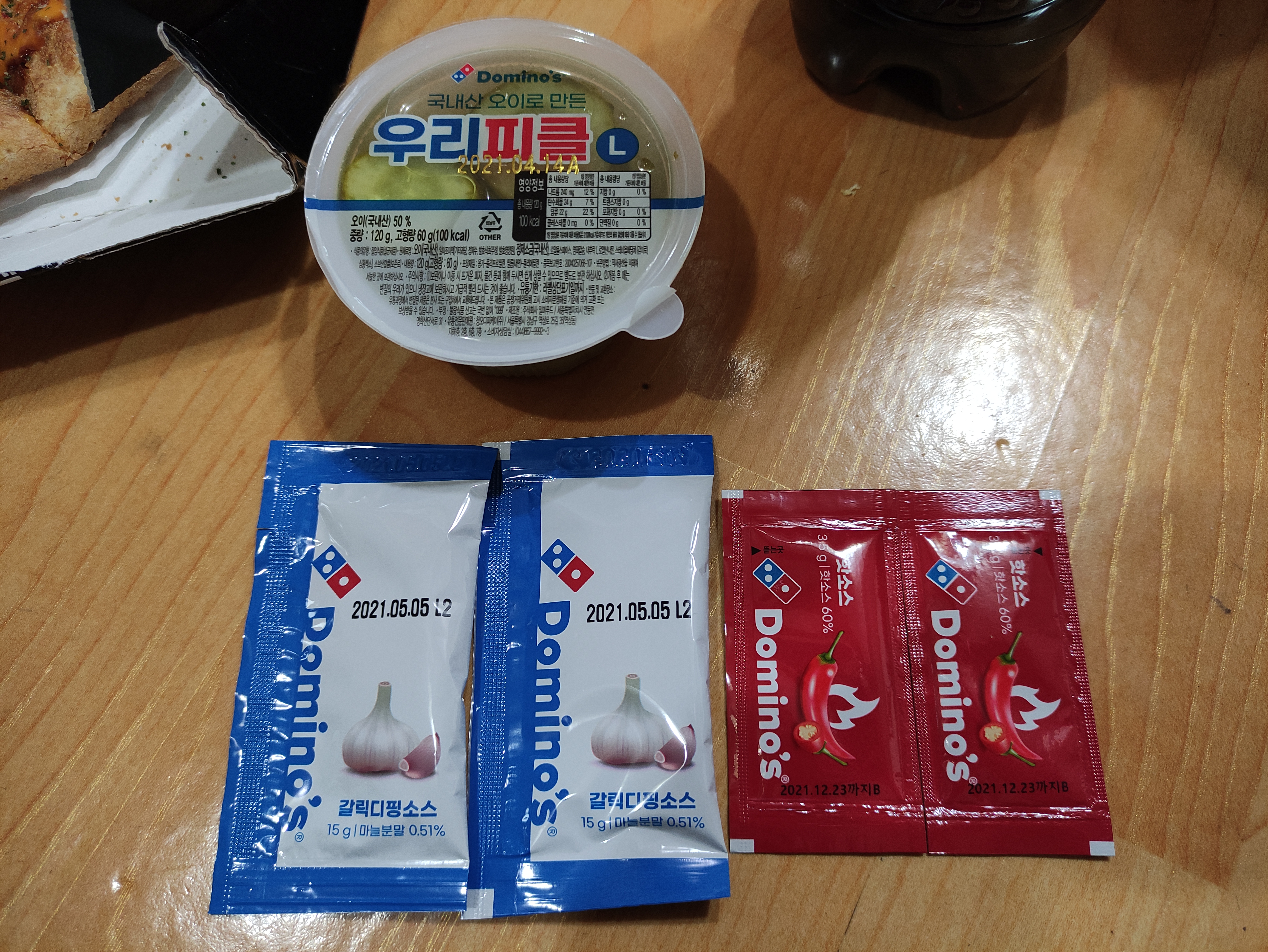 콜라는 업소용 코카콜라가 오고요, 부수적으로 피클과 갈릭소스, 핫소스를 받았어요.