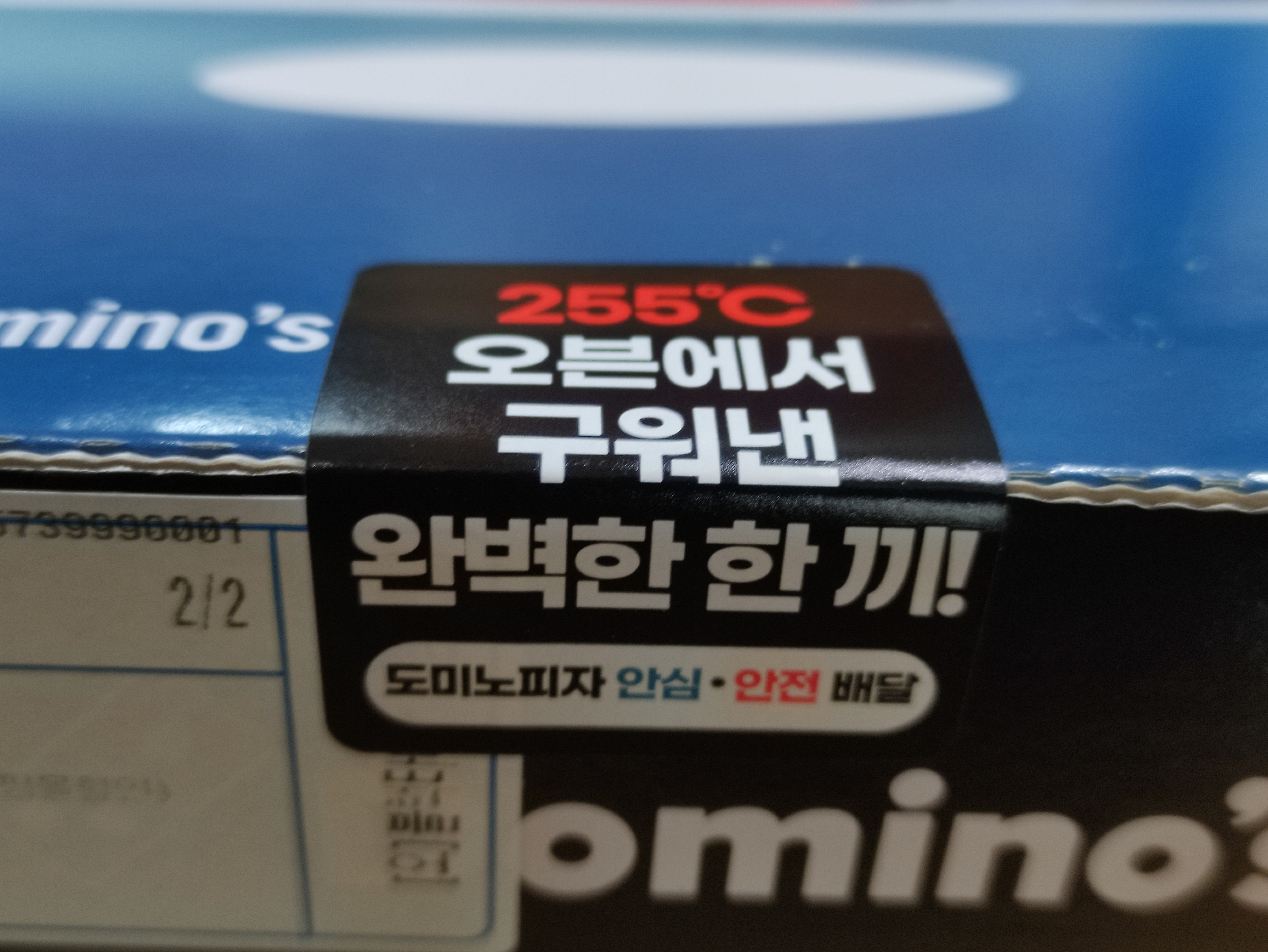 요즘 배달문제때문에 음식에도 실링이되는 추세죠. 도미노피자에도 박스포장 후 스티커로 단단히 실링이 되어있어 믿고먹을수있어요.