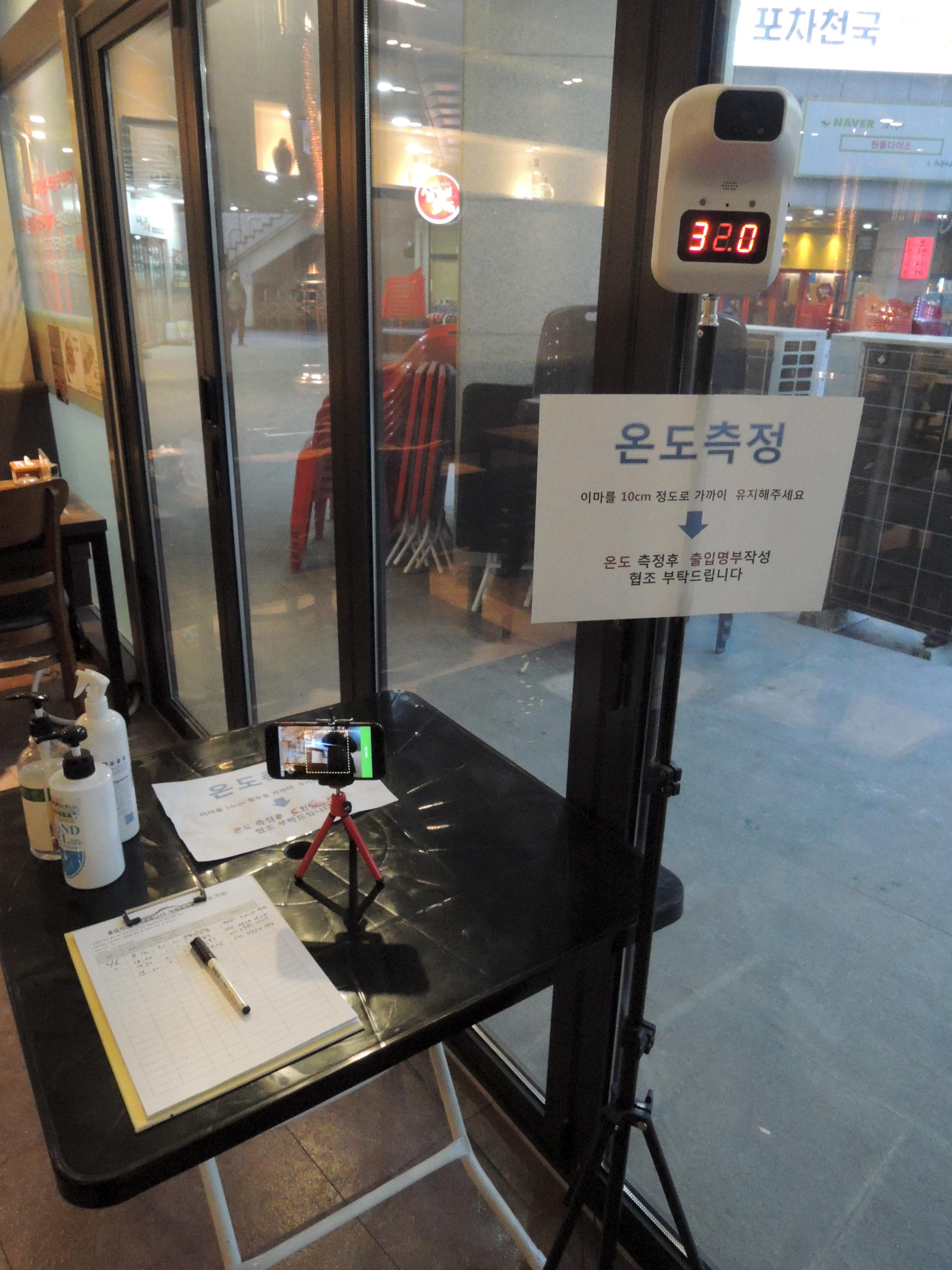 코로나확산방지를 위해 체온측정기와 큐알코드, 그리고 명부, 손소독제를 준비해놓았어요.