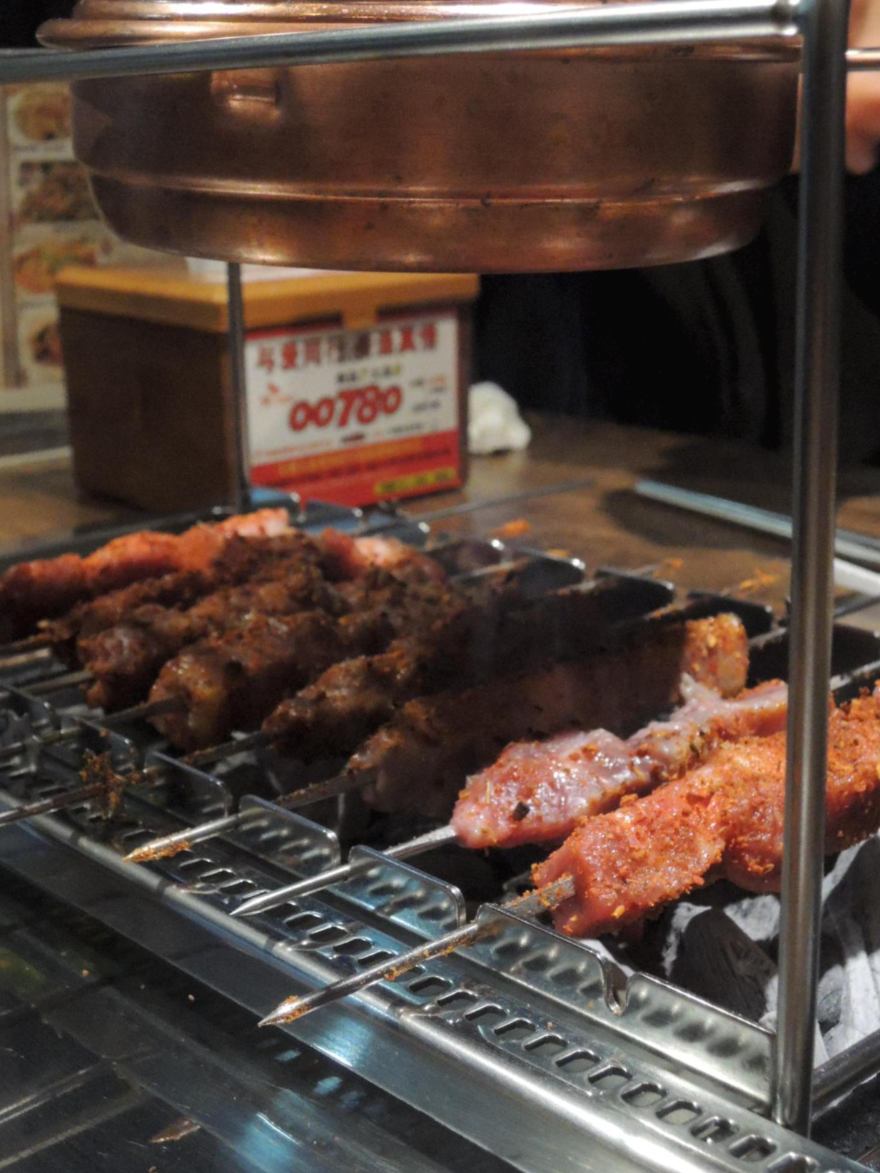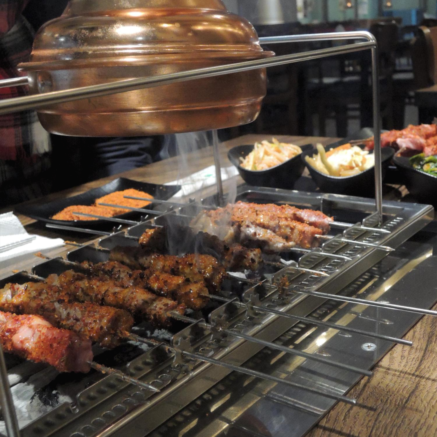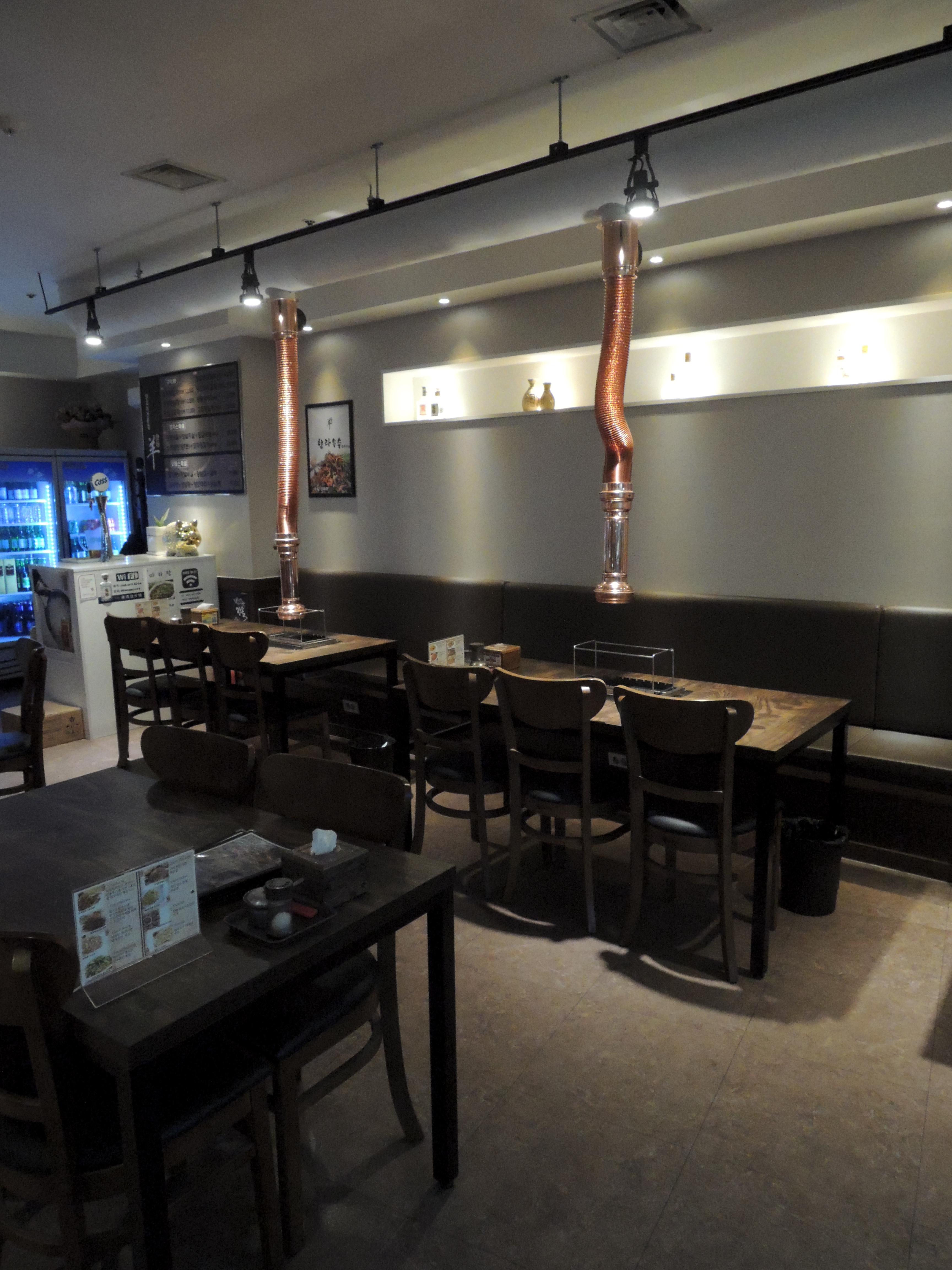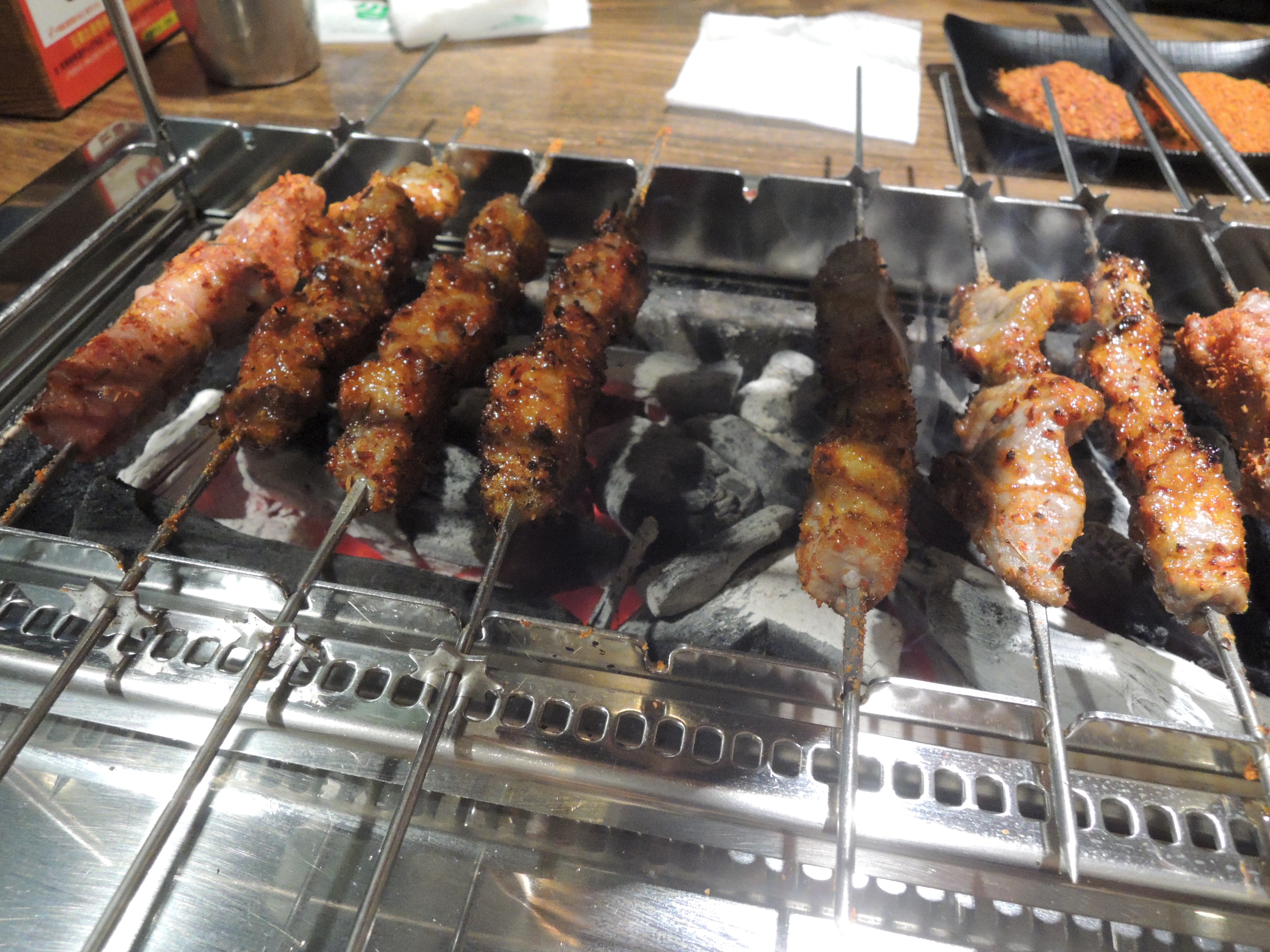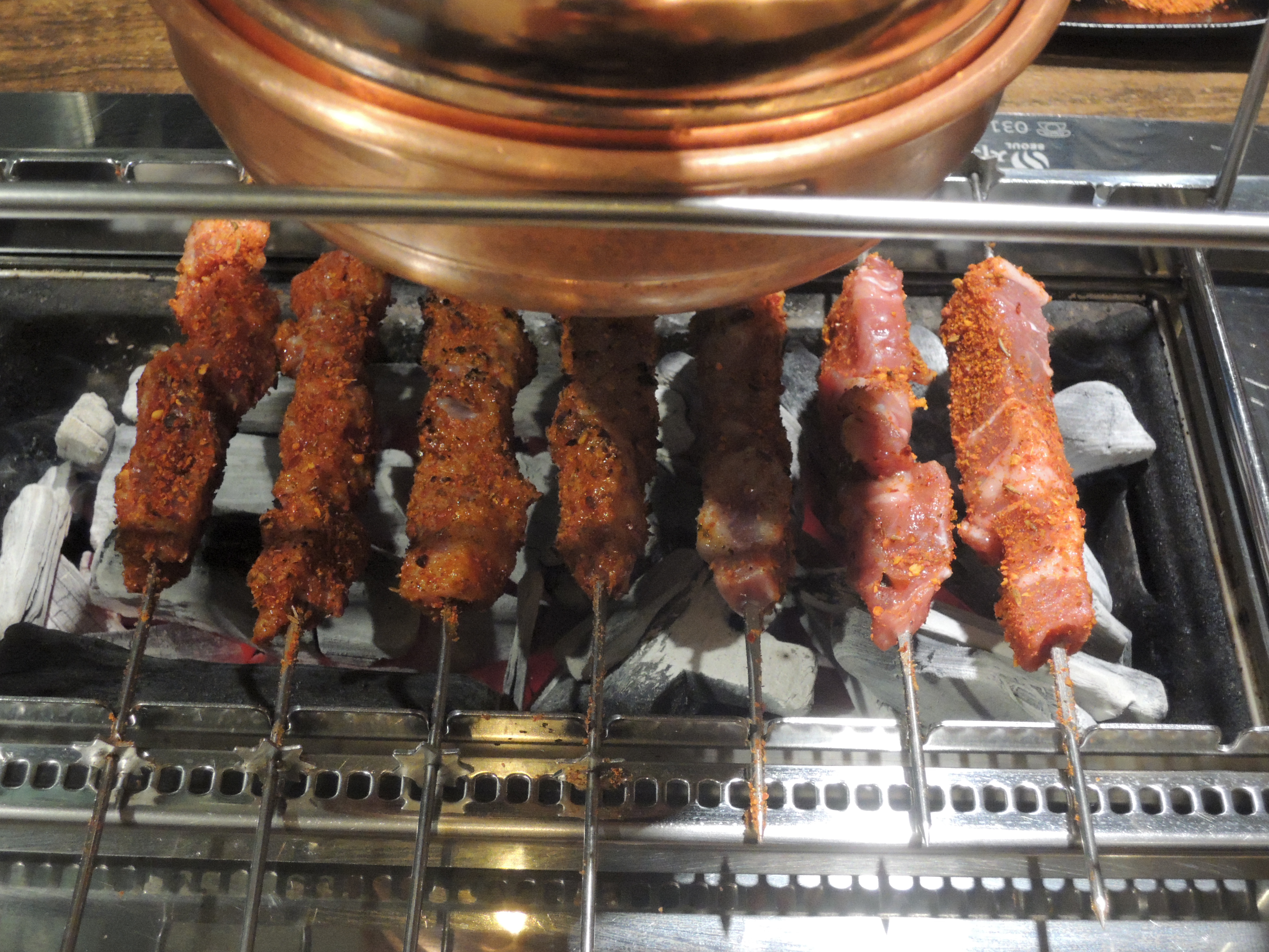 각 테이블마다 양꼬치 굽는기계, 그리고 연기가 빠져나가는 배연설비가 잘 되어 있어요.