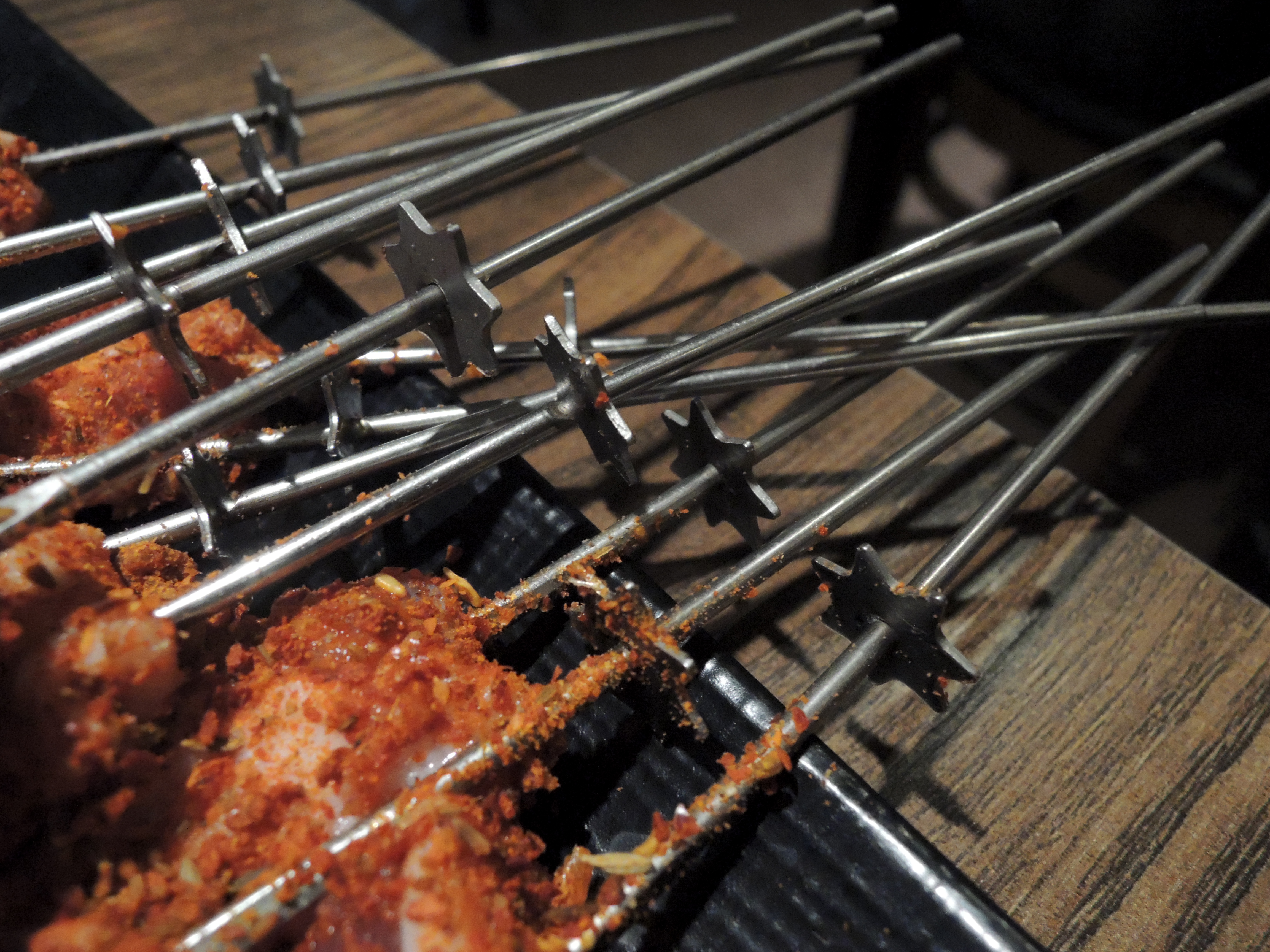 양꼬치 하단부에 톱니부분을 양꼬치 기계의 홈에 잘 맞춰놓으면 기계가 좌우로 움직이면서 양꼬치가 데굴데굴 구릅니다. 그럼 양꼬치 표면이 고루 익어서 맛있는 양꼬치를 즐길 수 있어요. 양꼬치만드는기계 누가 만들었는지 참 잘만들었네요.