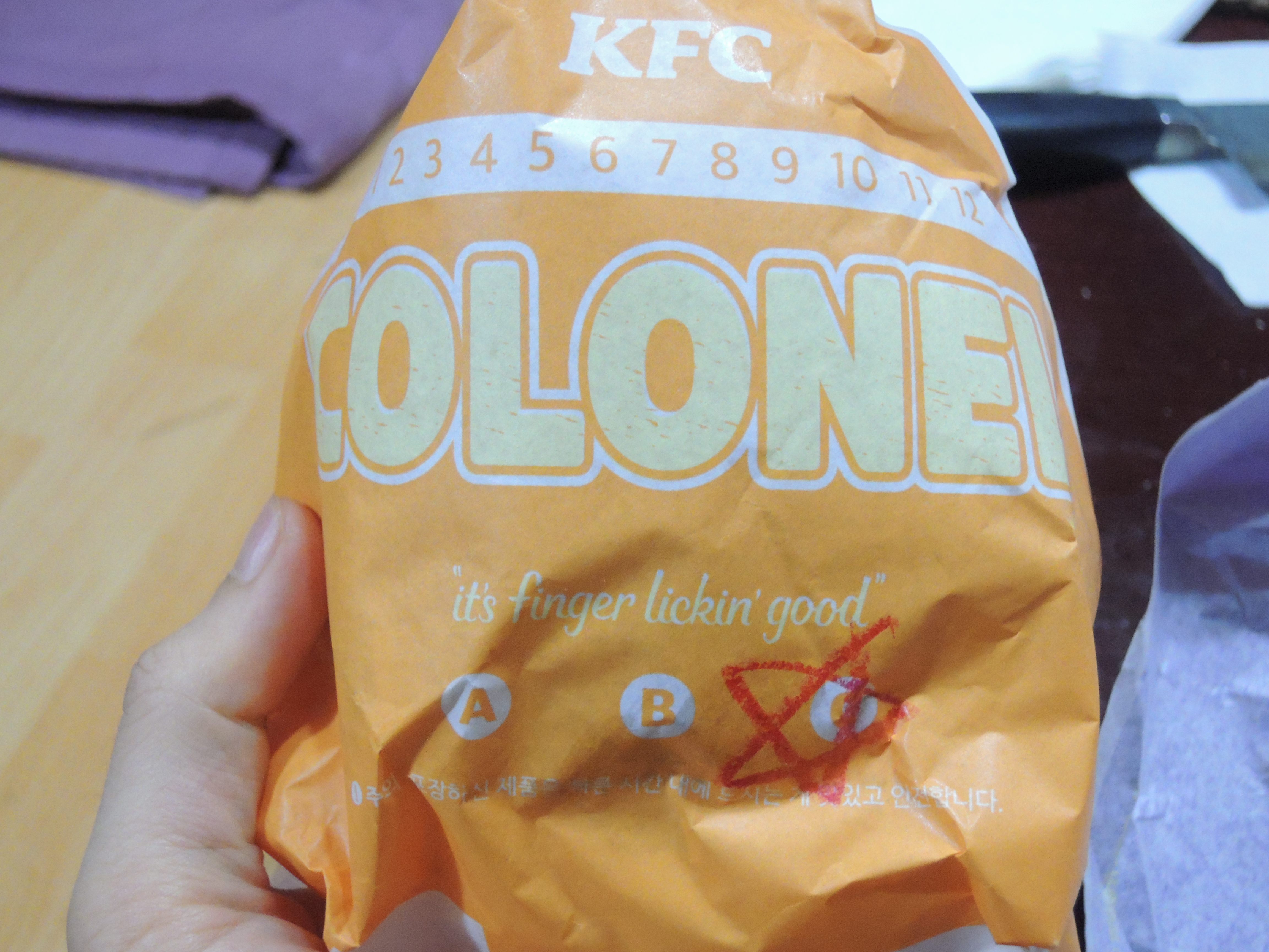 커넬골드문버거, 저는 포장해서 가져왔습니다. 겉포장지에 A,B,C는 무슨뜻일지 궁금해지네요. ㅎㅎ 저는 C에 표시가 되어 있습니다.