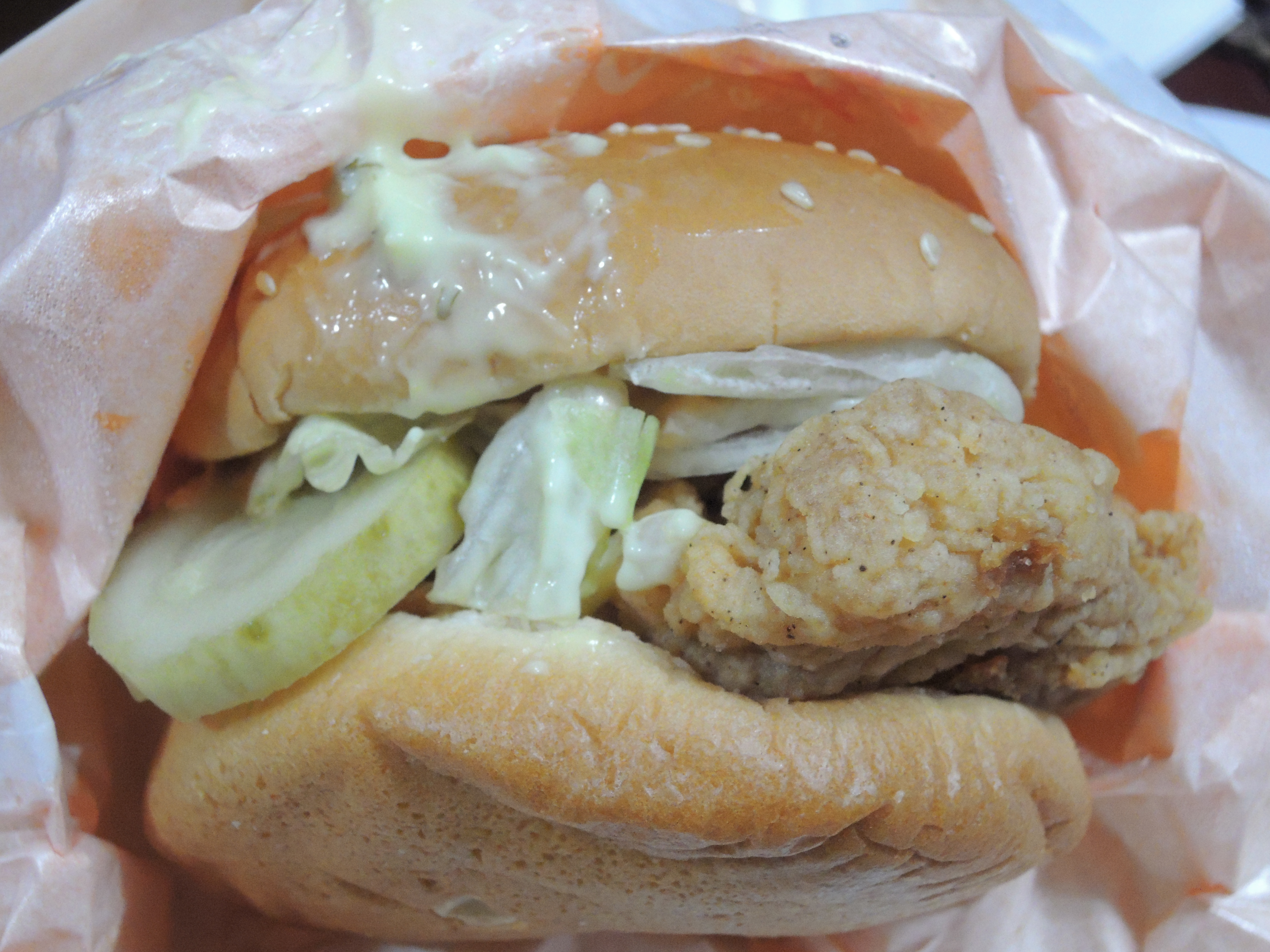 버거입니다. 피클과 양상추, 패티가 보이네요. 가져오다가 흔들렸는지 소스가 살짝 나온 모습입니다.