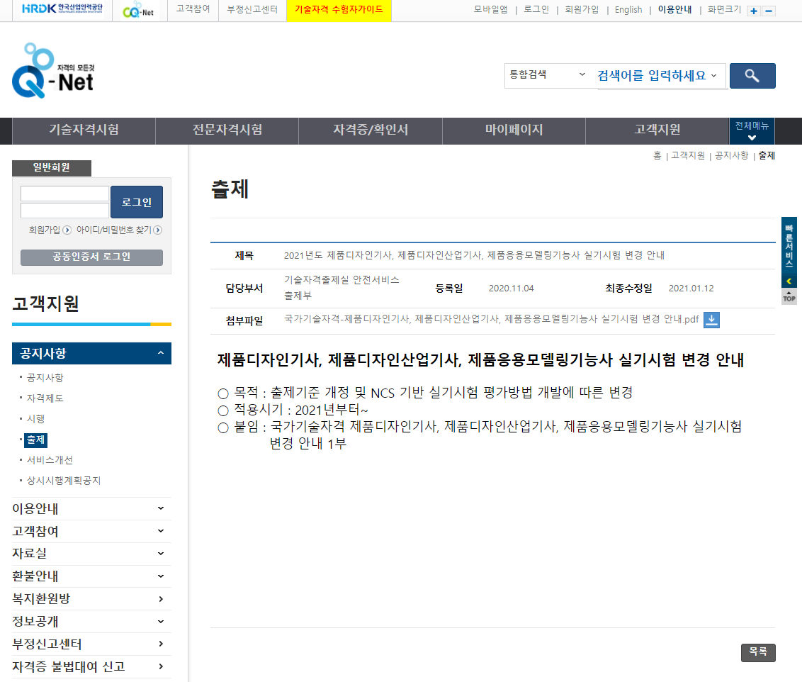 큐넷 홈페이지 공지사항에 제품디자인 관련 자격증 실기시험 변경 안내 공지가 올라왔어요.