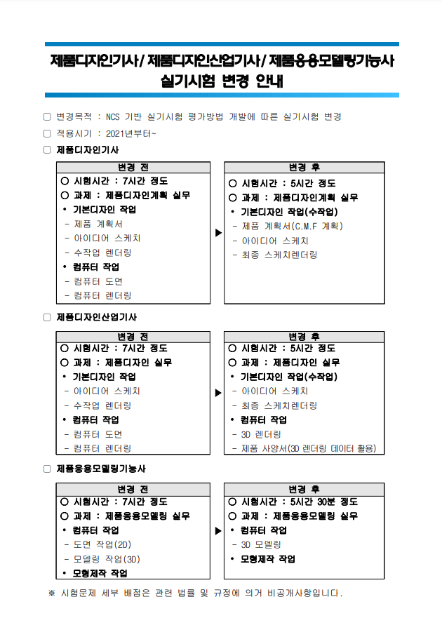 바뀐 내용은, 제품디자인기사의 경우, 컴퓨터 작업이 빠지고, 제품계획서에 C.M.F 계획이 추가되었어요.