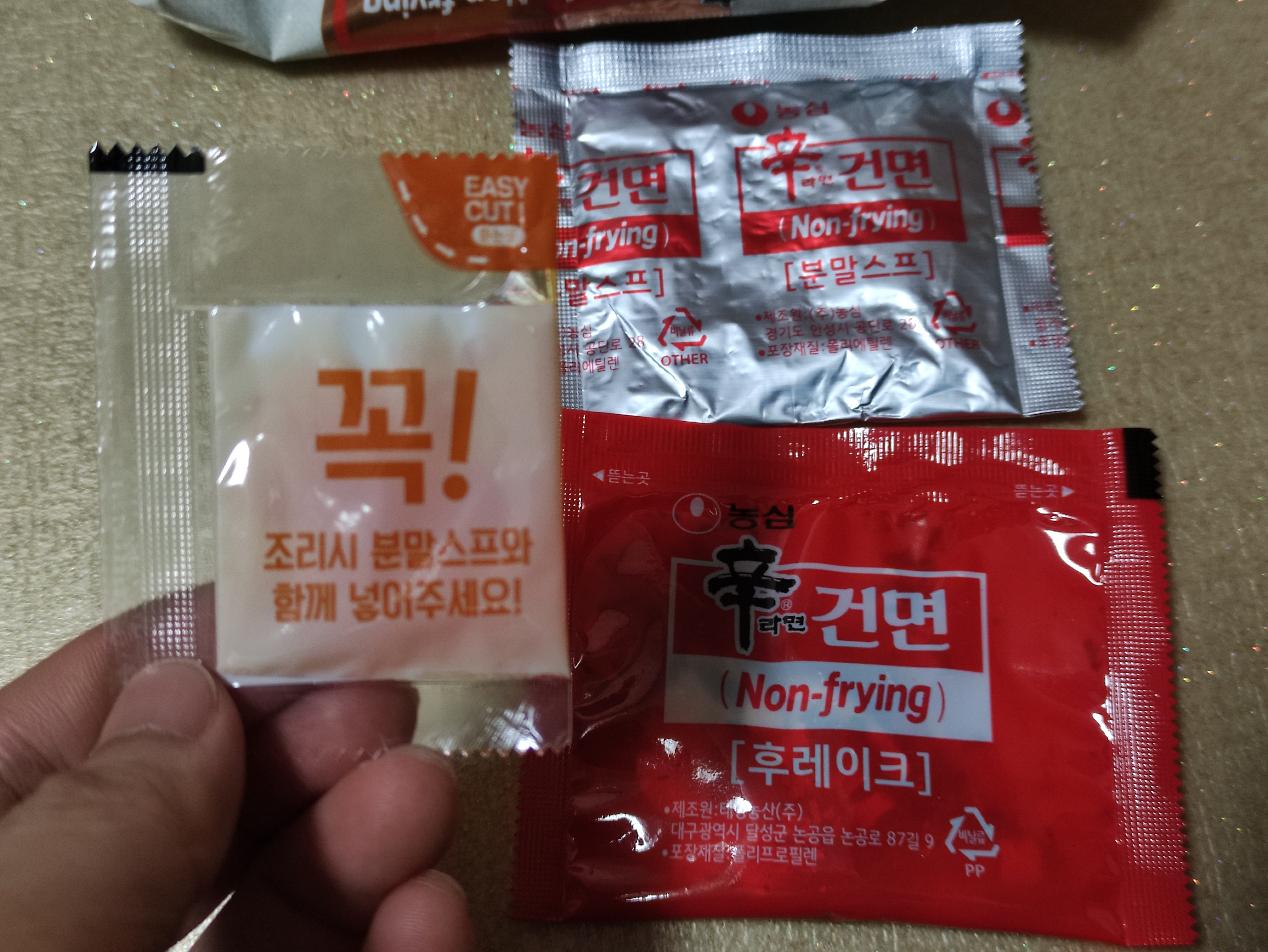포장을 열면 건면, 후레이크, 분말소스, 그리고 소스가 하나 더 들어있어요.