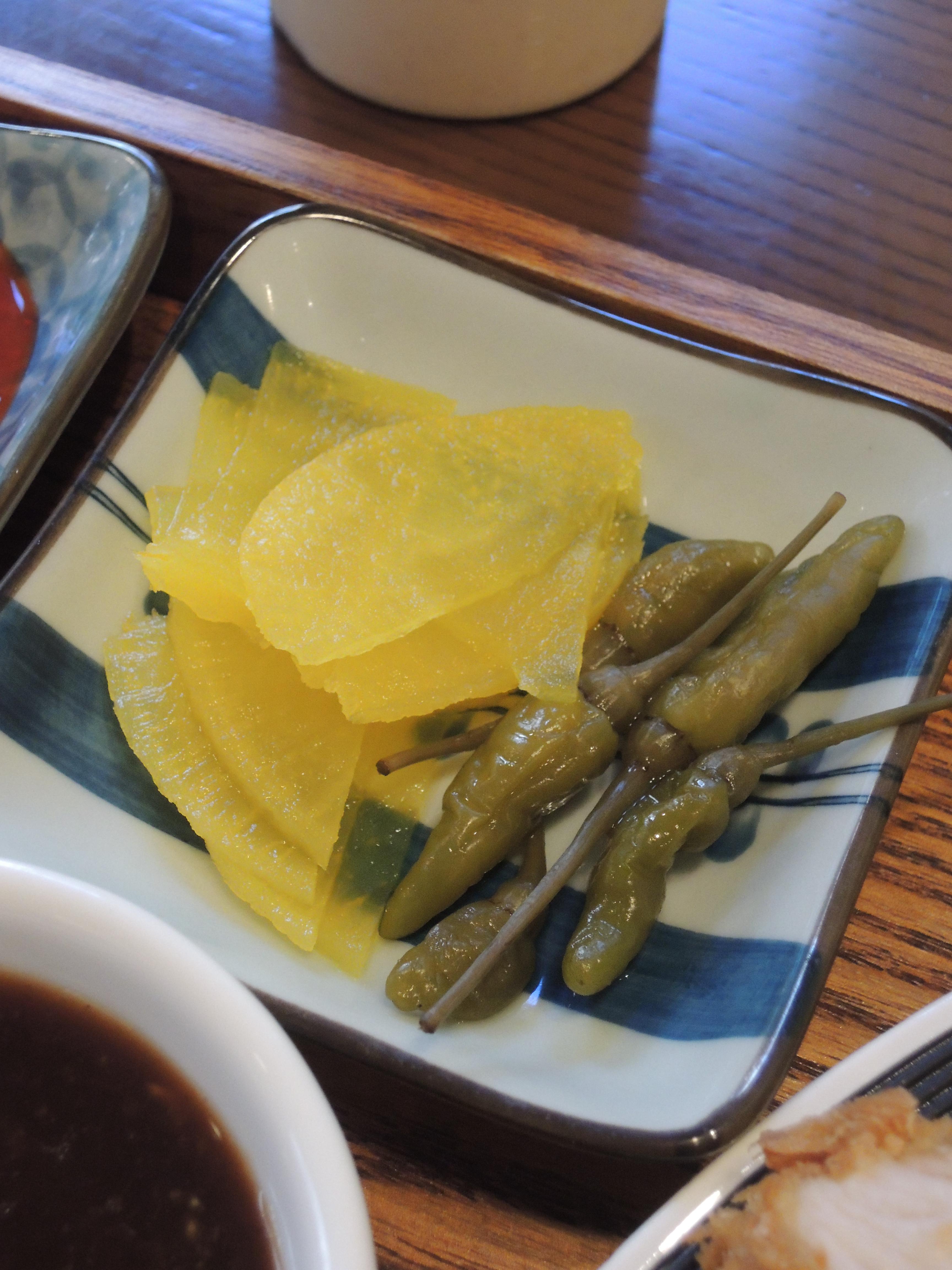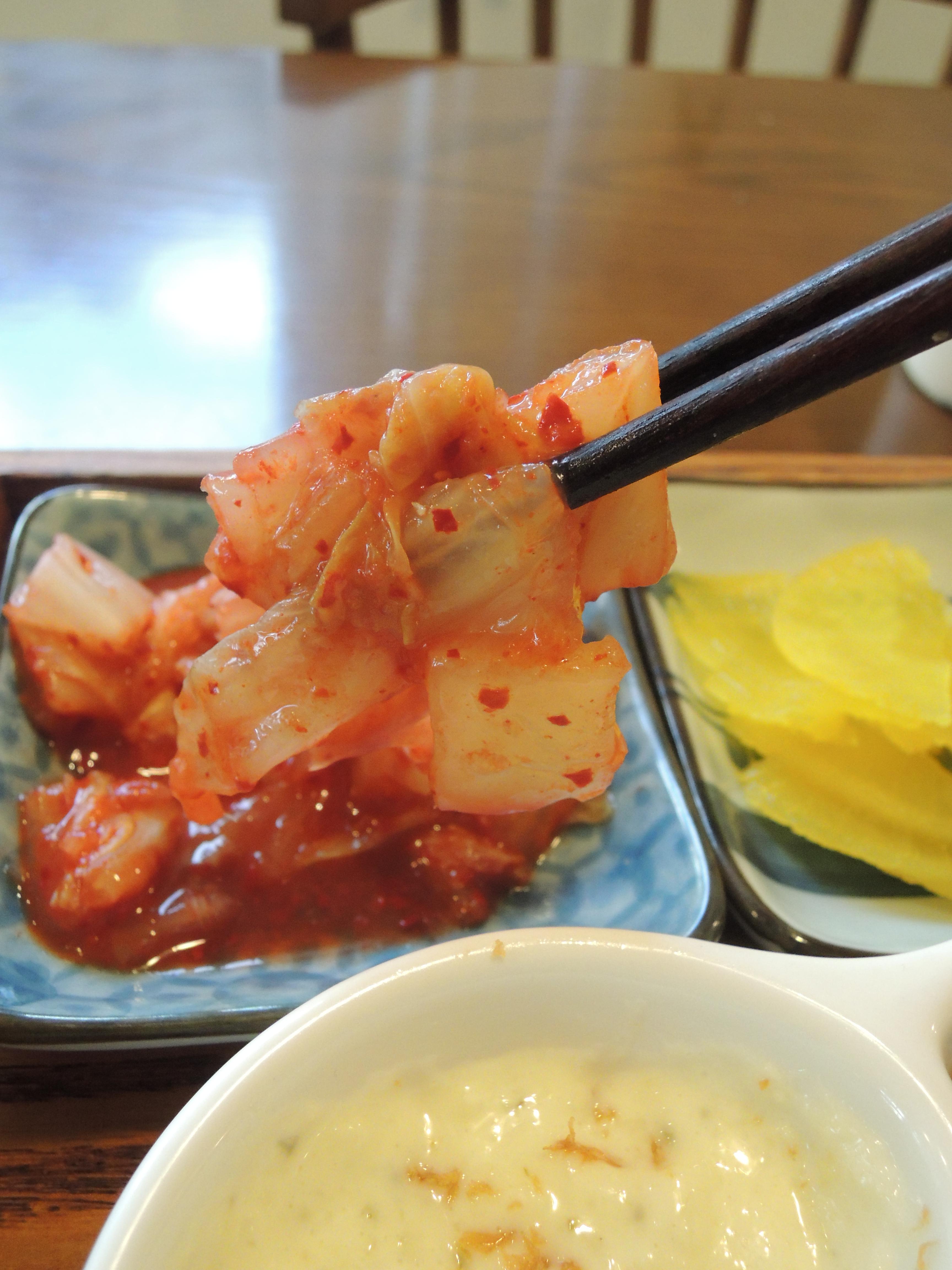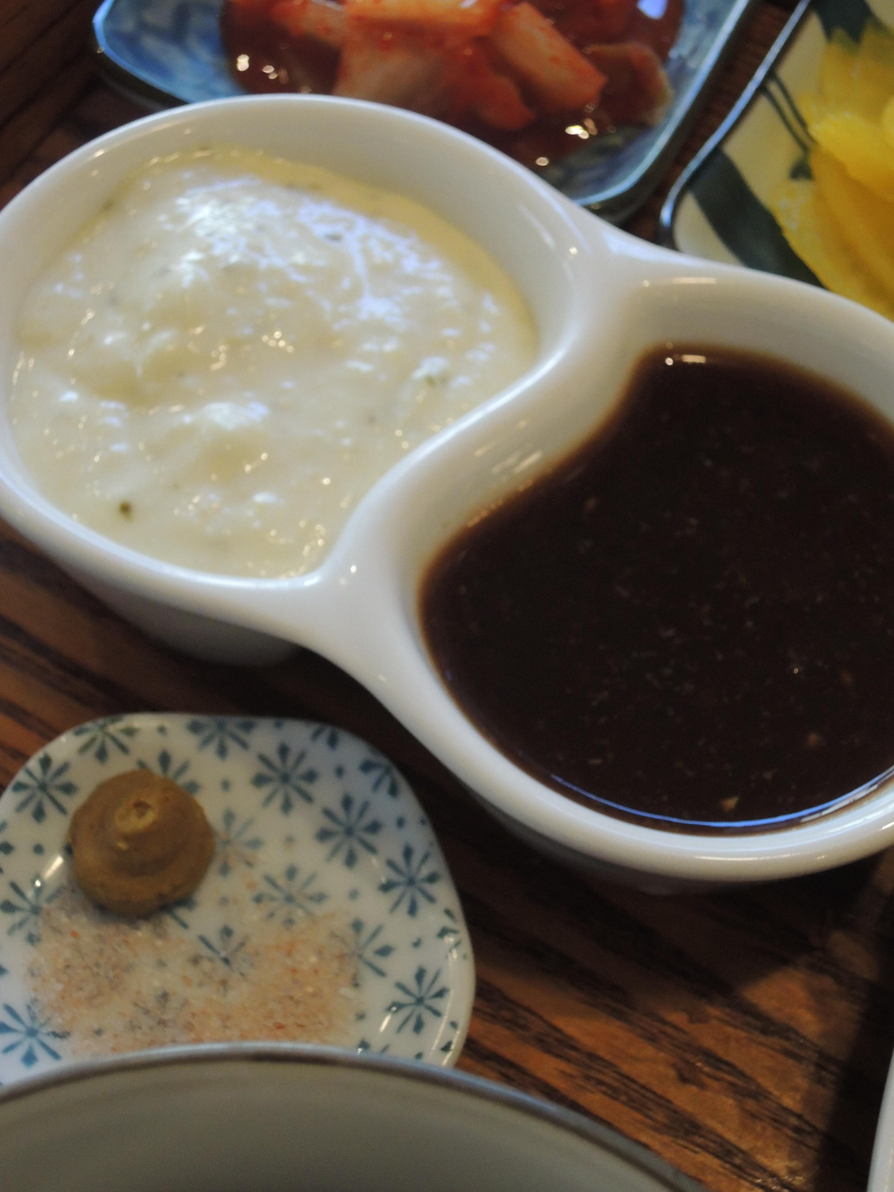 김치와 단무지, 밥, 국이 나오고, 소스는 돈카츠소스, 생선카츠소스 이렇게 두종류와 소금이 나와요.