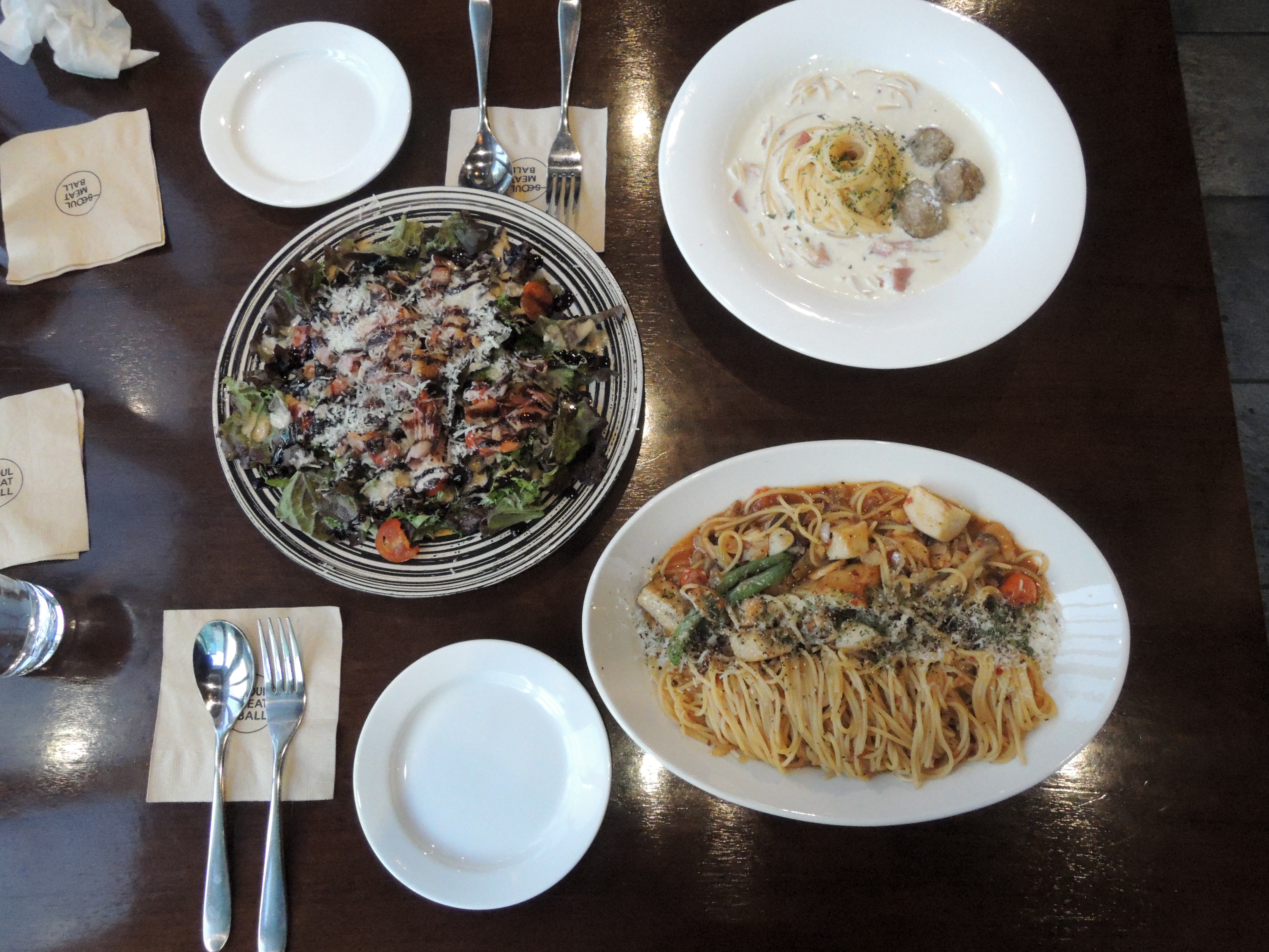 저는 요즘 핫한 엔초비파스타랑 서울크리미파스타+미트볼, 그리고 샐러드를 주문했어요.
