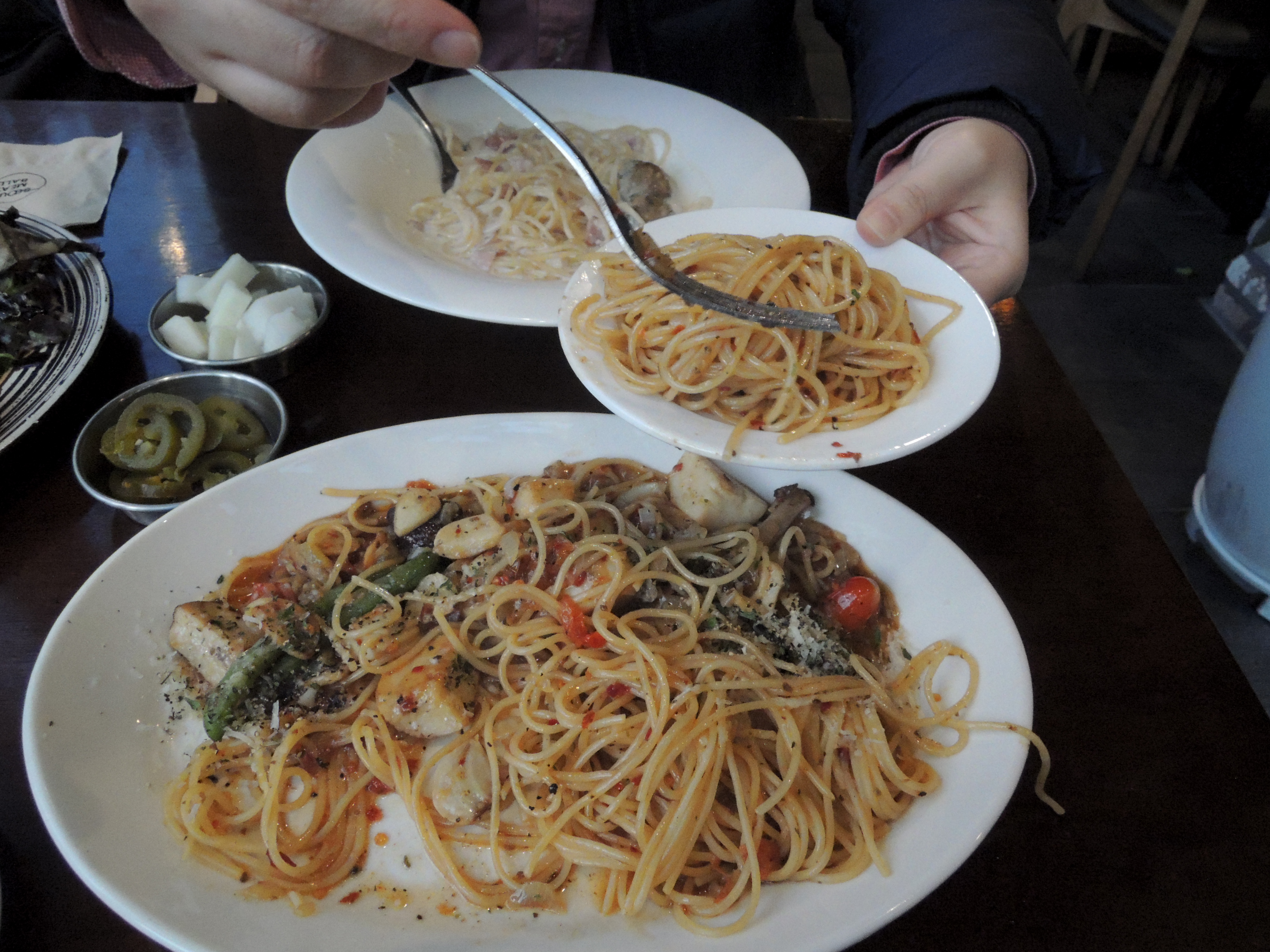 샐러드와 엔초비파스타, 크림파스타+미트볼 구성이에요. ㅎ