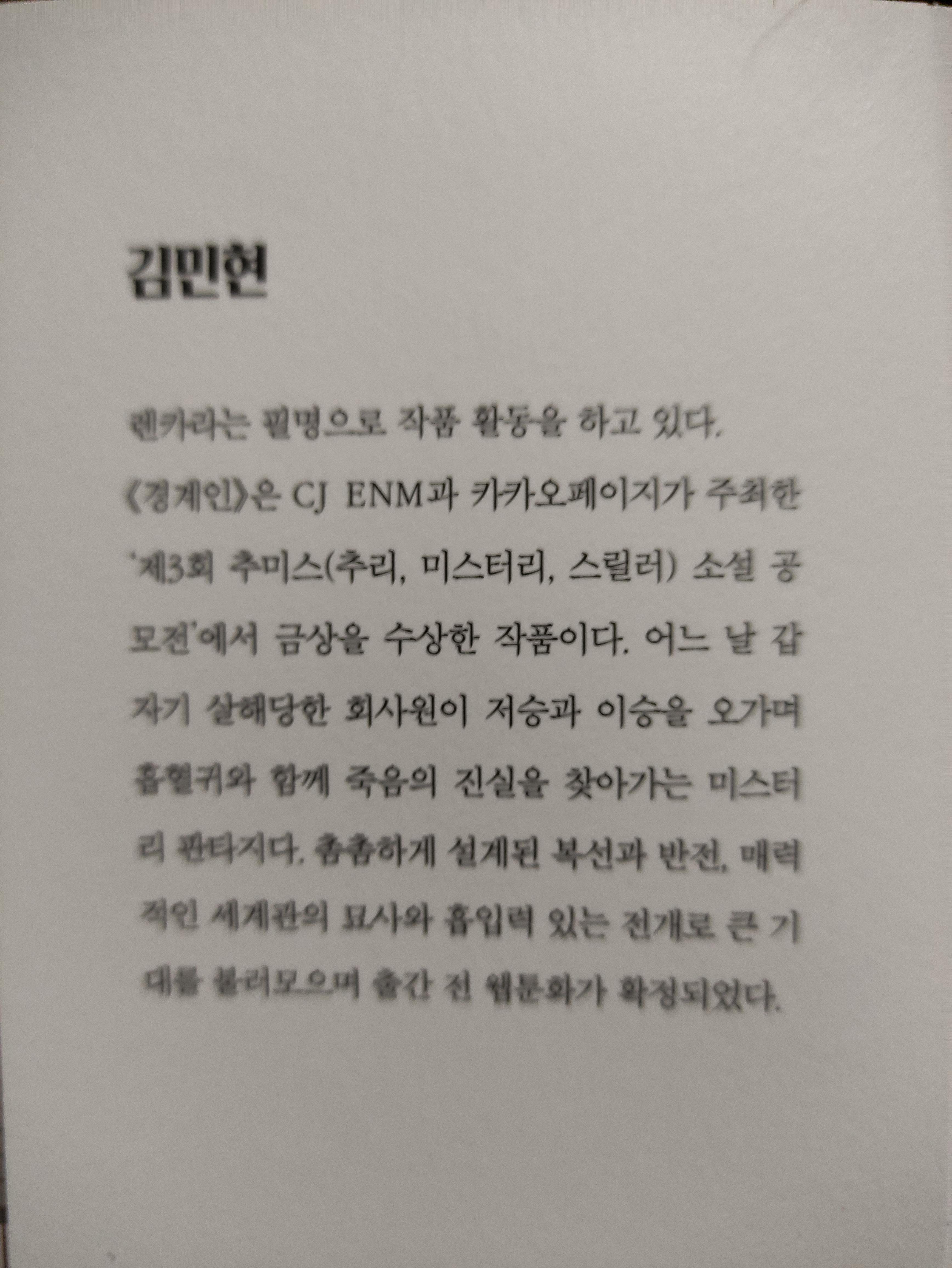 경계인은 카카오페이지와 씨제이에서 주최한 소설공모전에서 금상을 수상한 작품이래요. 미스터리판타지장르이고 곧 웹툰으로도 나온다고 합니다.
