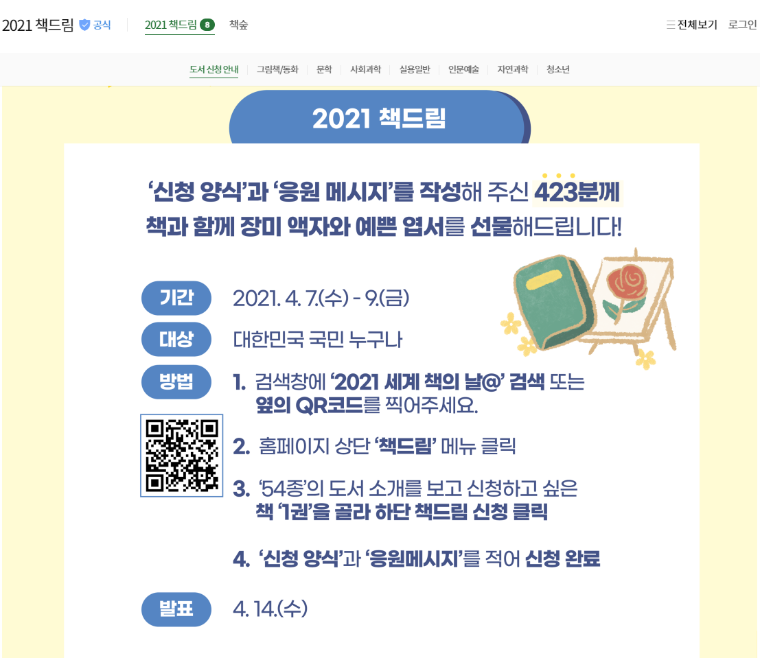 신청양식과 응원메시지를 작성하면 423명을 추첨해야 책과 함께 장미 액자와 예쁜 엽서를 받을 수 있는 행사에요.