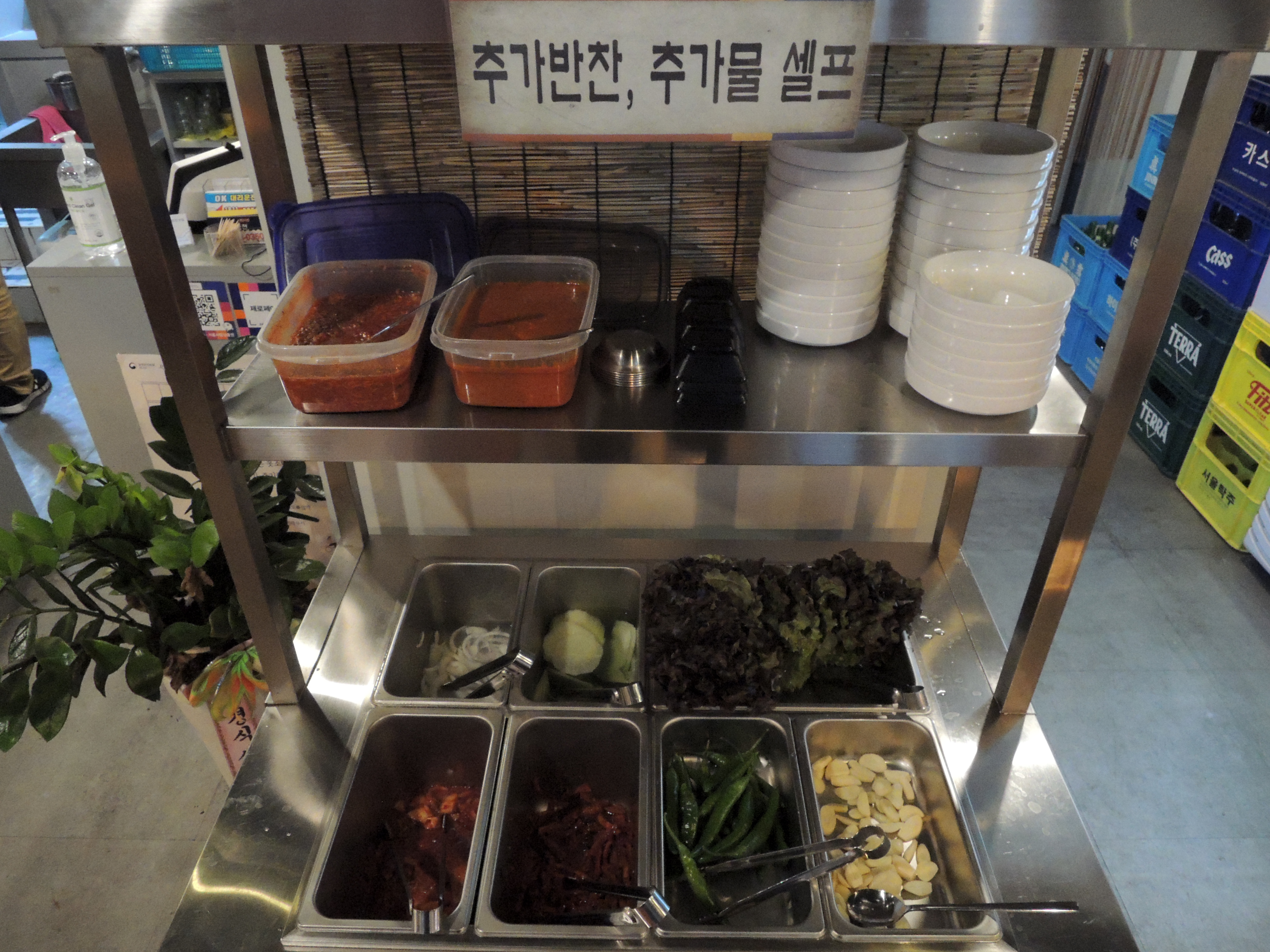 매장은 적당히 넓은 편이고, 추가반찬을 덜을 수 있게 셀프바가 준비되어 있어요.