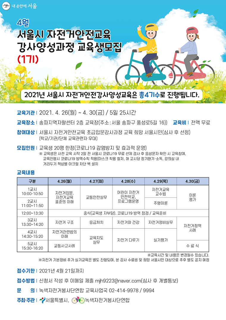 자전거 운전능력 인증제는 올 6월부터 도입될 예정이며, 4월인 현재는 자전거 안전교육 강사 양성과정 교육생을 모집하고 있어요.