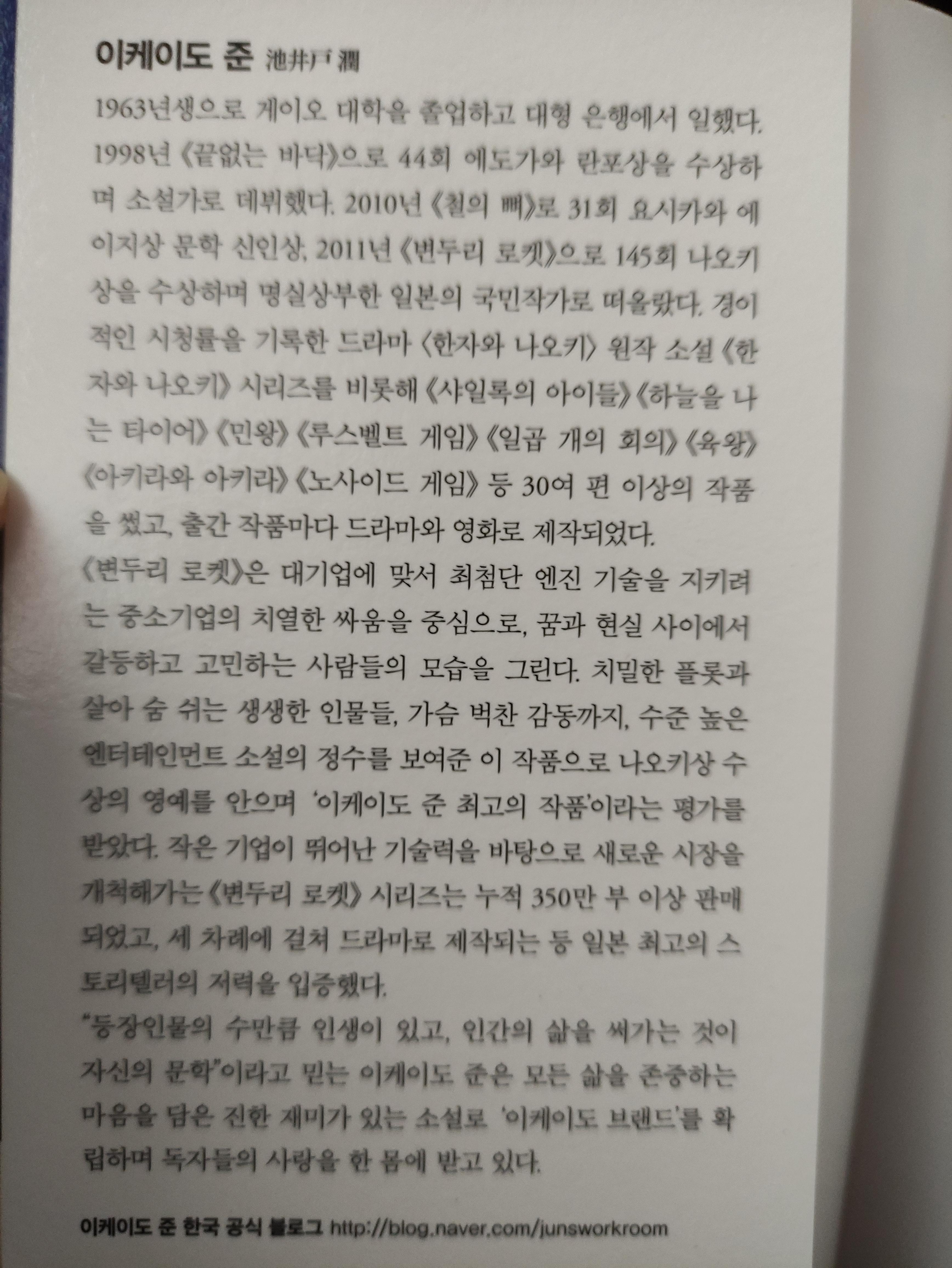 변두리로켓은 한자와 나오키 시리즈로 유명한 이케이도준이 한자와 나오키 전에 쓴 소설로 2011년 145회 나오키상 수상작입니다. 나오키상은 일본에서 손꼽히는 소설에게 주어지는 큰 문학상이죠.