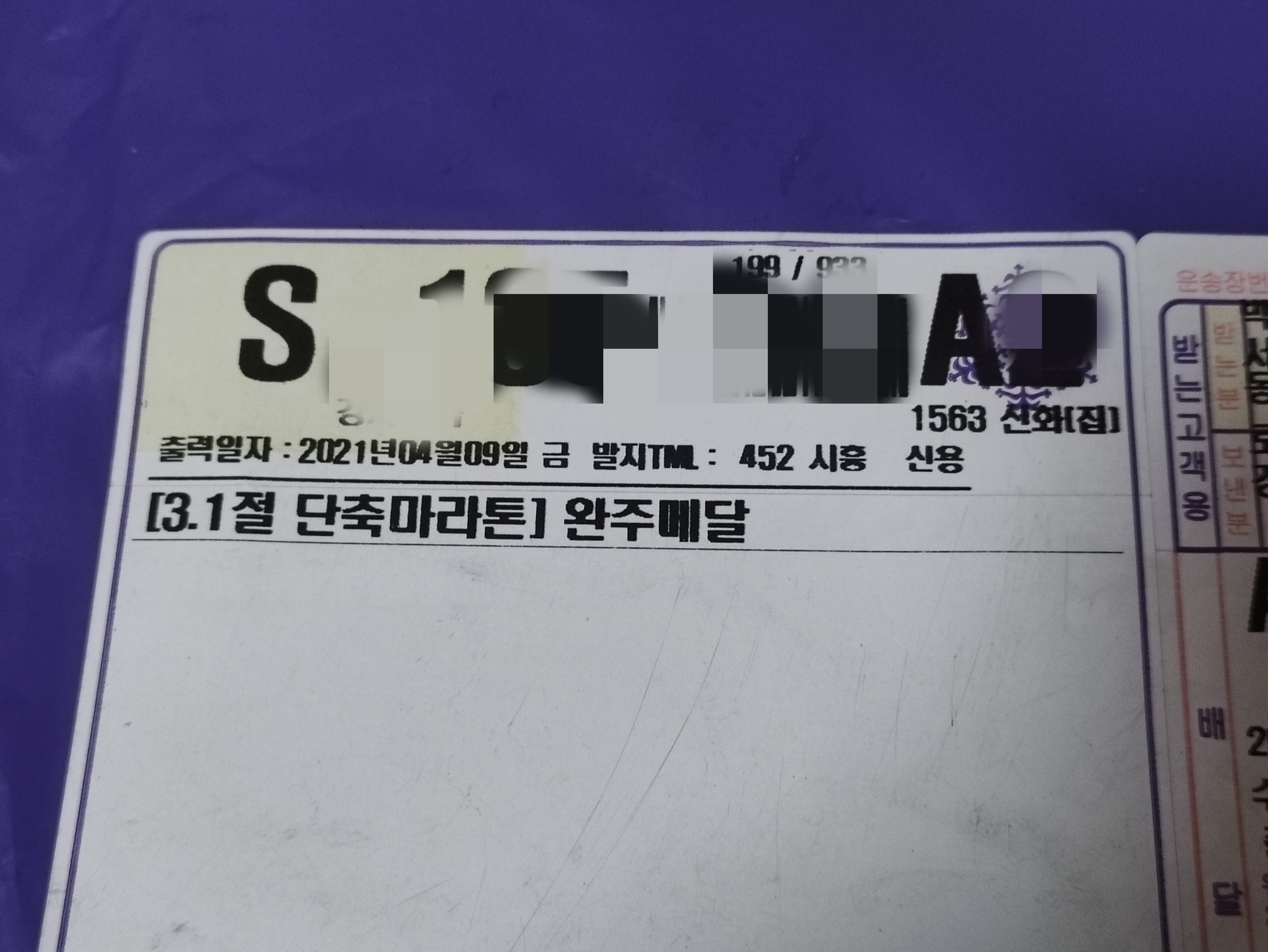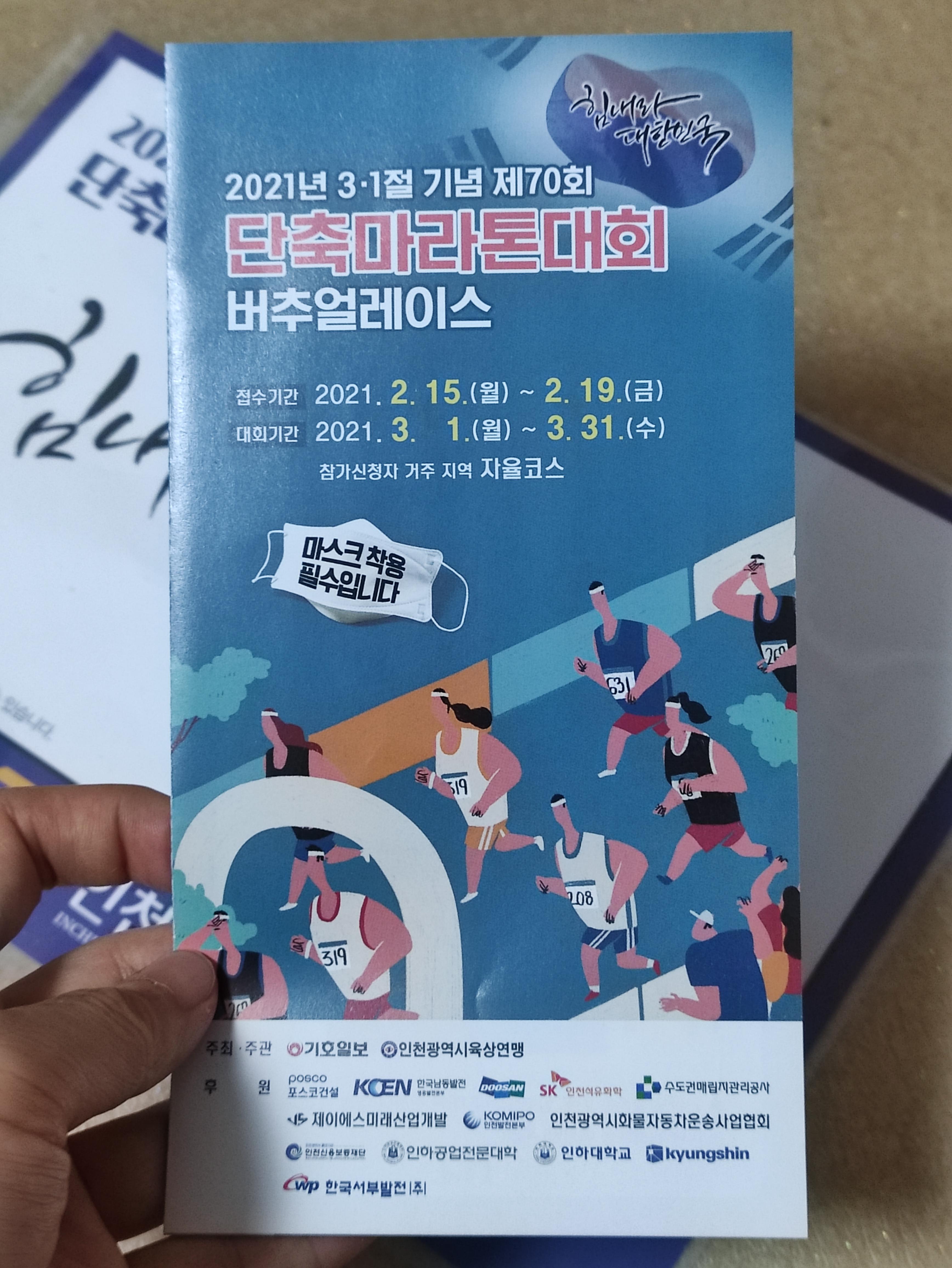 2021년 3.1절 단축마라톤 언택트마라톤기록 업로드 후 완주메달이 도착했어요.