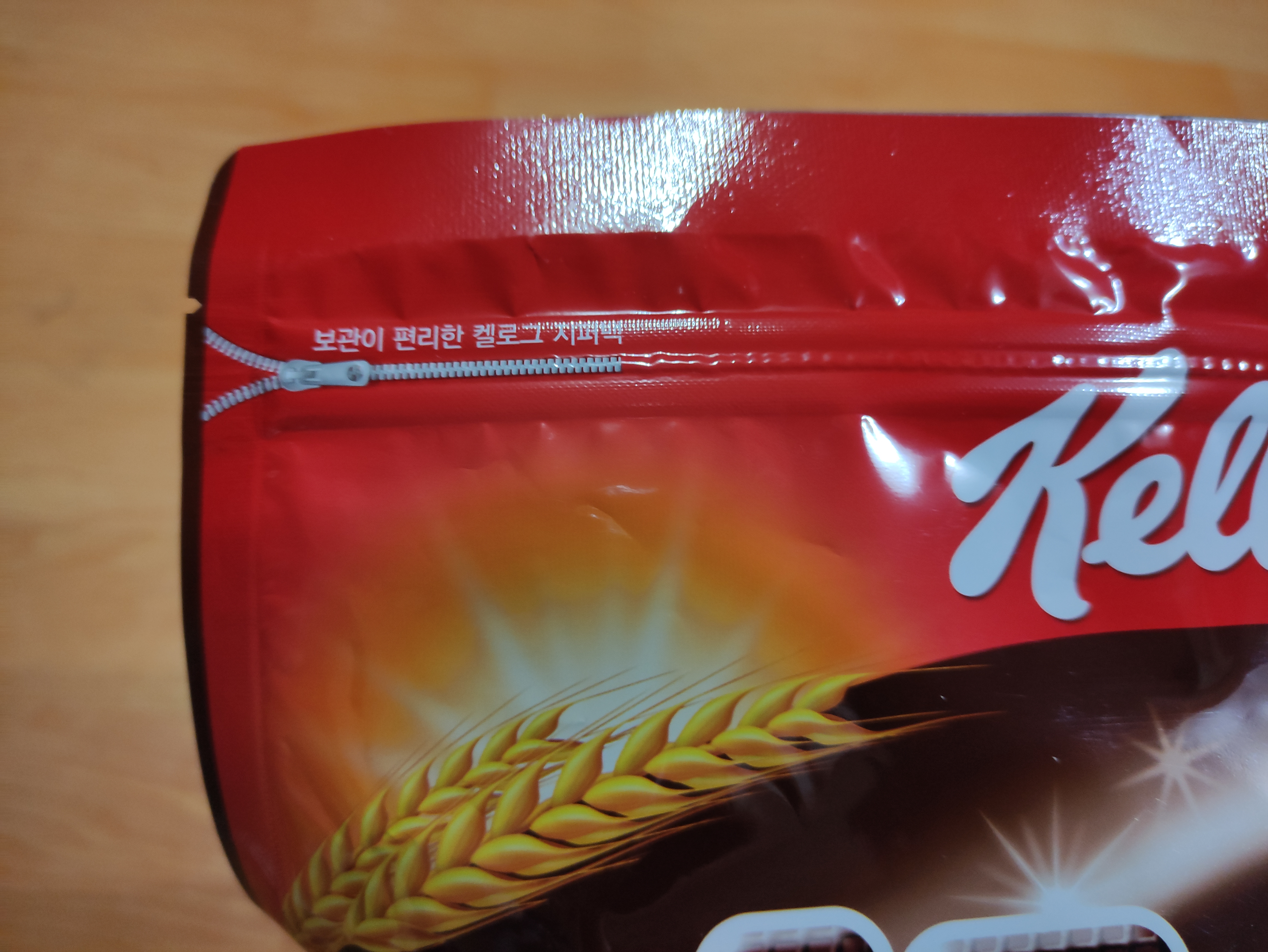 오곡으로 만든 첵스초코에요. 비닐백에 담겨있으며 지퍼백형태라 먹고나서도 남은 첵스를 보관하기 편해요.