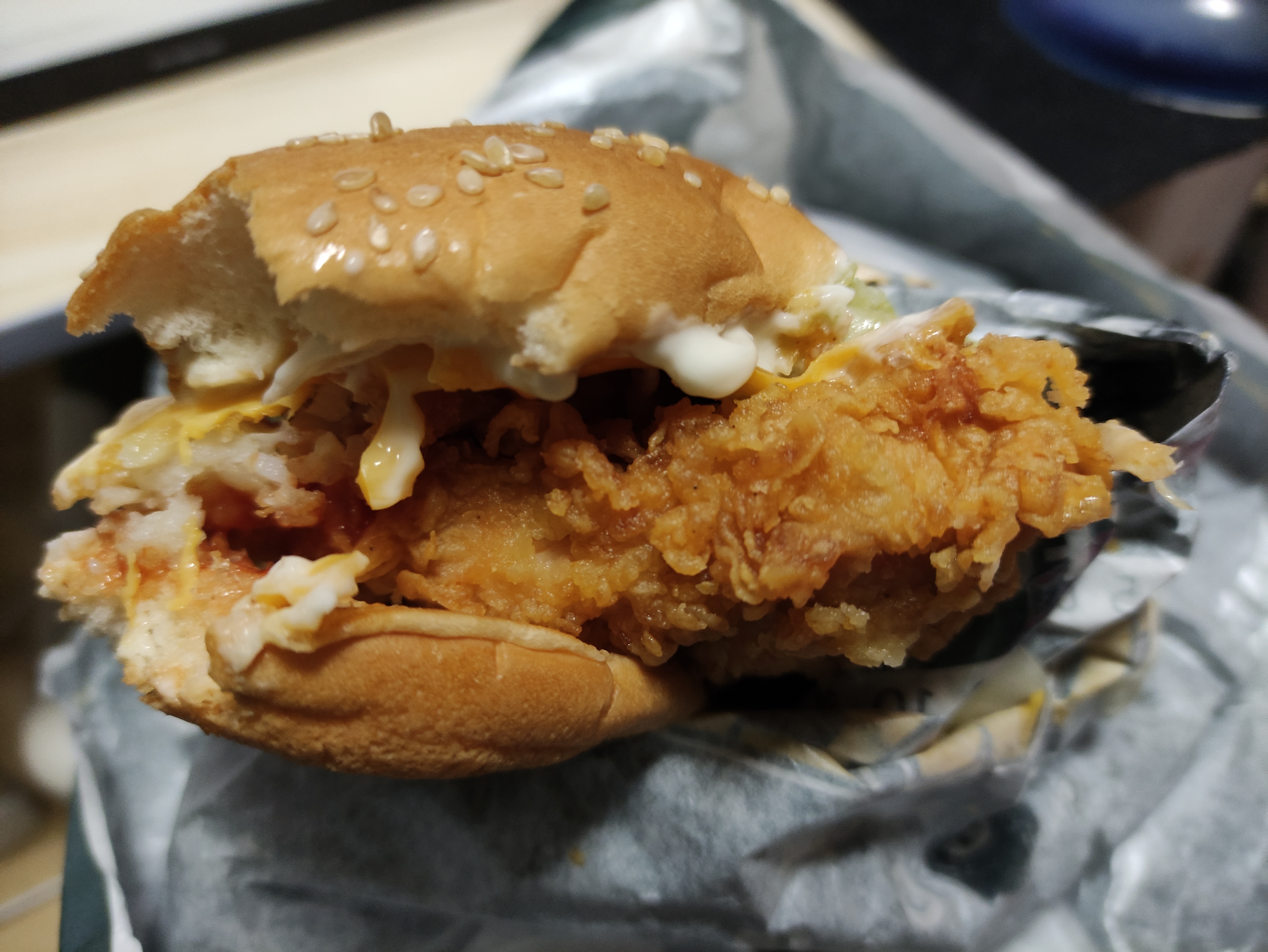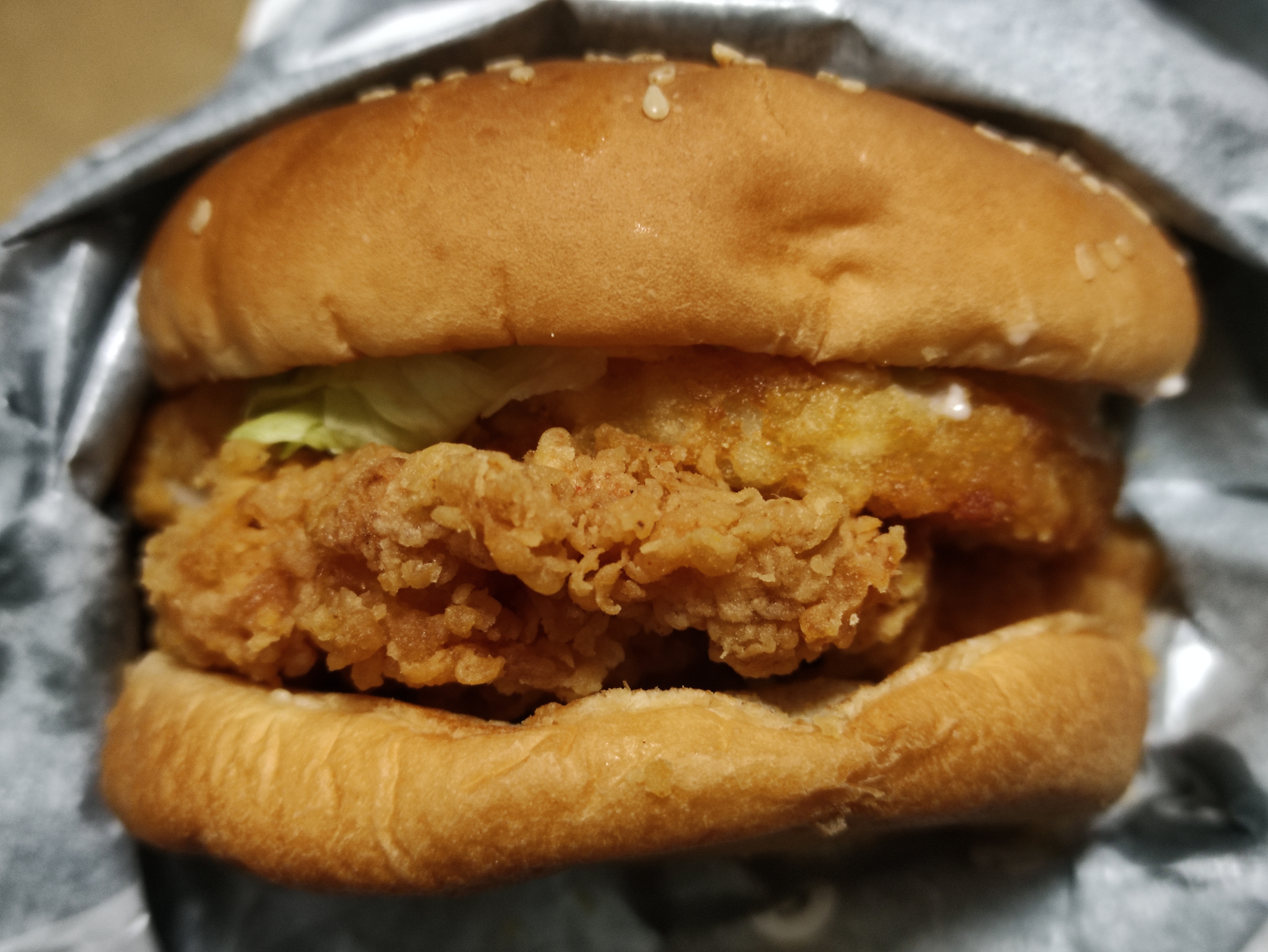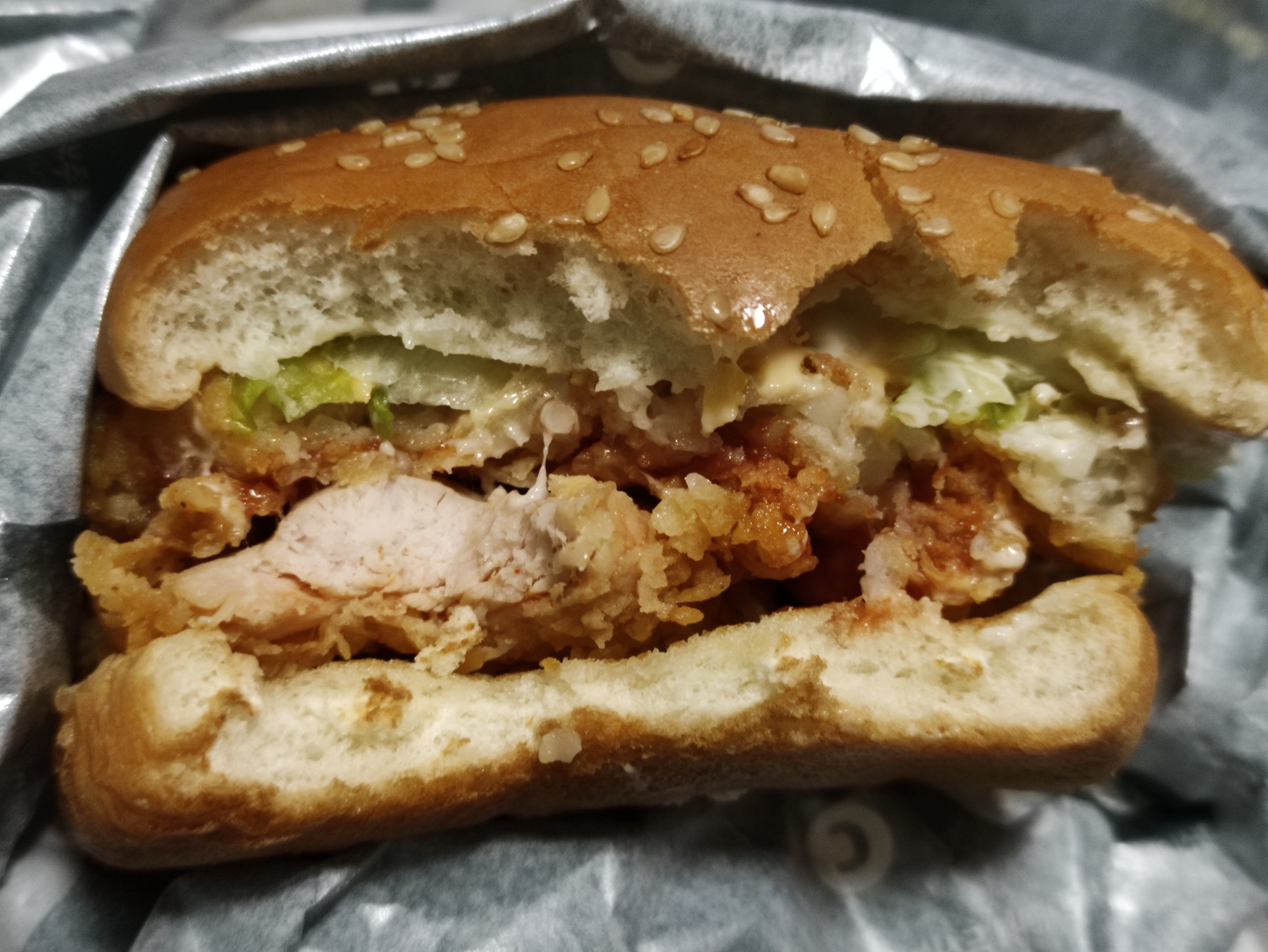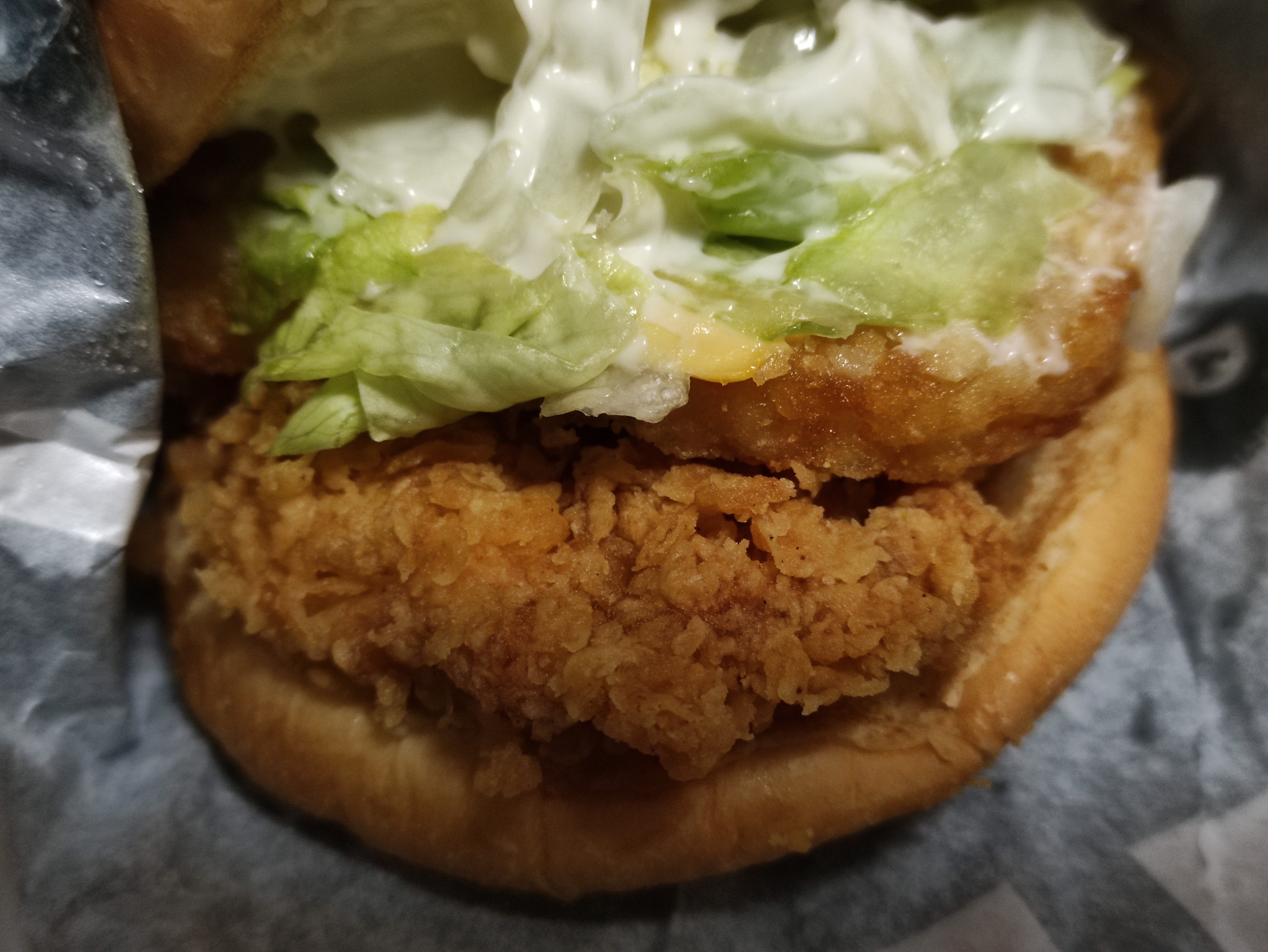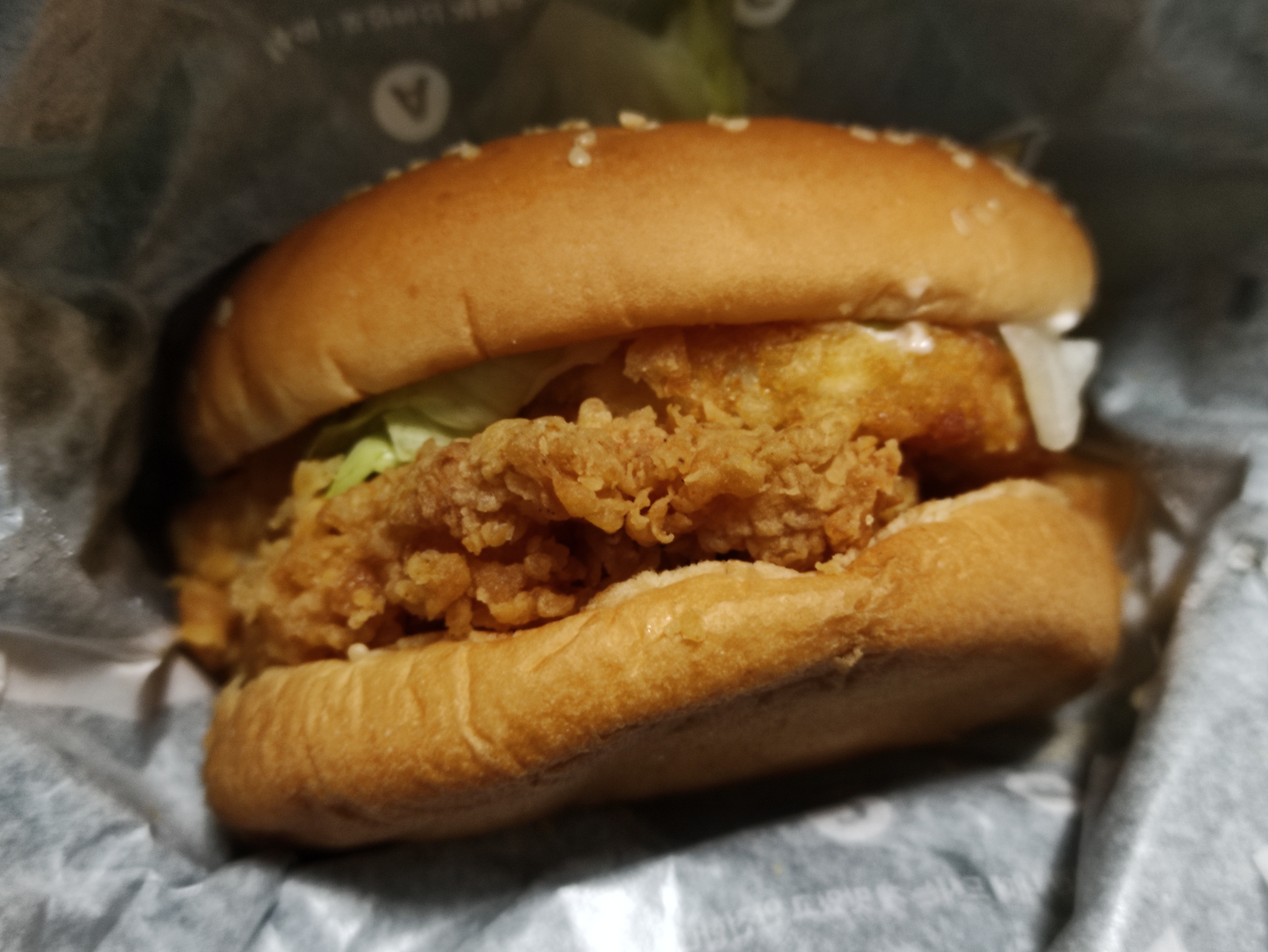 패티가 좀 작은가싶어서 뒷쪽을보니 닭가슴살패티가 이렇게 버거밖으로 살짝 나와있네요. 징거버거와 더불어 패티가 큼지막하게 잘나오는거같아요.