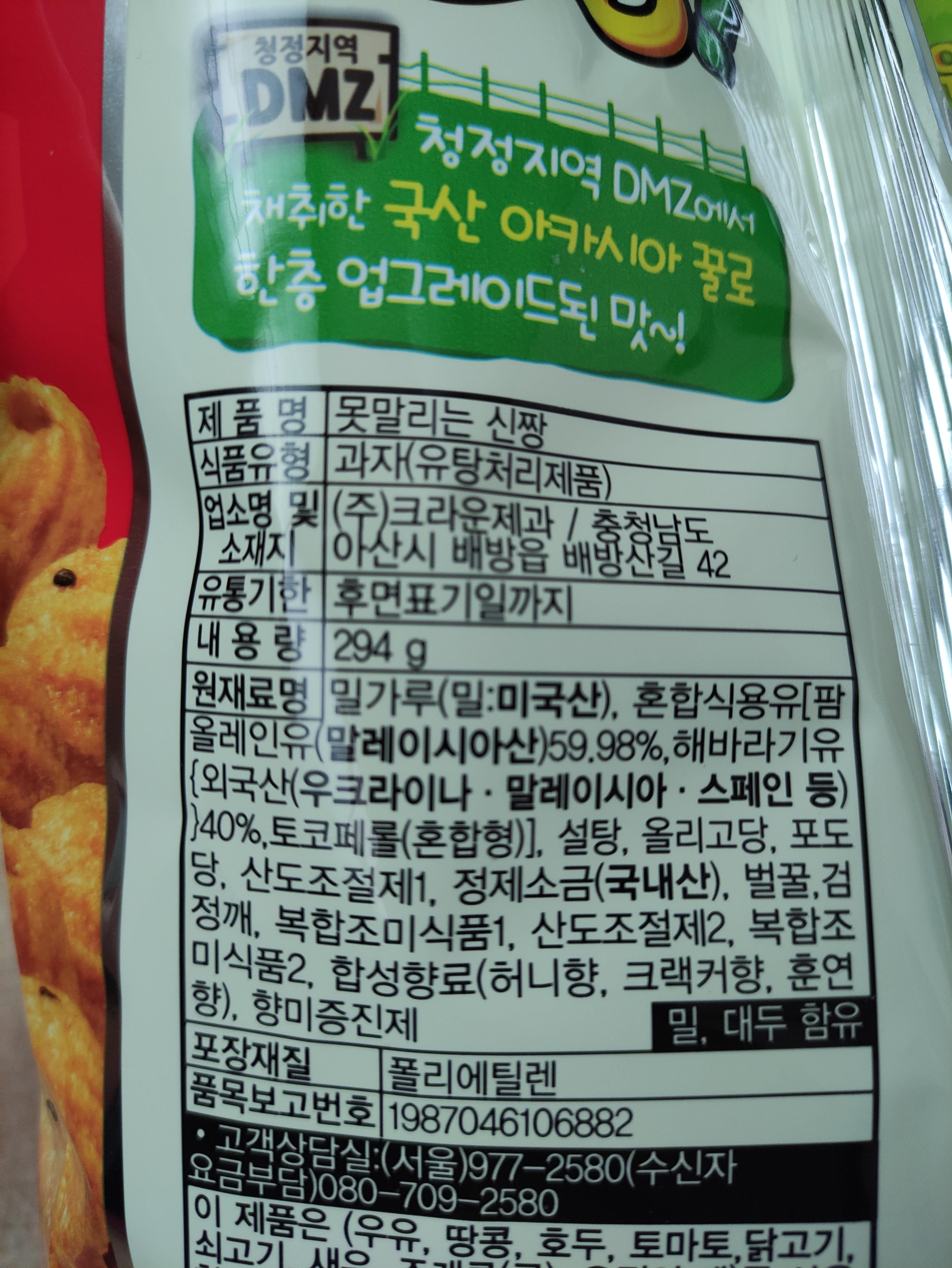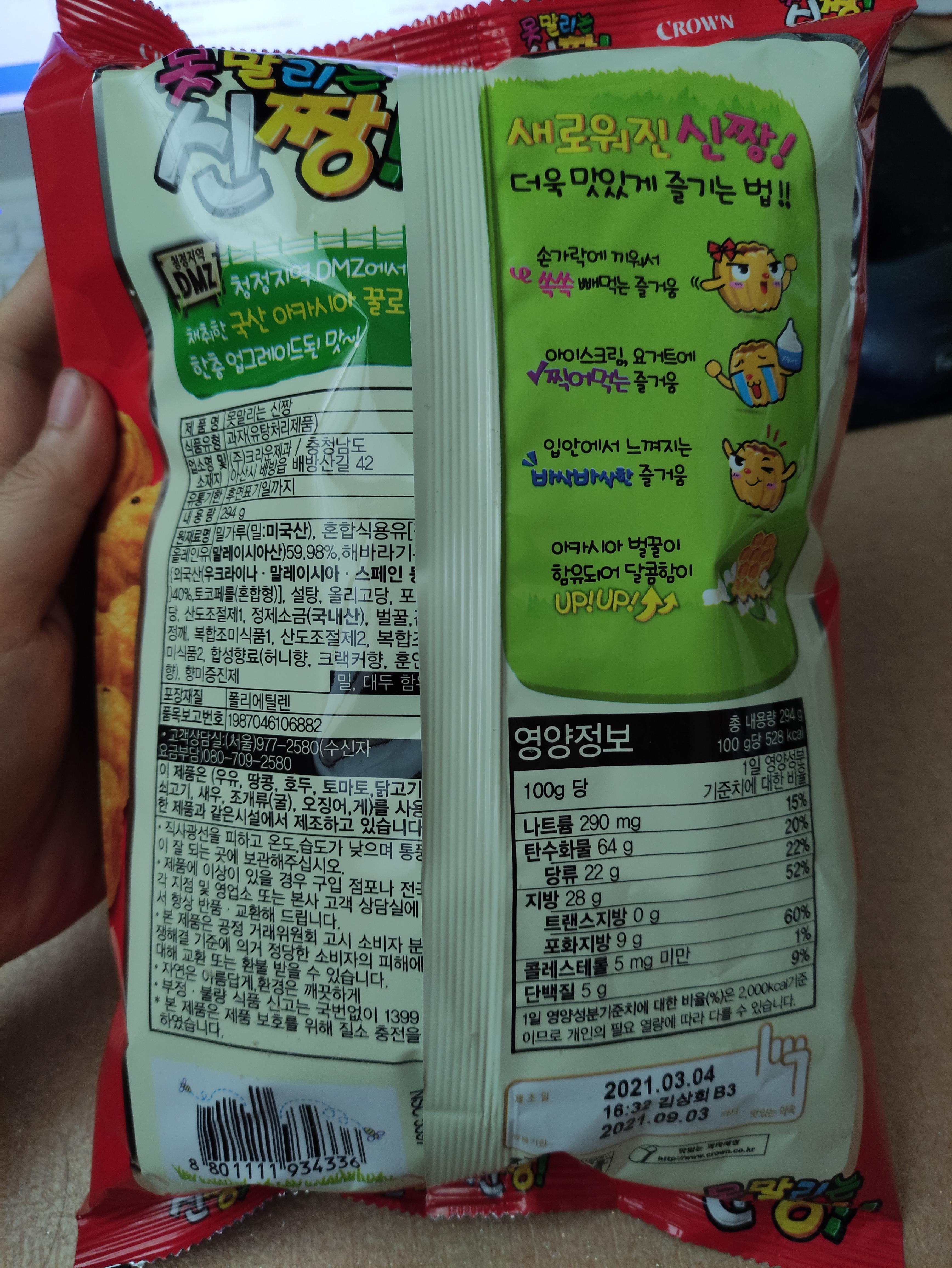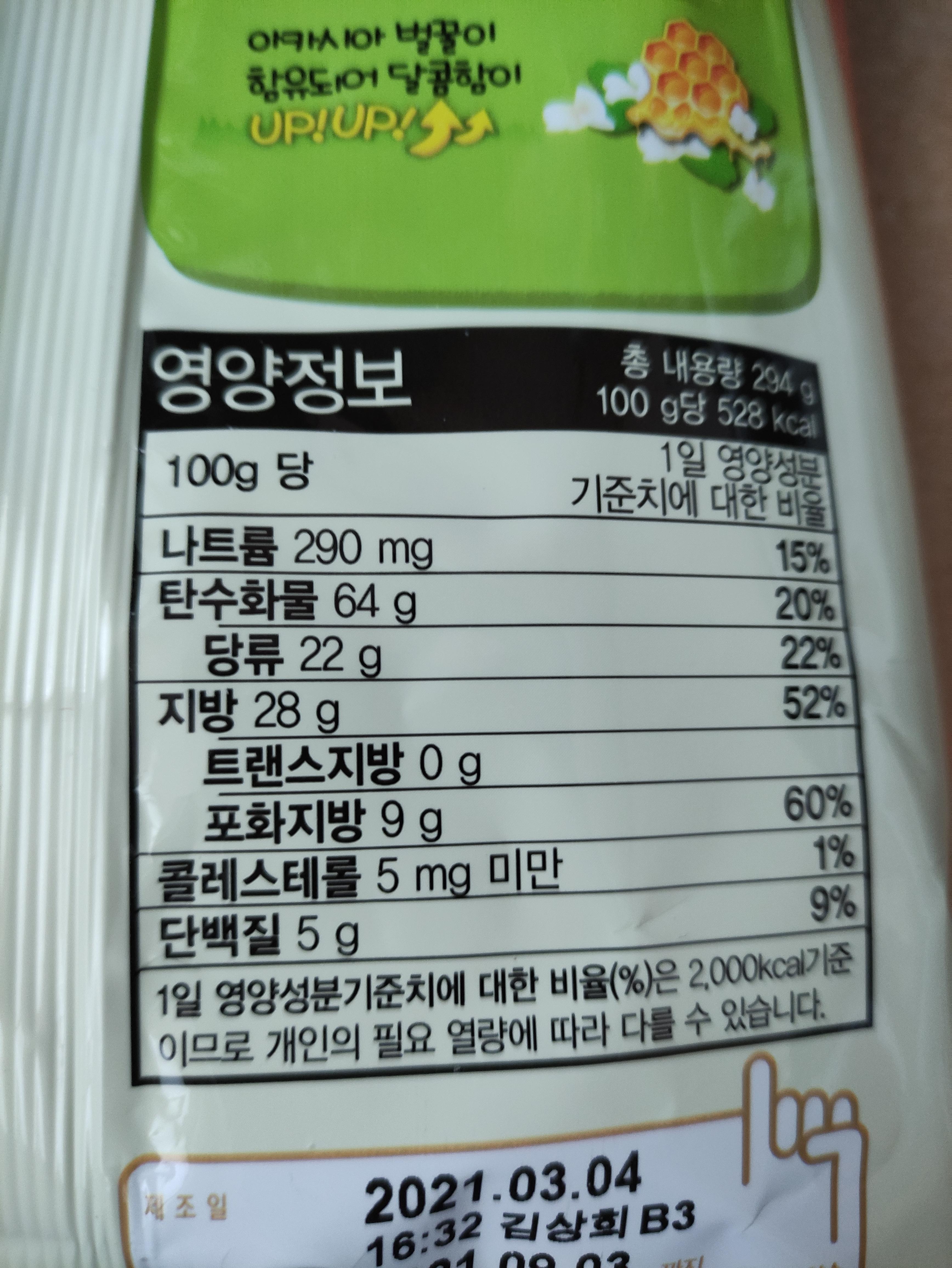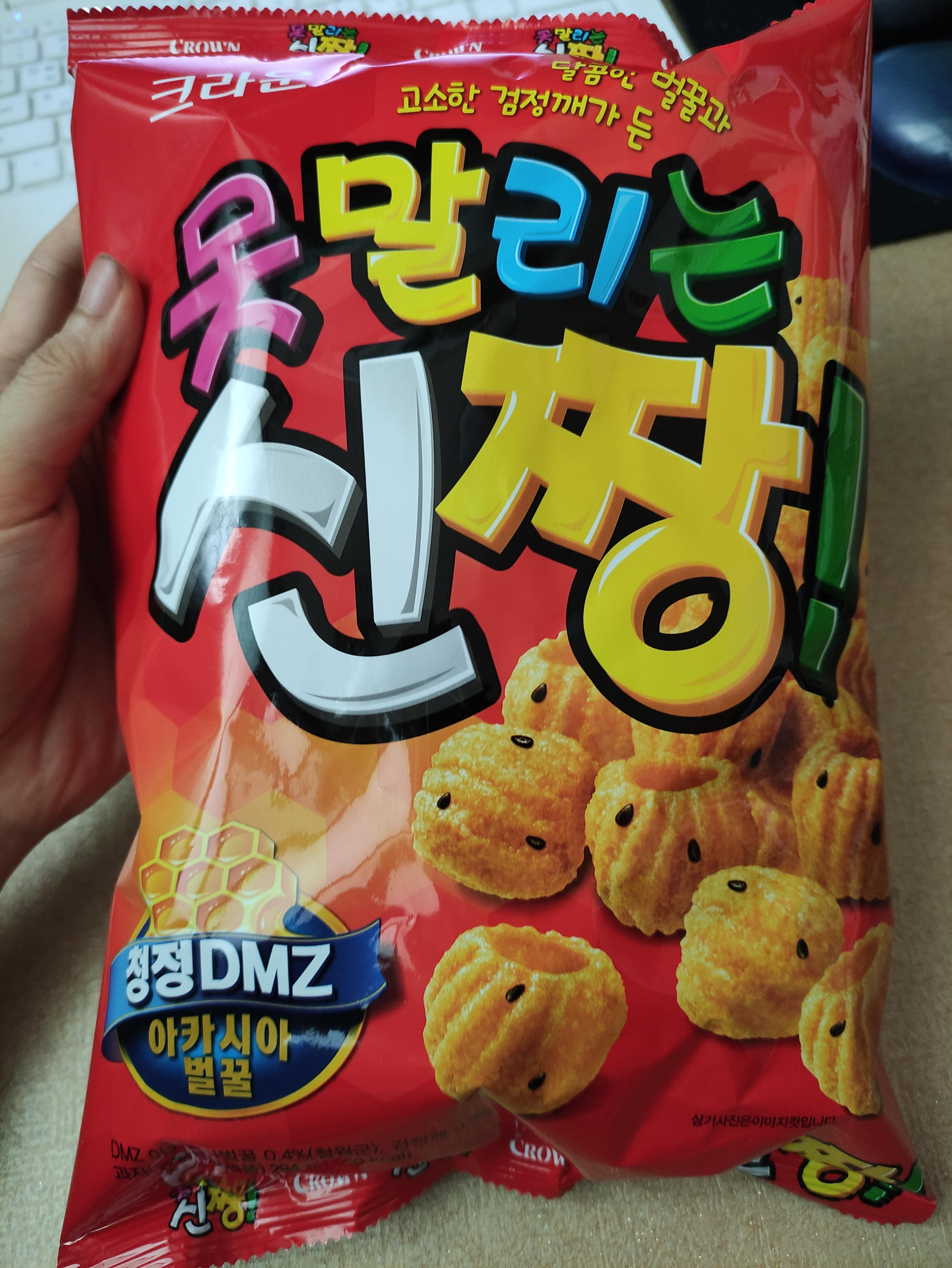 달콤한 벌꿀과 고소한 검정깨가 들어있는 못말리는 신짱이에요. 옛날에는 짱구캐릭터그림이 그려졌던걸로 기억하는데 요즘 포장지에는 안그려져서 나오네요. 우리가 아는 일본만화 짱구가 아니라 다른 짱구가 나와서 조금 이상했던 기억이 나네요. 대체 왜 이름이 짱구인가에 대해서는 지금도 잘모르겠고 궁금합니다. ㅎㅎ;;