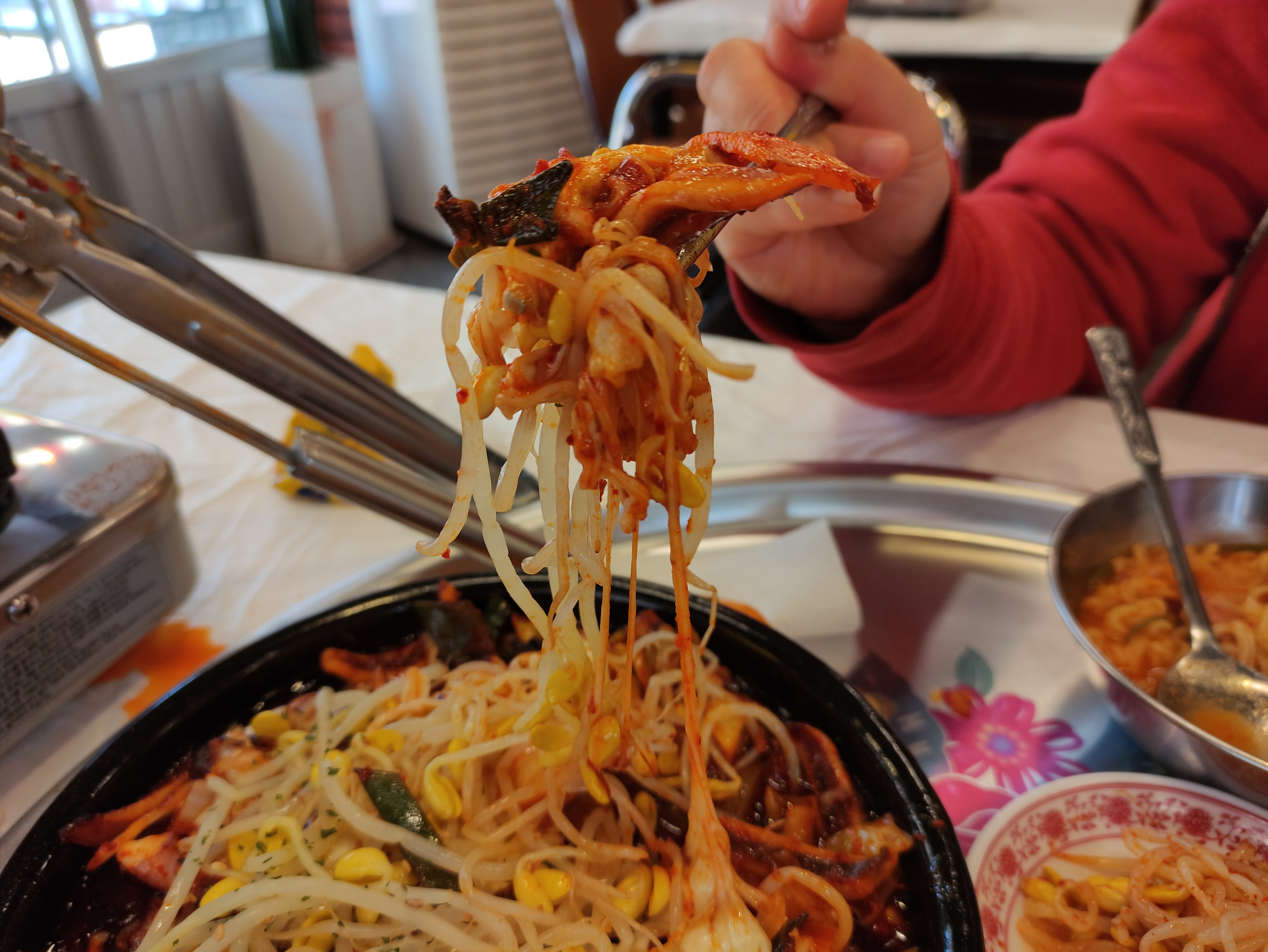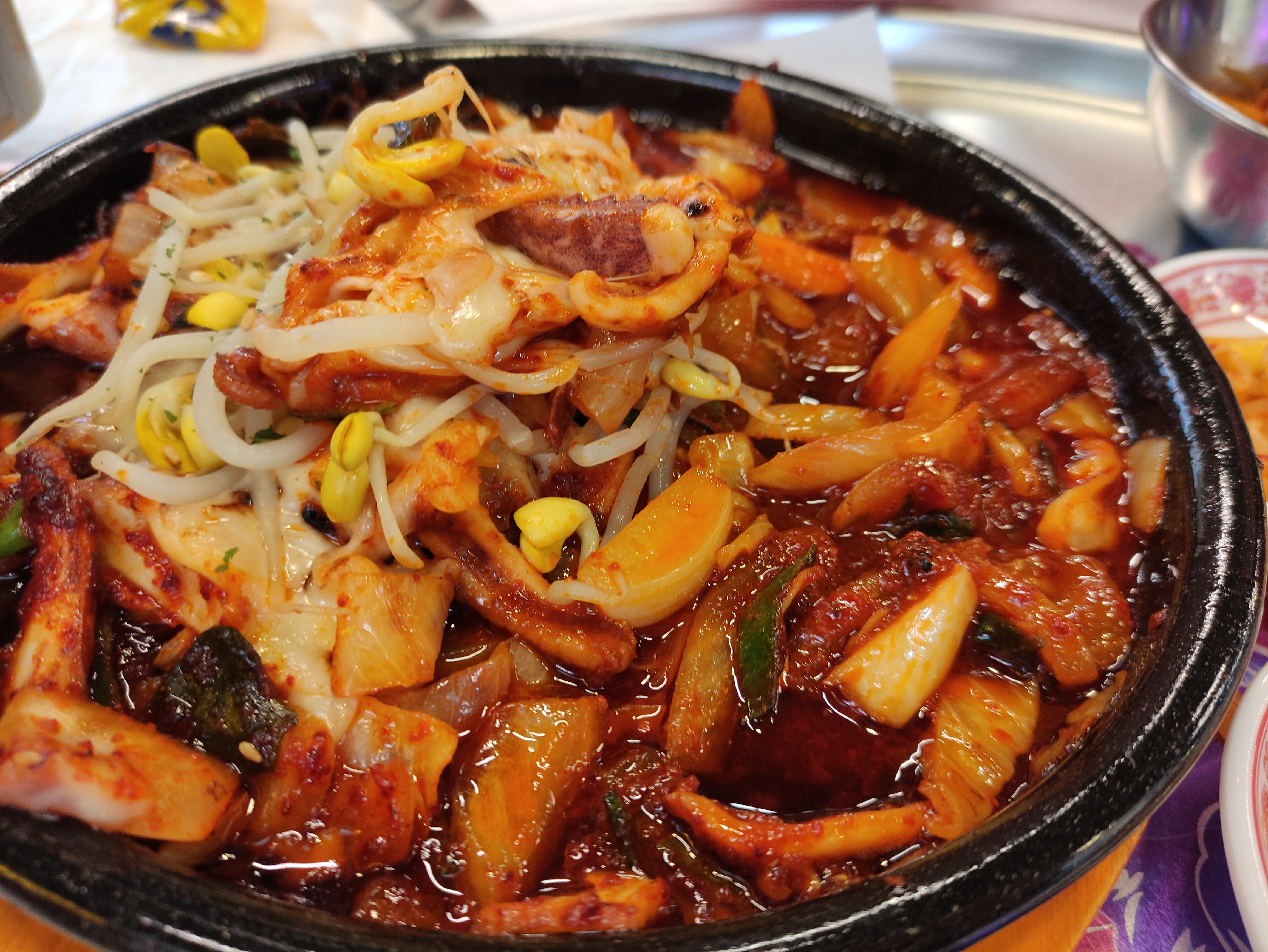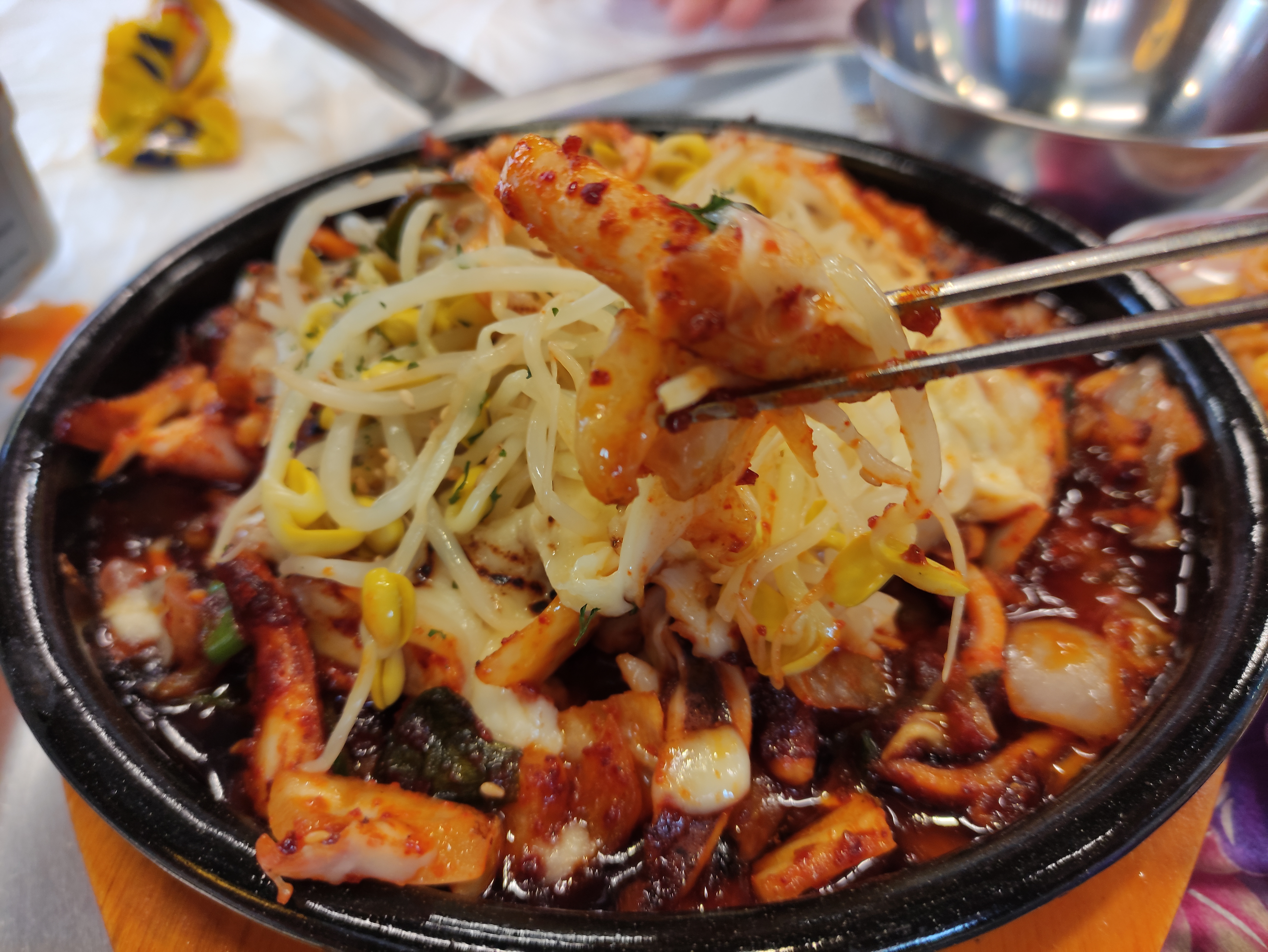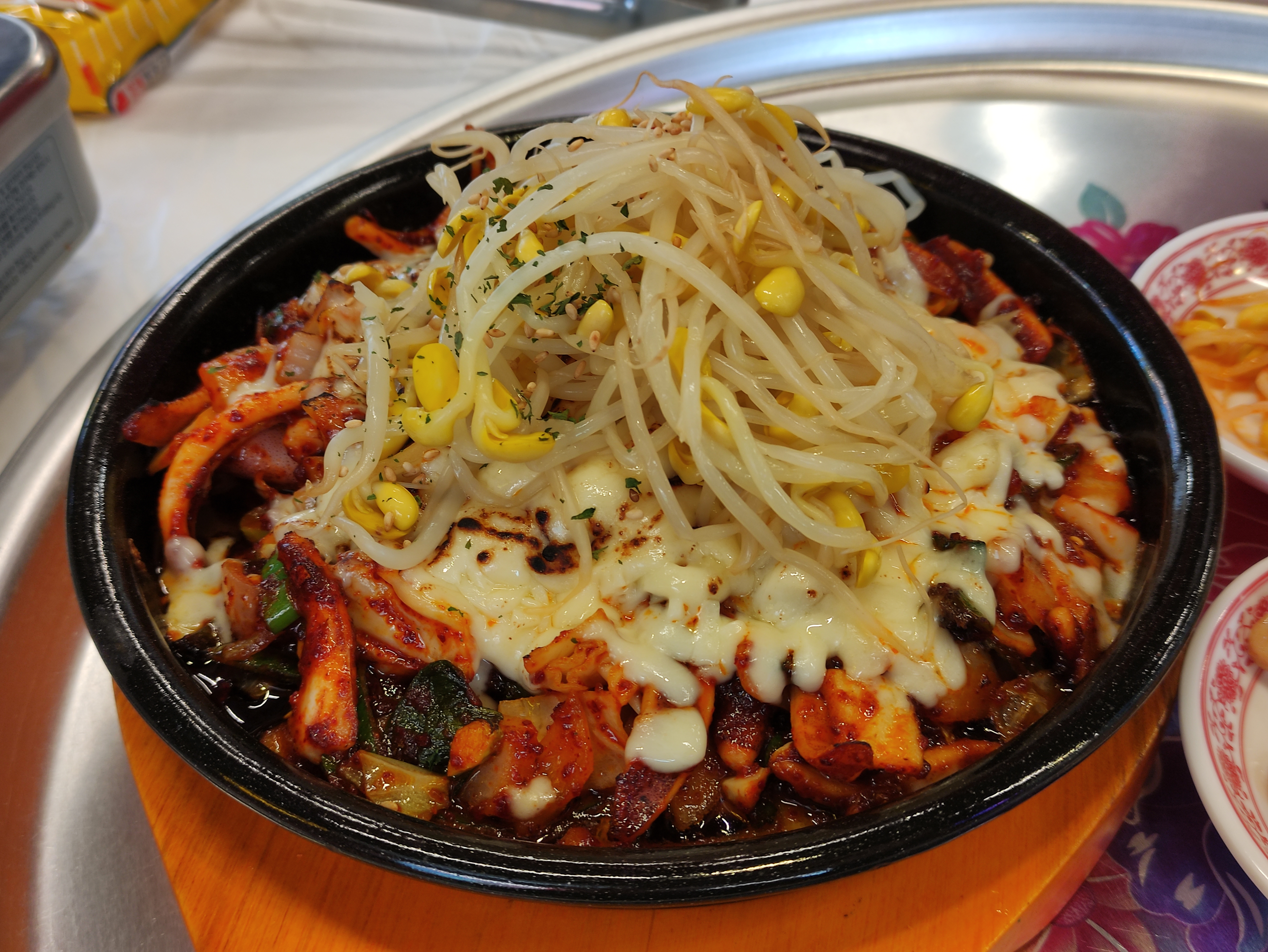 청양불오징어볶음이 나왔어요. 딱봐도 매운느낌이고, 위에 치즈와 콩나물이 올려져 나와요.