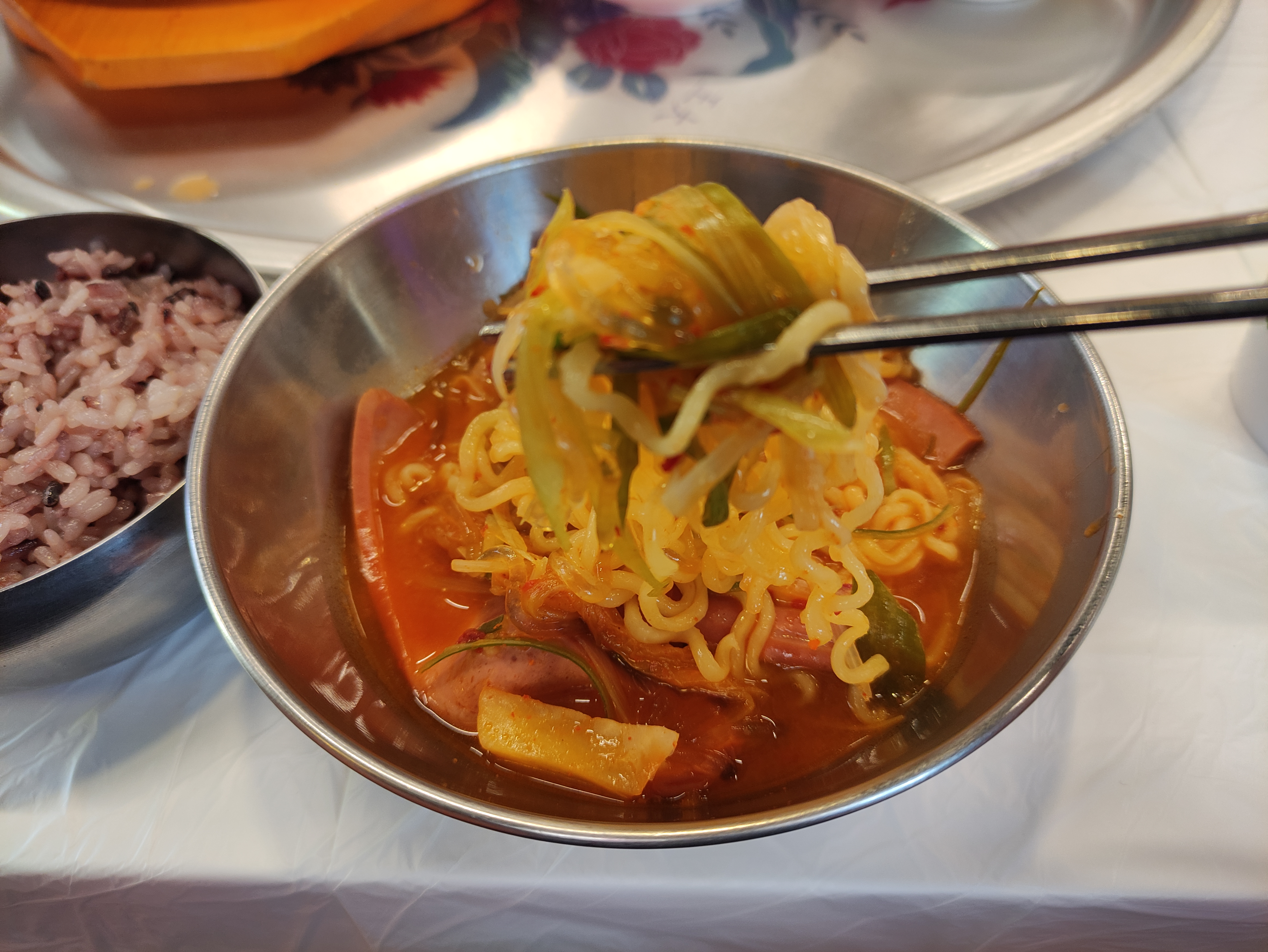 부대찌개먼저 호로록해요. 면이 불기전에 후딱 꺼내서 먹어요. 햄, 소시지, 당면등이 고루들어간 밸런스좋은 부대찌개에요.