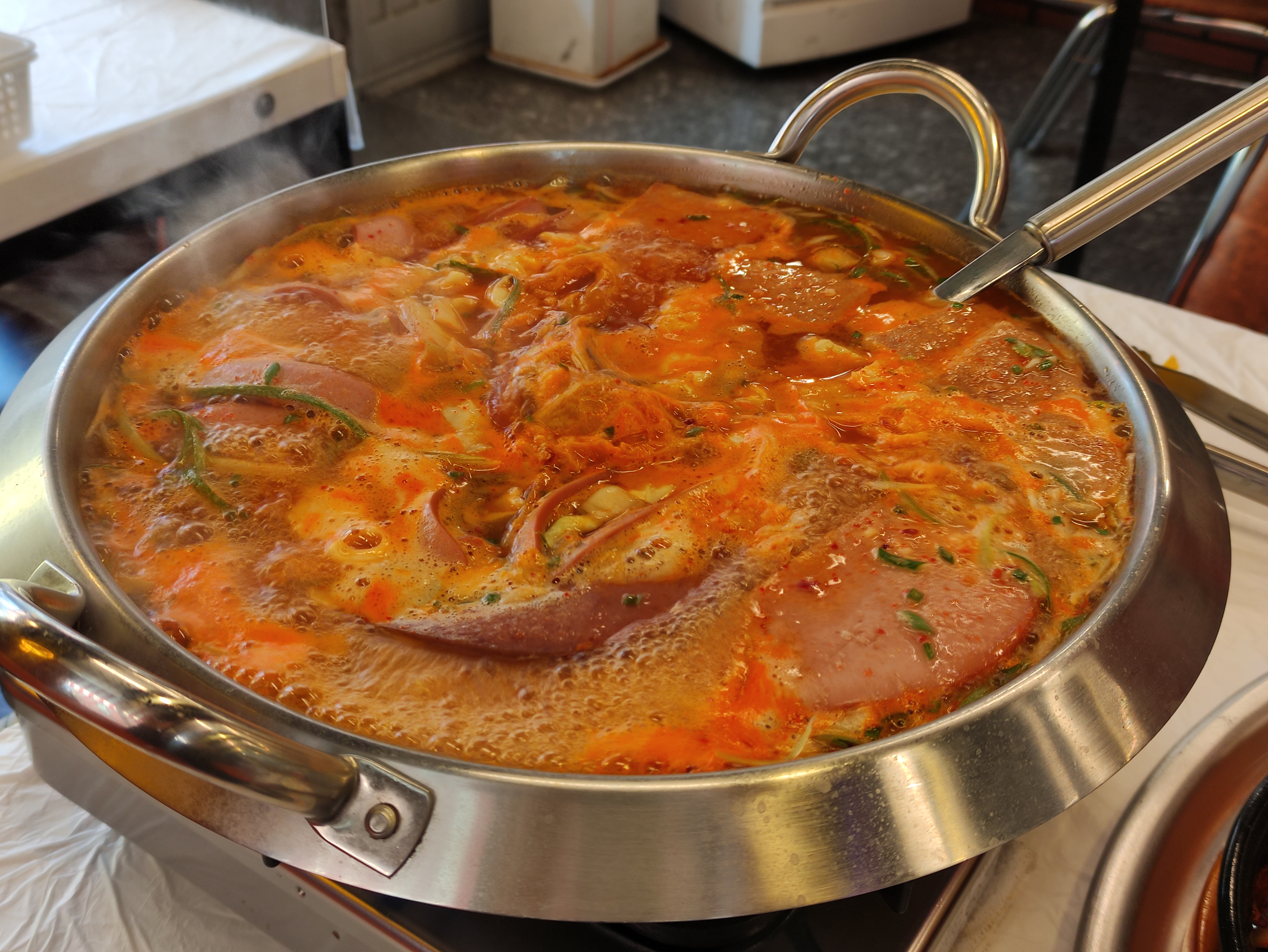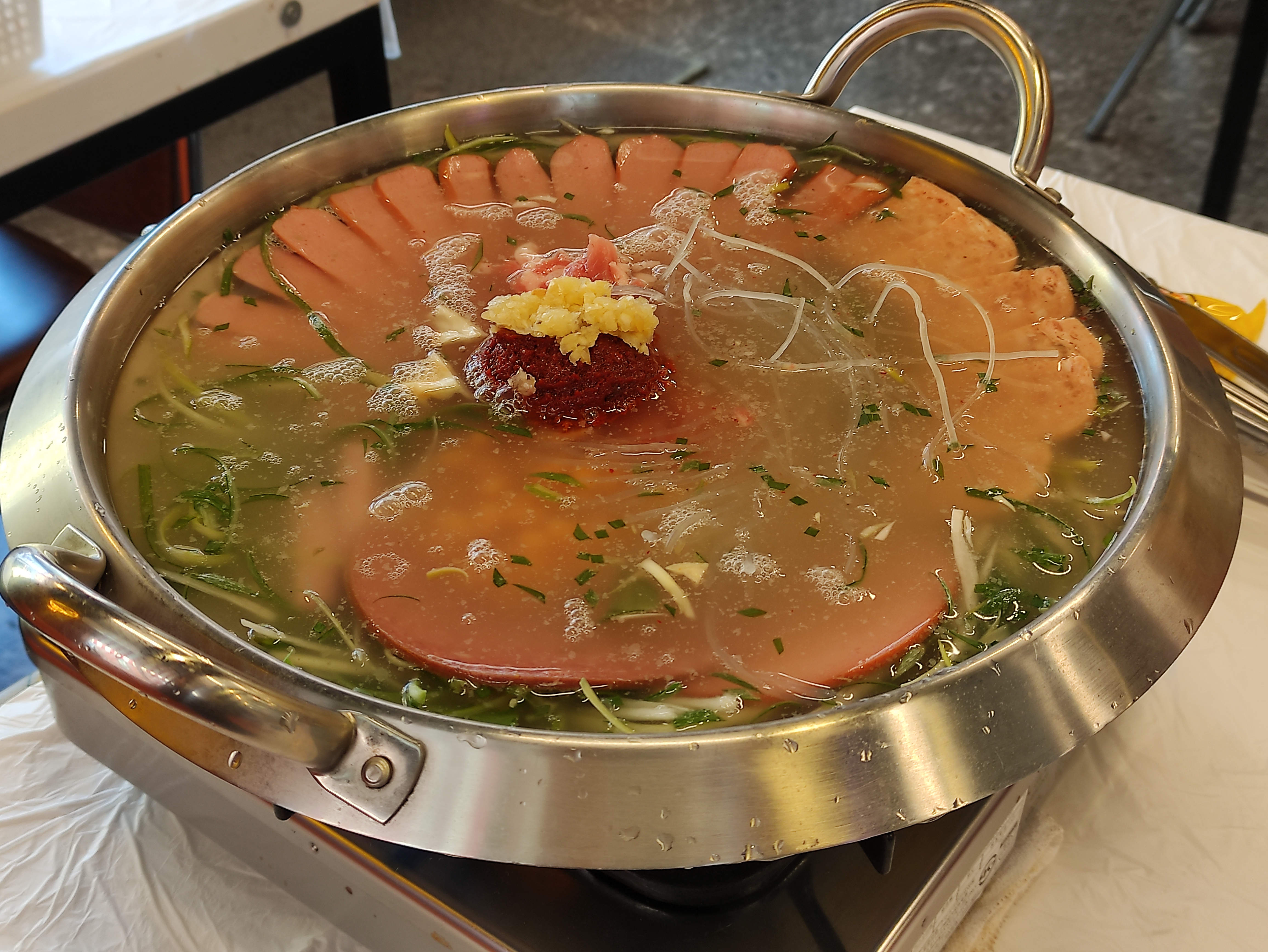즉석에서 보글보글 끓여먹는 부대찌개에요. 육수가 끓기시작하면 라면을 넣어서 먹어요.