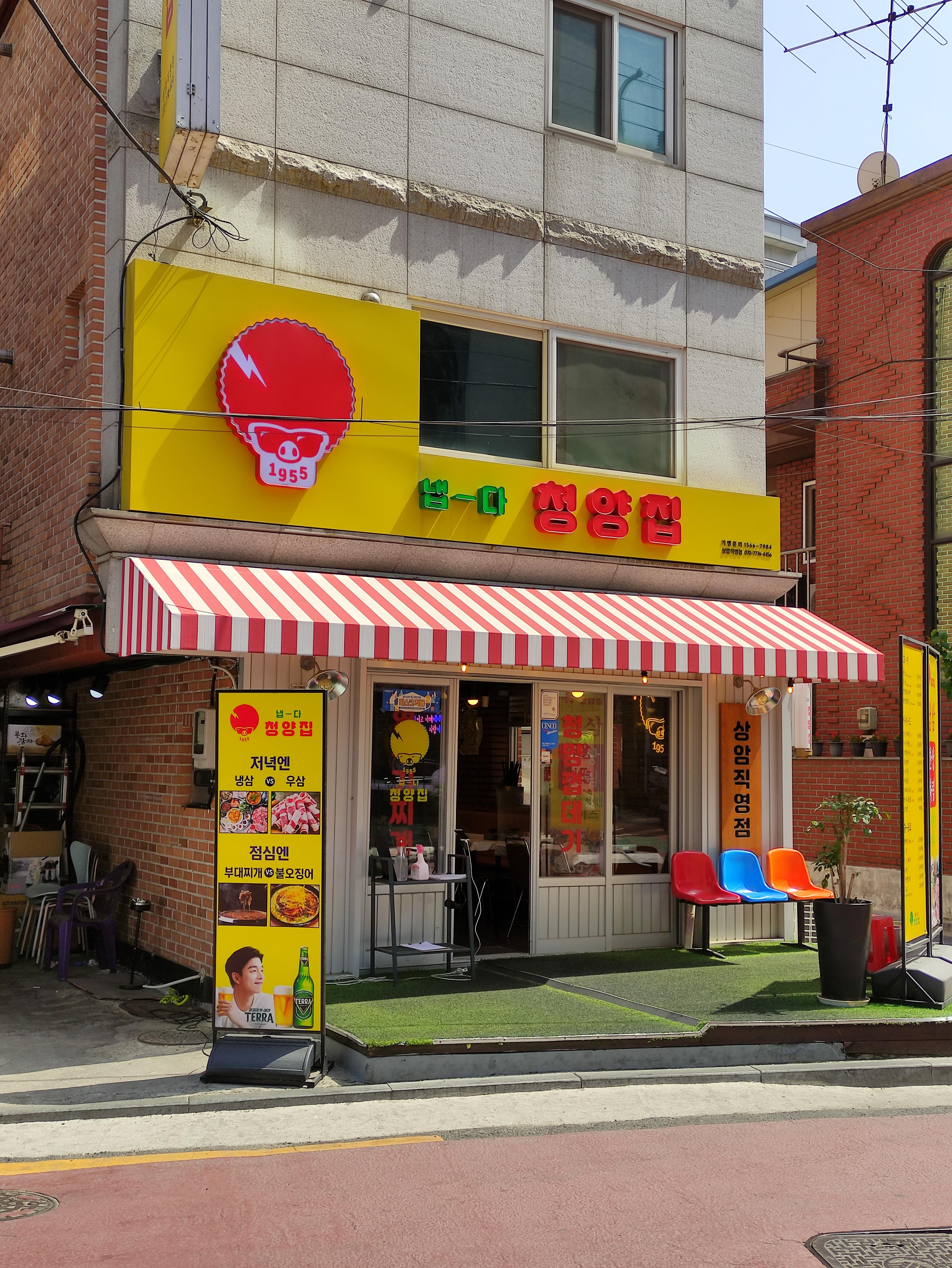 상암동쪽에 먹자골목처럼 음식점이 모여있는곳이 있더라고요. 냅다청양집 상암점도 이곳에 있어요. 입구 우측에 상암직영점이라고 문패?가 걸려있어요.