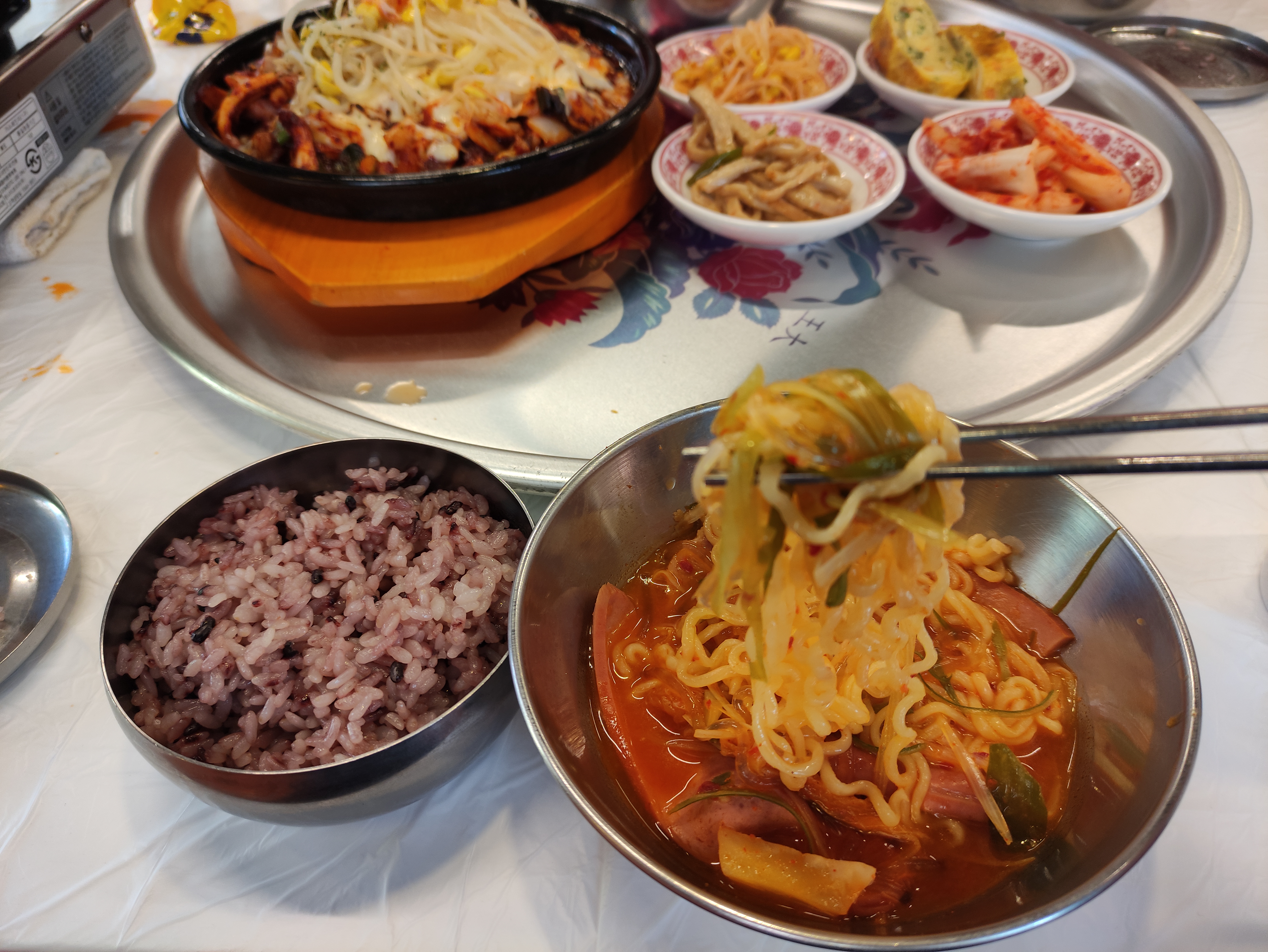 부대찌개와 기본찬, 밥이 먼저나왔어요. 기본찬으로는 4종류가 나오고, 밥은 건강에 좋은 흑미밥이 나왔어요.