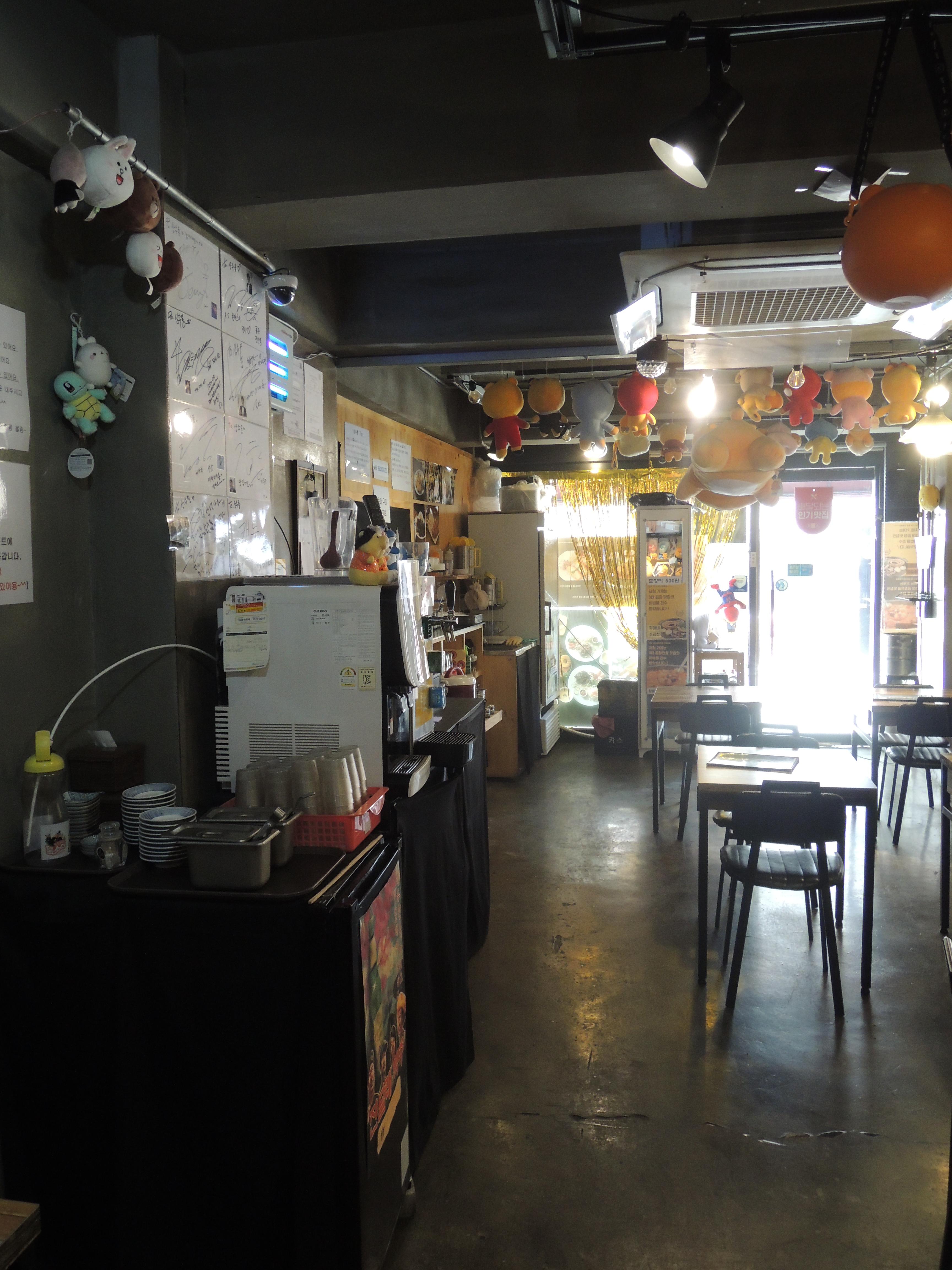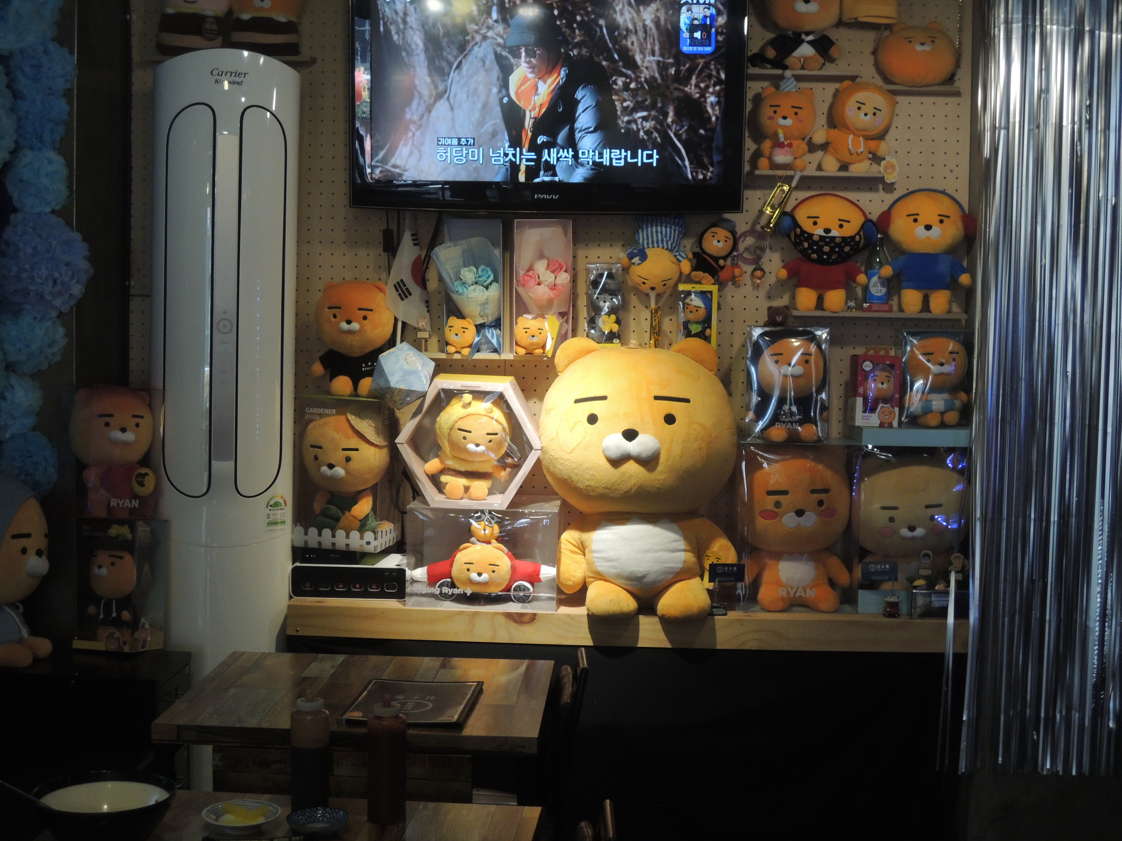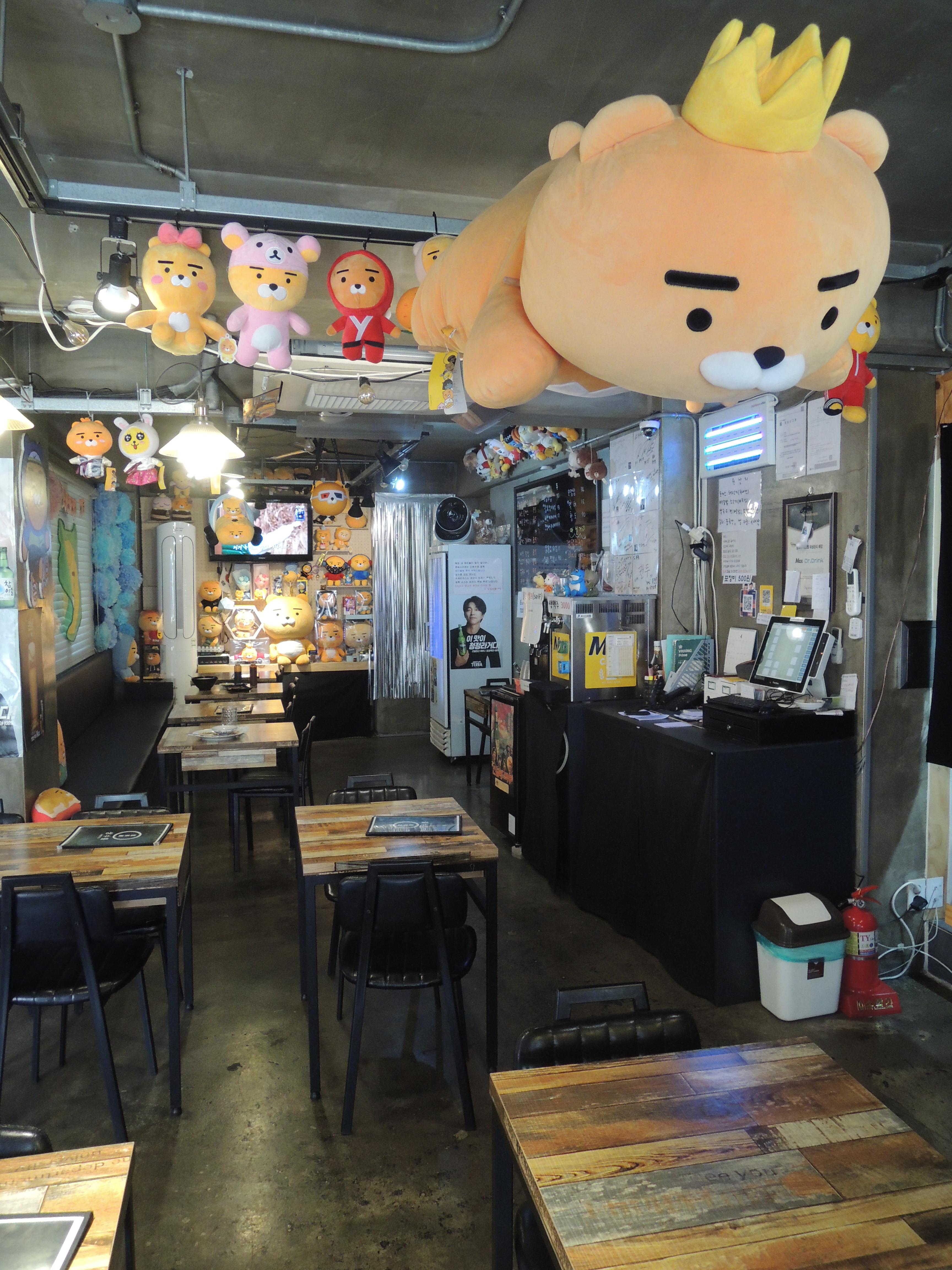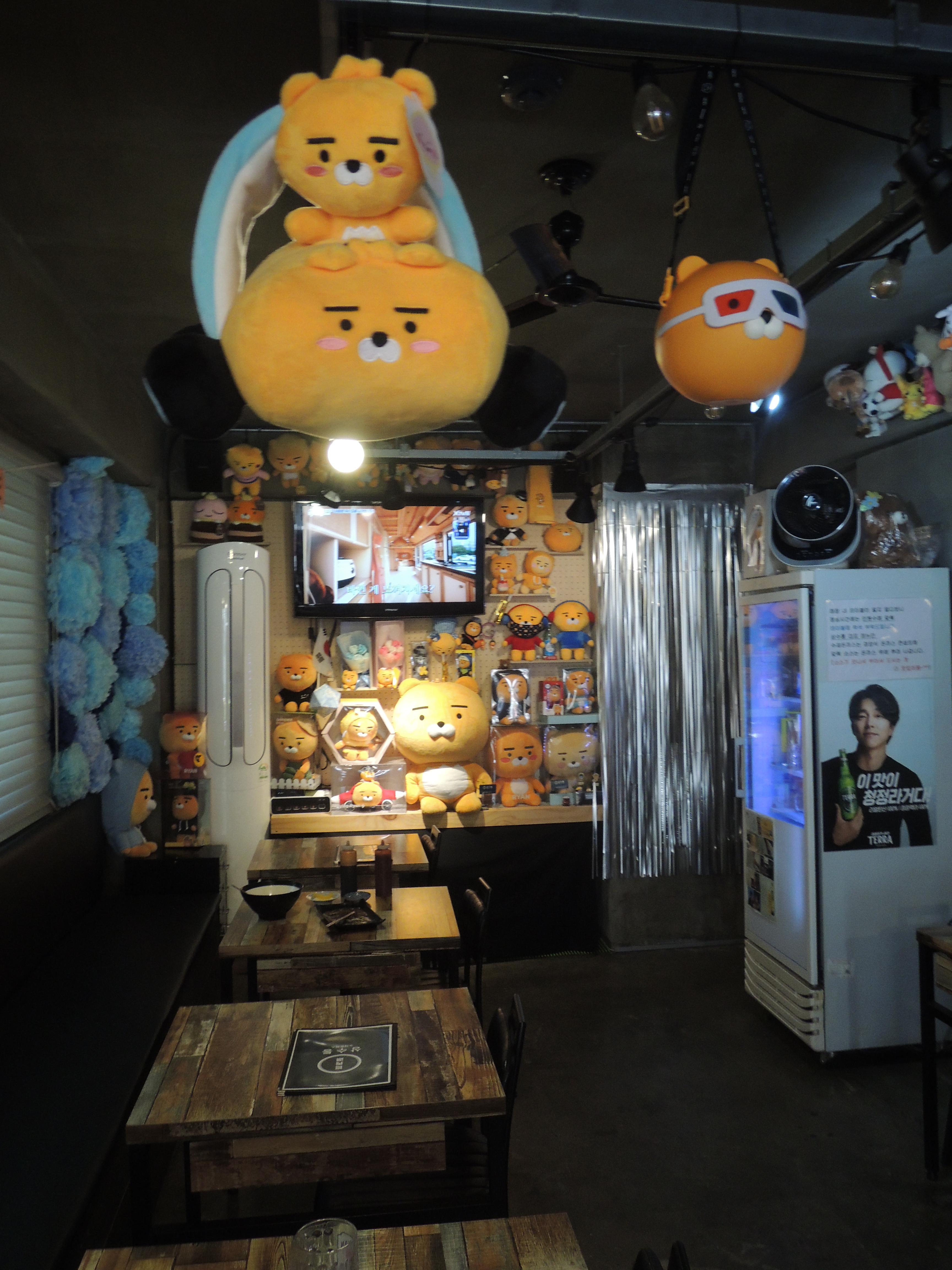 카카오톡 캐릭터인 라이언이죠. 천장, 벽에 라이언 인형으로 인테리어를 꾸몄습니다. 주인분께서 라이언 매니아이신가봐요.