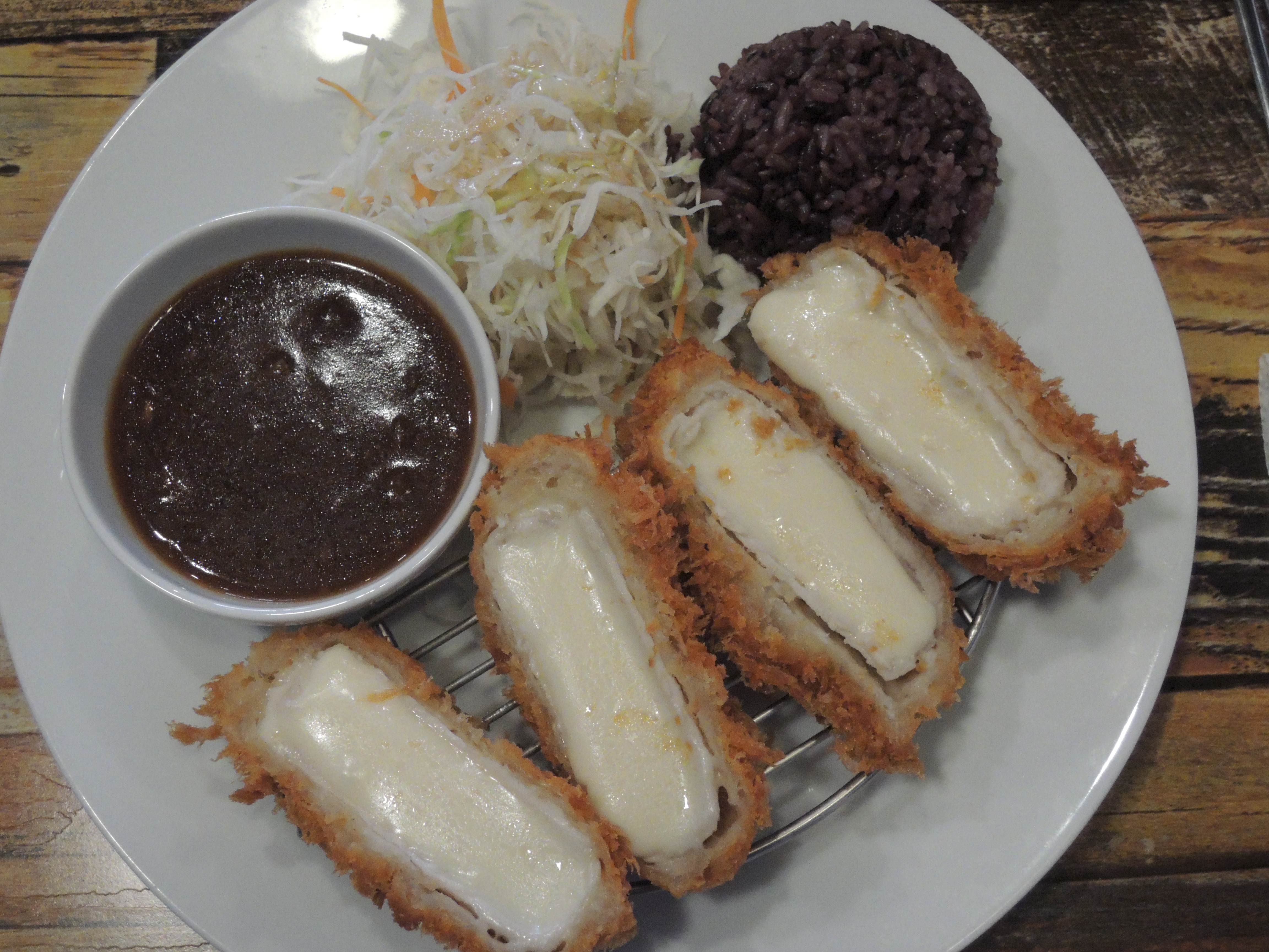 치즈가 듬뿍듬뿍 치즈돈까스 입니다. 밥이 흑미밥으로 나오는게 신기하네요.
