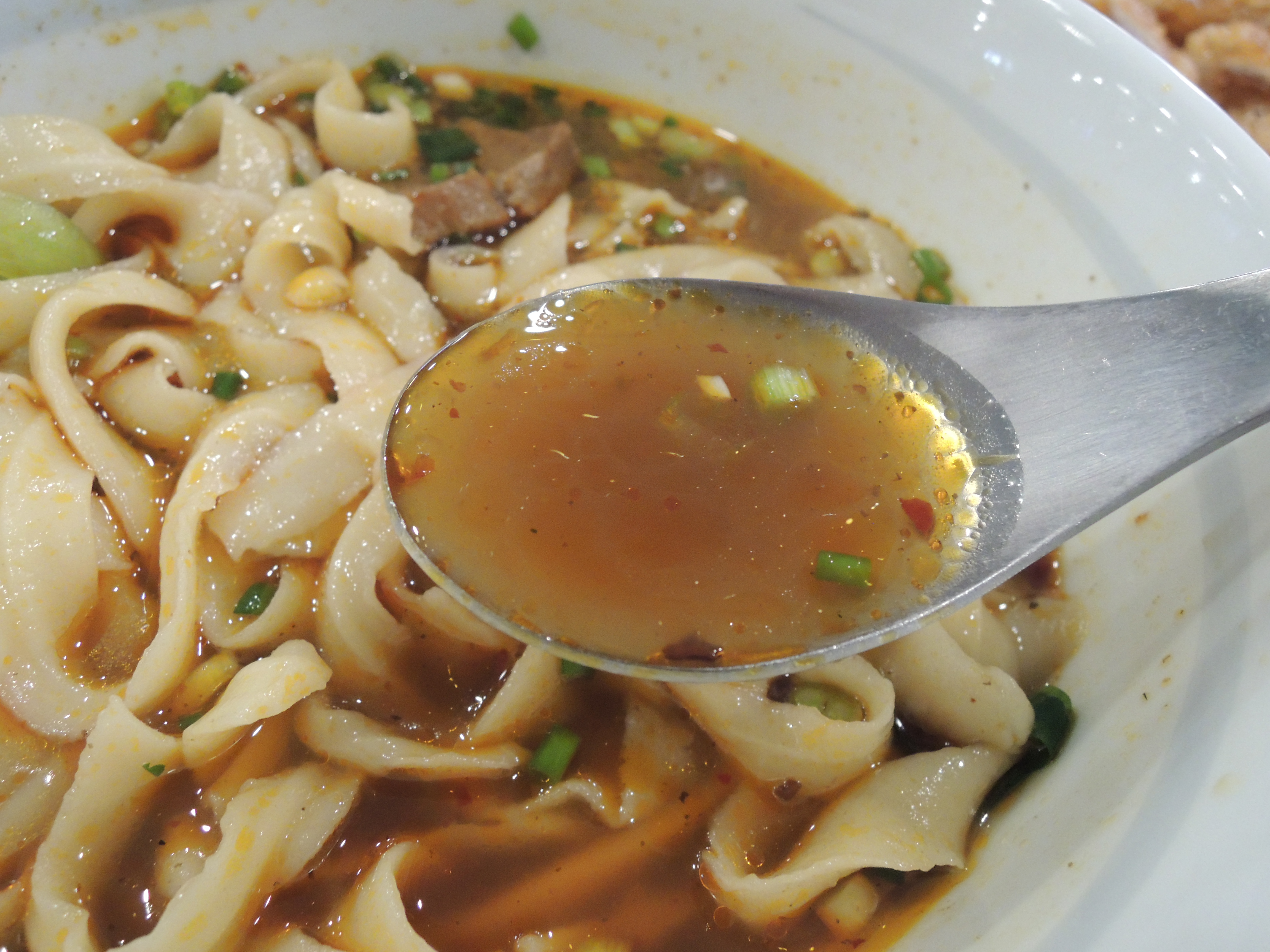 면이 참 투박하면서 납작해서 독특해요. 수제비? 같은 면이네요.
