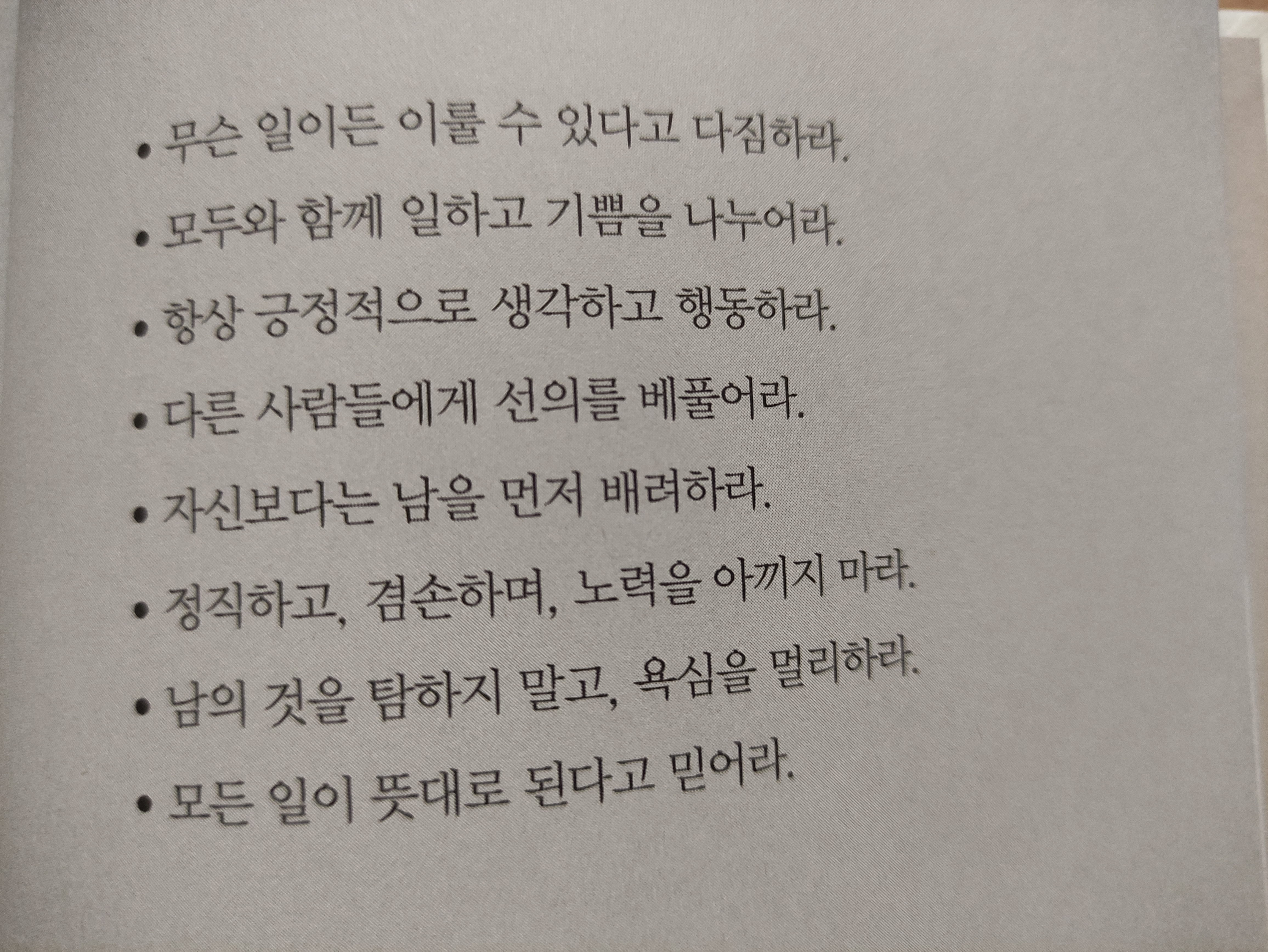 책의 마지막부분에 이나모리가즈오 회장이 소개하는 일과 인생의 열매를 풍성하게 맺을수 있는 8가지 사고방식도 많이 도움이 되었어요. 살면서 어려움이란 벽에 갇혔을때 한번 읽고 마음을 잡을 수 있게 하는 좋은 책인거 같습니다. 지식보다 삶의 지혜가 담긴 책이라고 생각해요. 잘 읽었습니다.