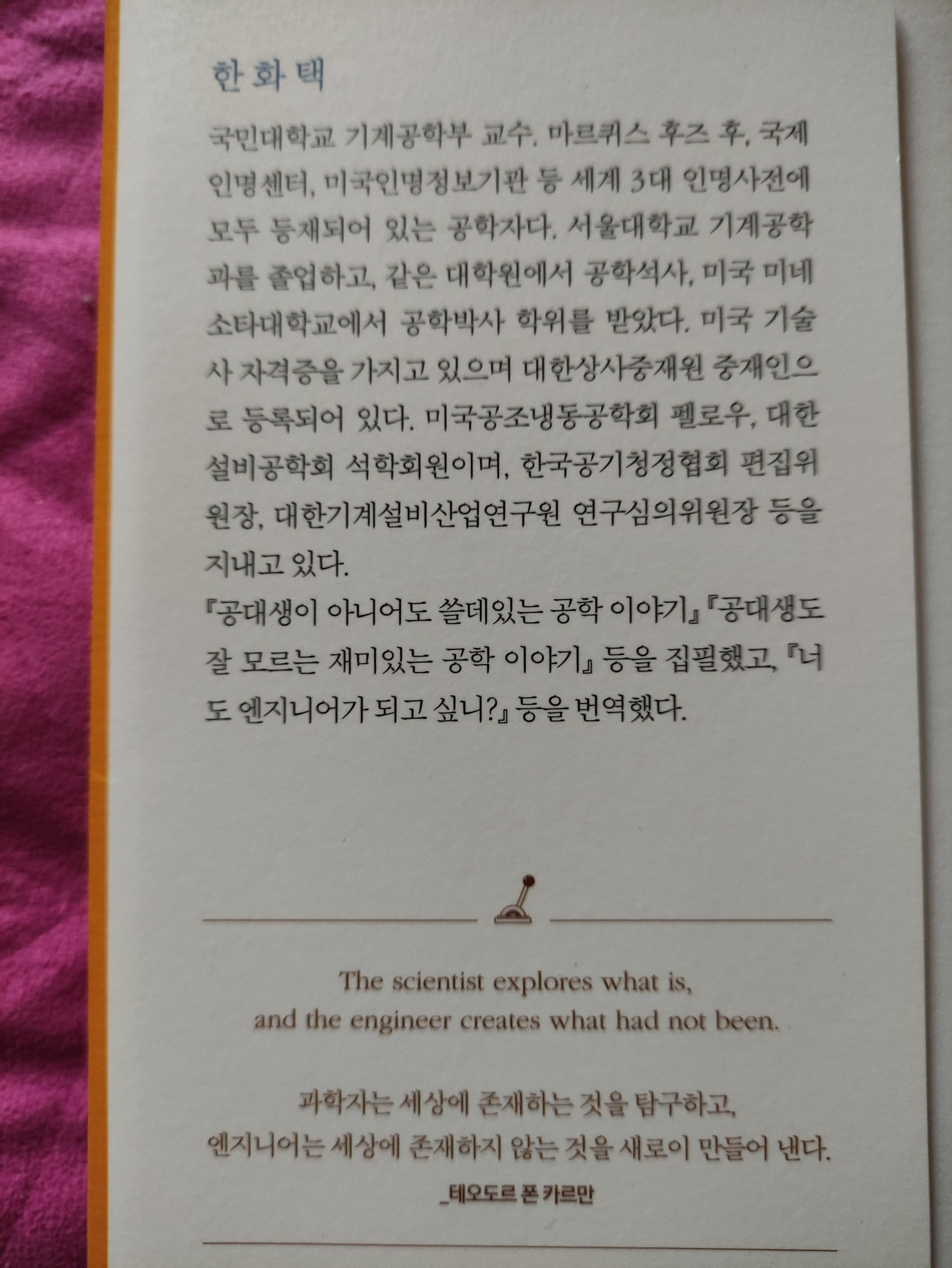 책의 저자이신 한화택 교수님은 서울대 기계공학과를 졸업하시고 국민대 기계공학과 교수로 계신분으로, 세계인명사전에 이름이 올라가신 유명한분이세요. 다양한 공학책을 집필하고, 번역하셨습니다.