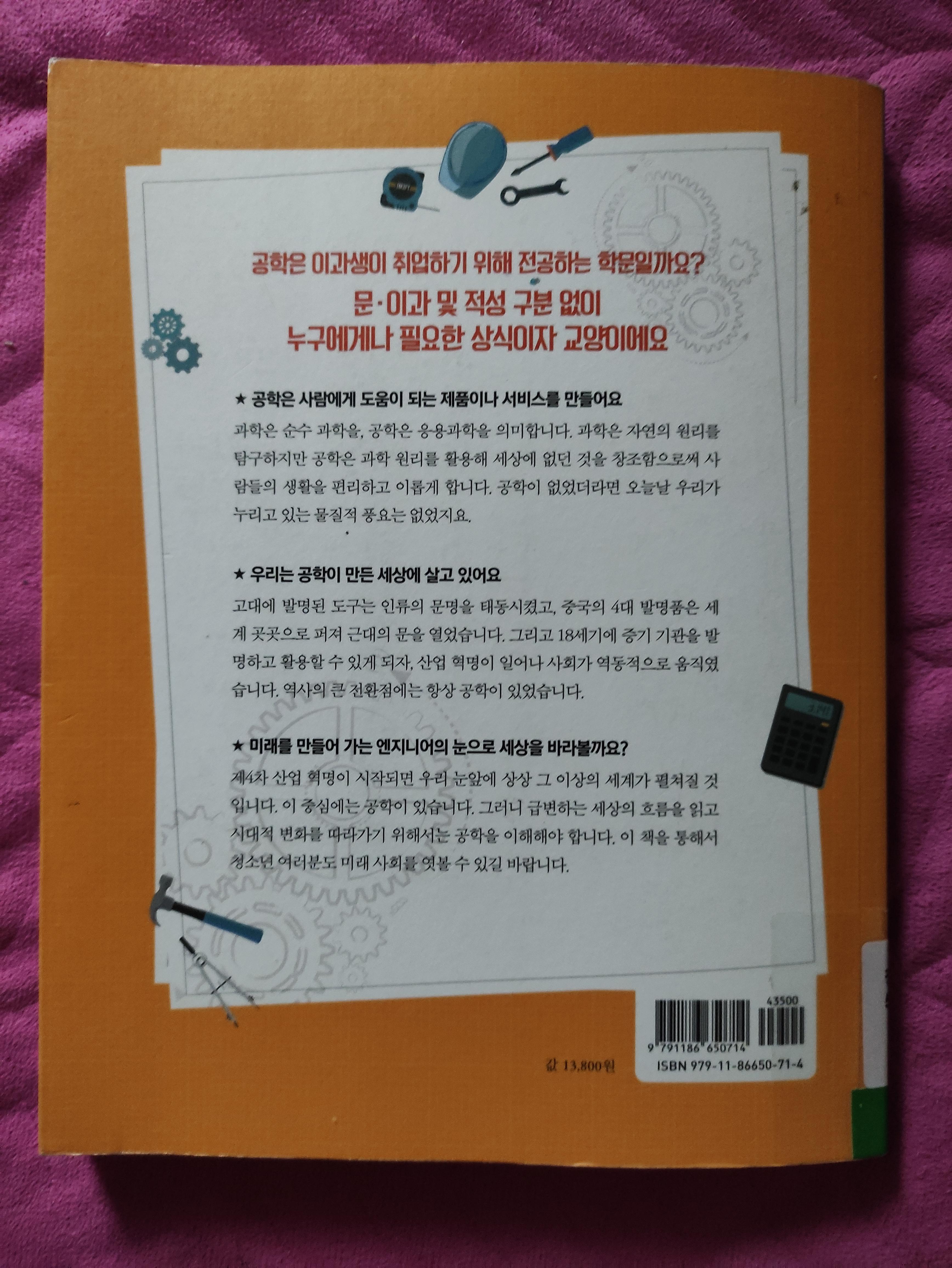 기초 공학이 부족하거나, 공학을 처음 접하는 10대분들이 읽기 좋은 책이에요. 어려운 수식보다 공학이란 어떤것인지 설명하는 흥미도 있고 호기심도 부르는 재밌게 읽을 수 있는 책입니다.
