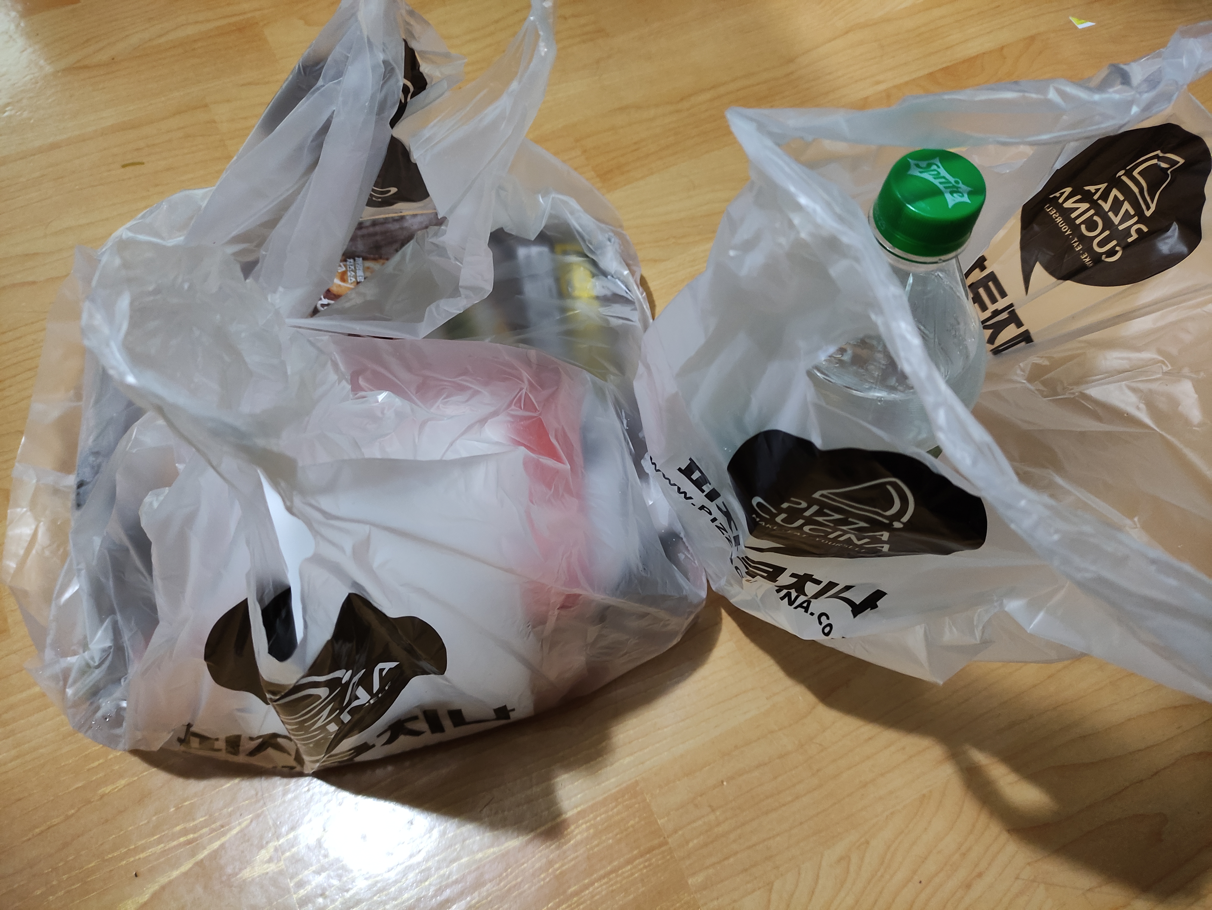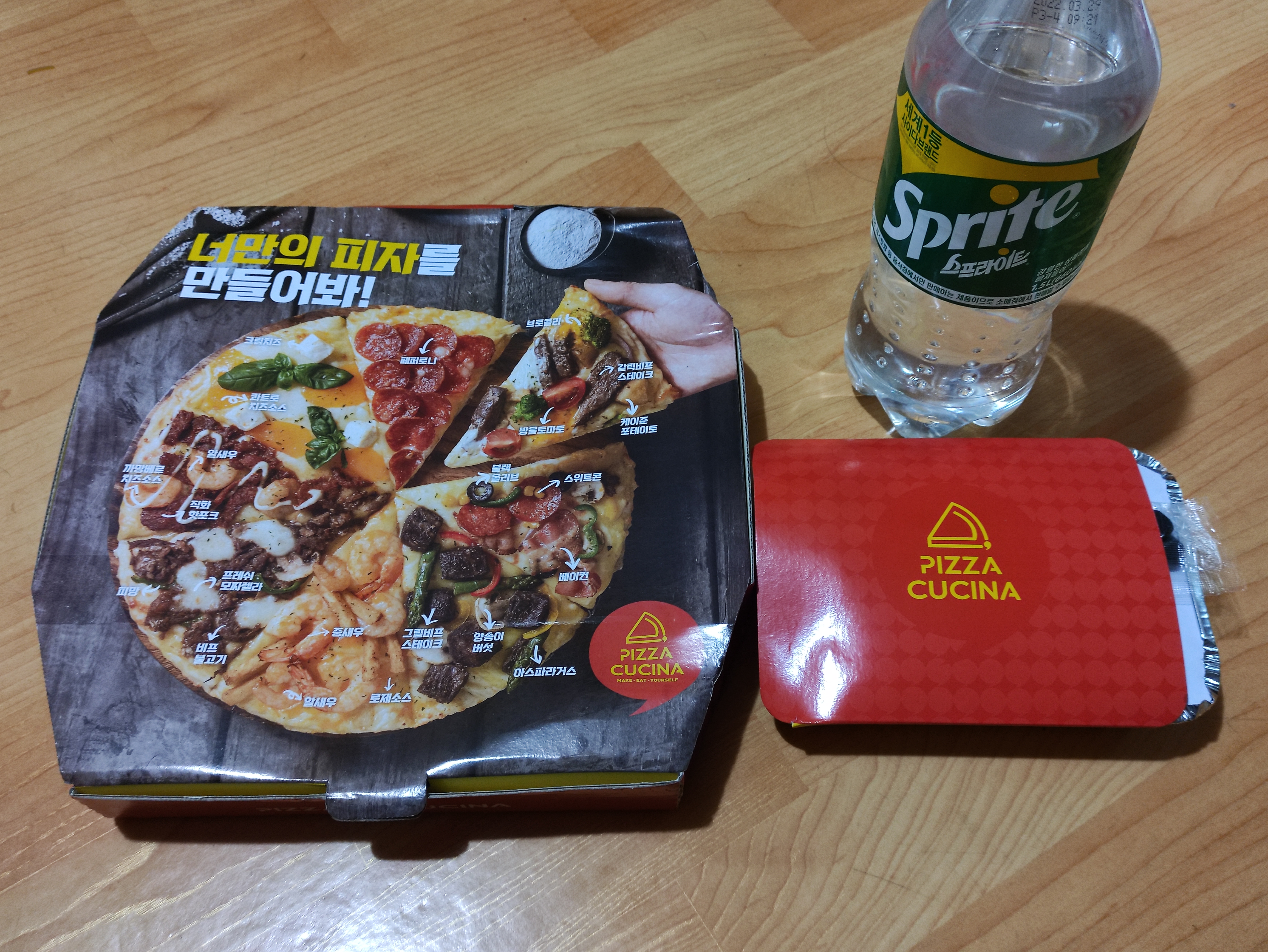 저는 나만의 피자와 미트소스스파게티 그리고 사이다를 테이크아웃 포장주문했습니다.