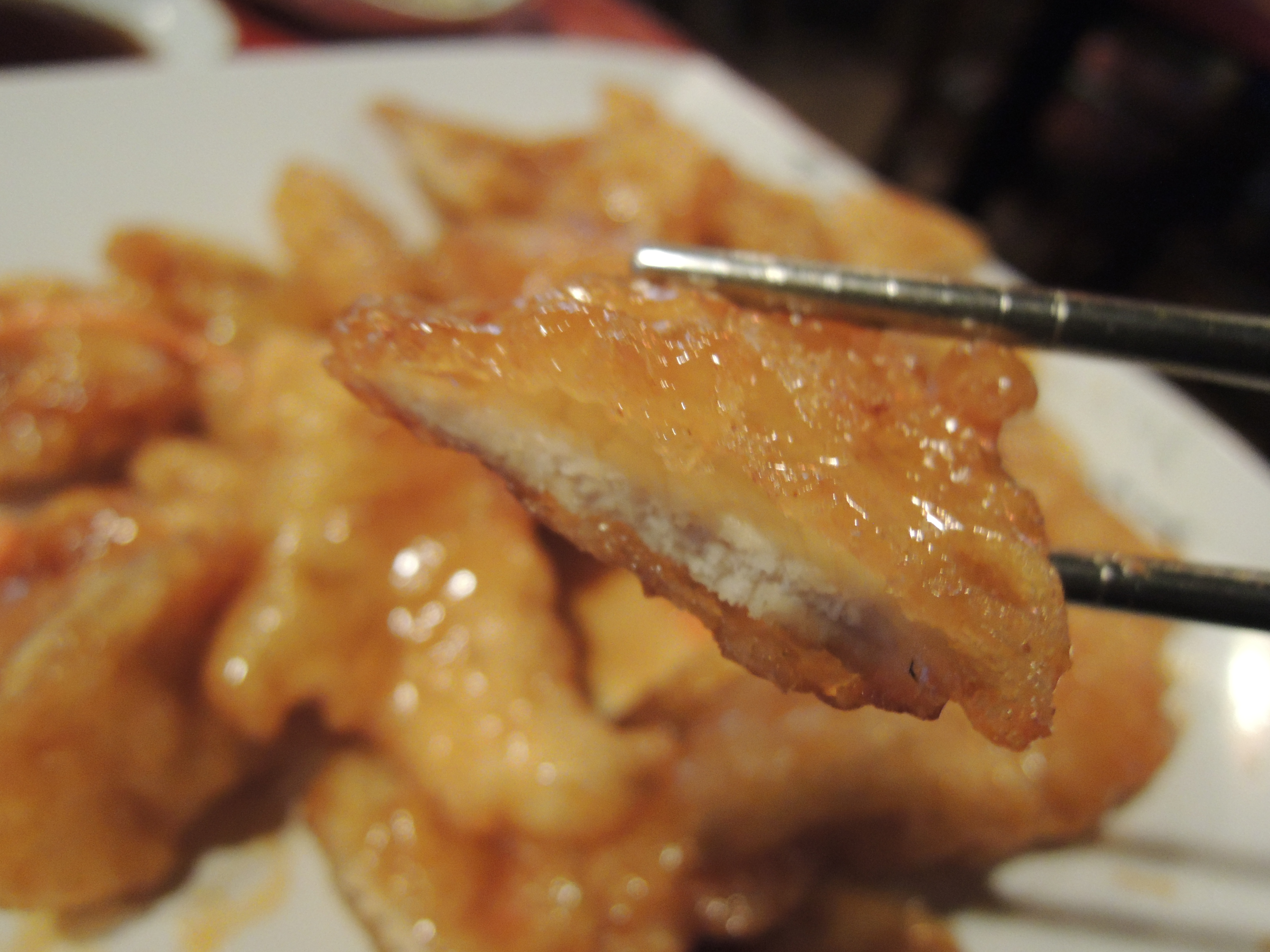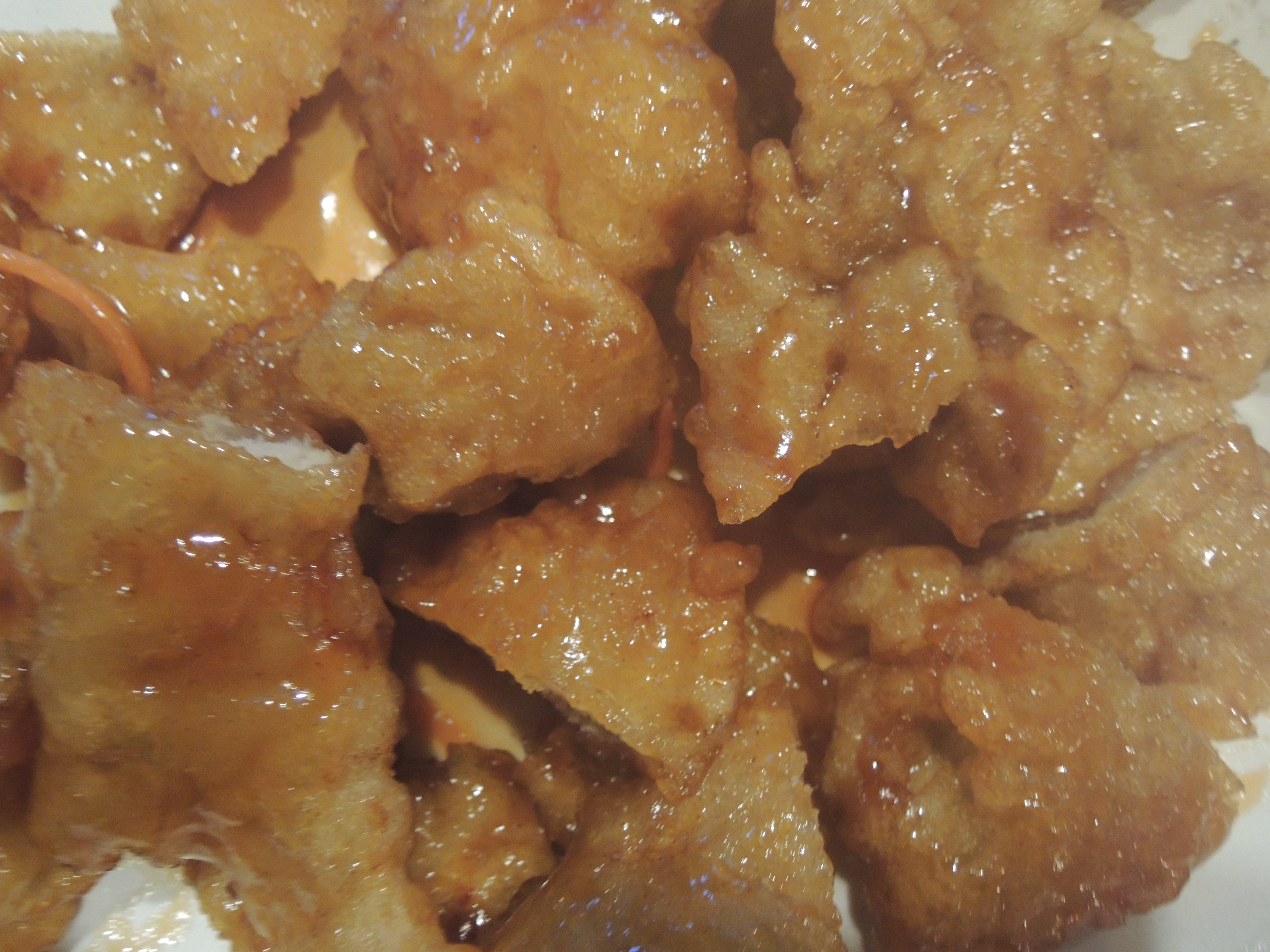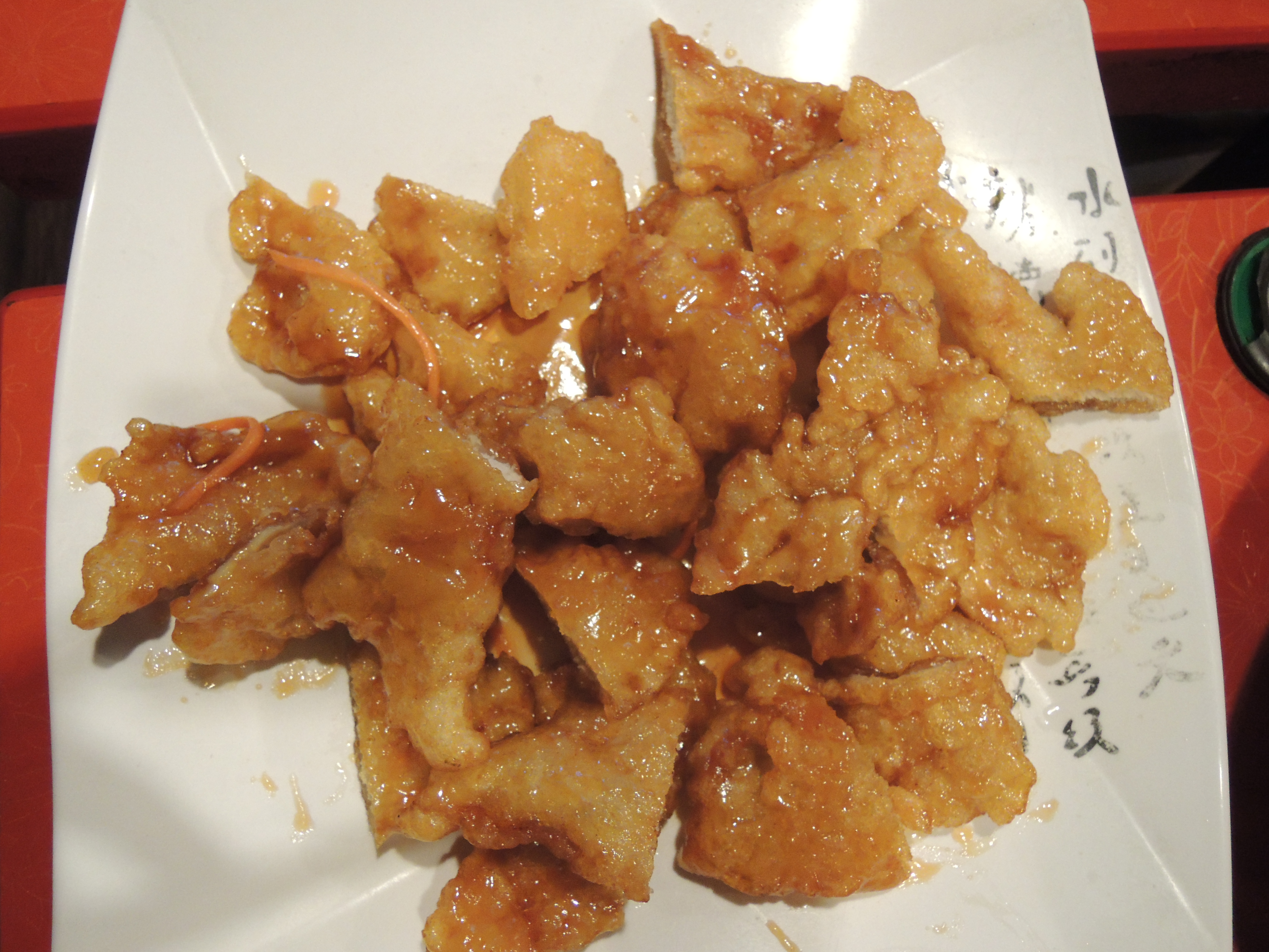 매화양꼬치의 꿔바로우입니다. 보통 튀긴꿔바로우에 소스를얹어주거나 볶아서 주는 2가지 경우가 있는데, 이곳은 소스와 함게 볶나봐요. 그래서 소스가 꿔바로우에 고루 배여 있습니다.