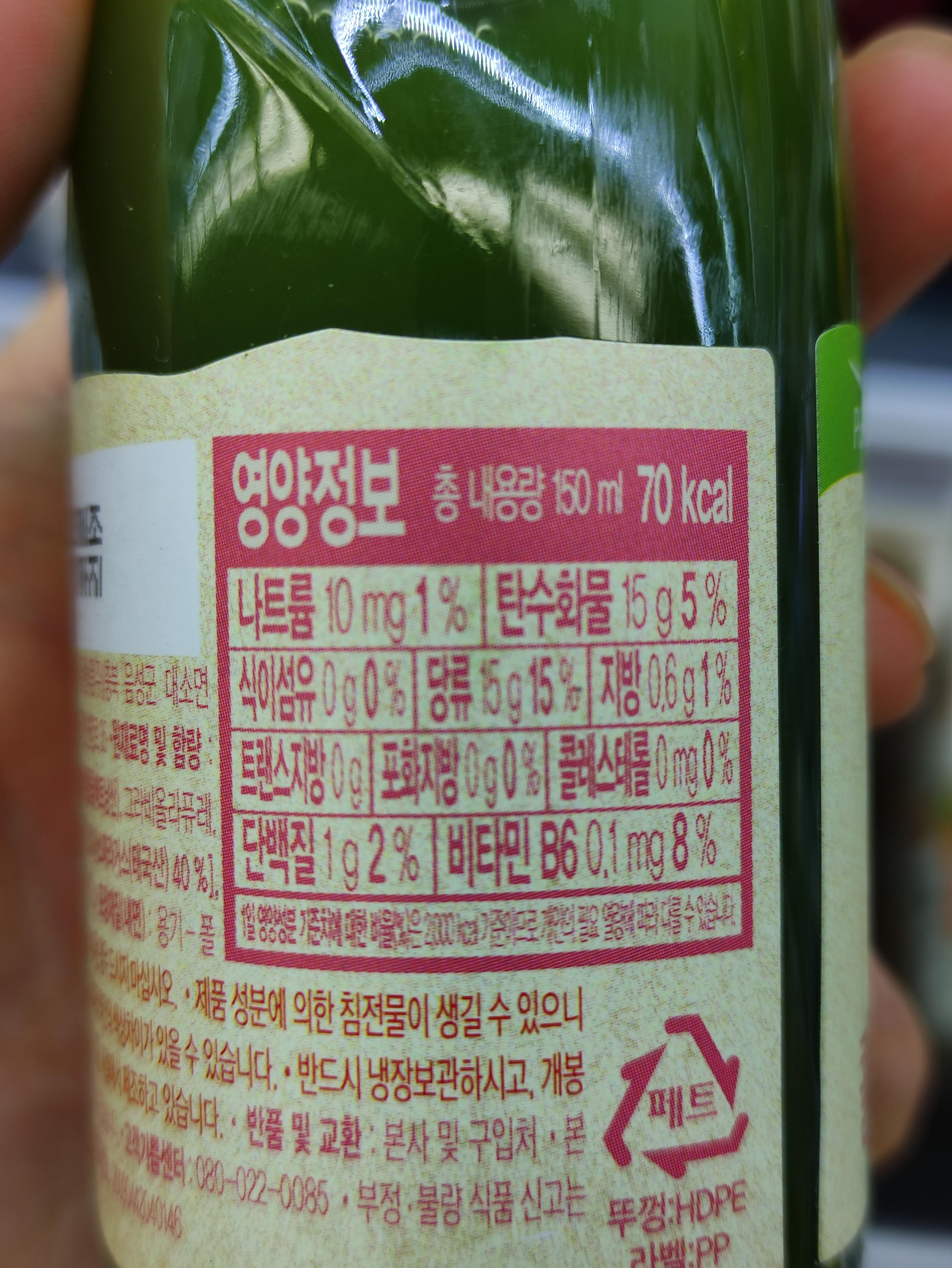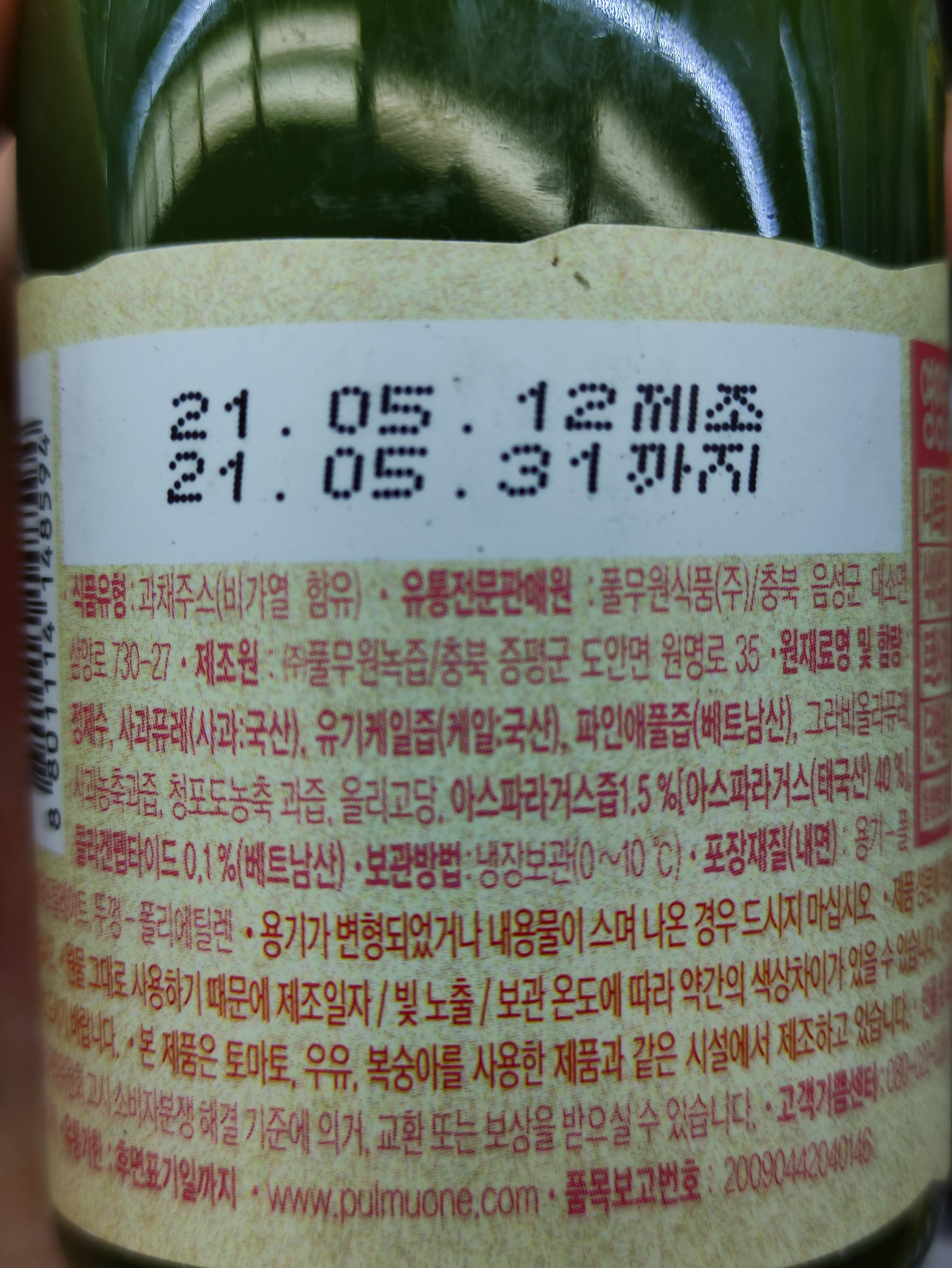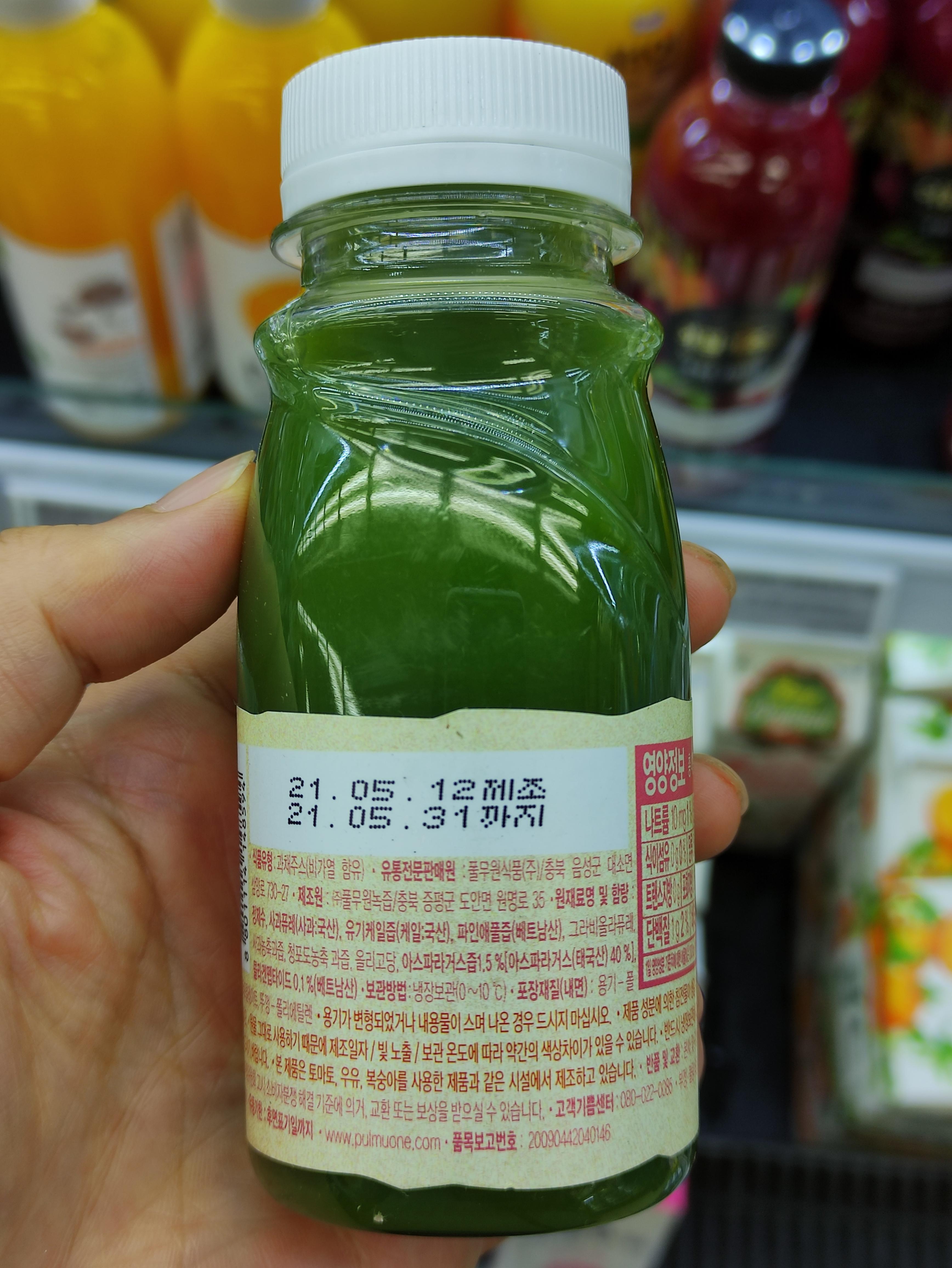 원재료는 정제수 사과퓨레 유기케일즙 파인애플즙 아스파라거스즙 등이 들어갑니가. 제조원은 충북증평군에 풀무원녹즙이에요.