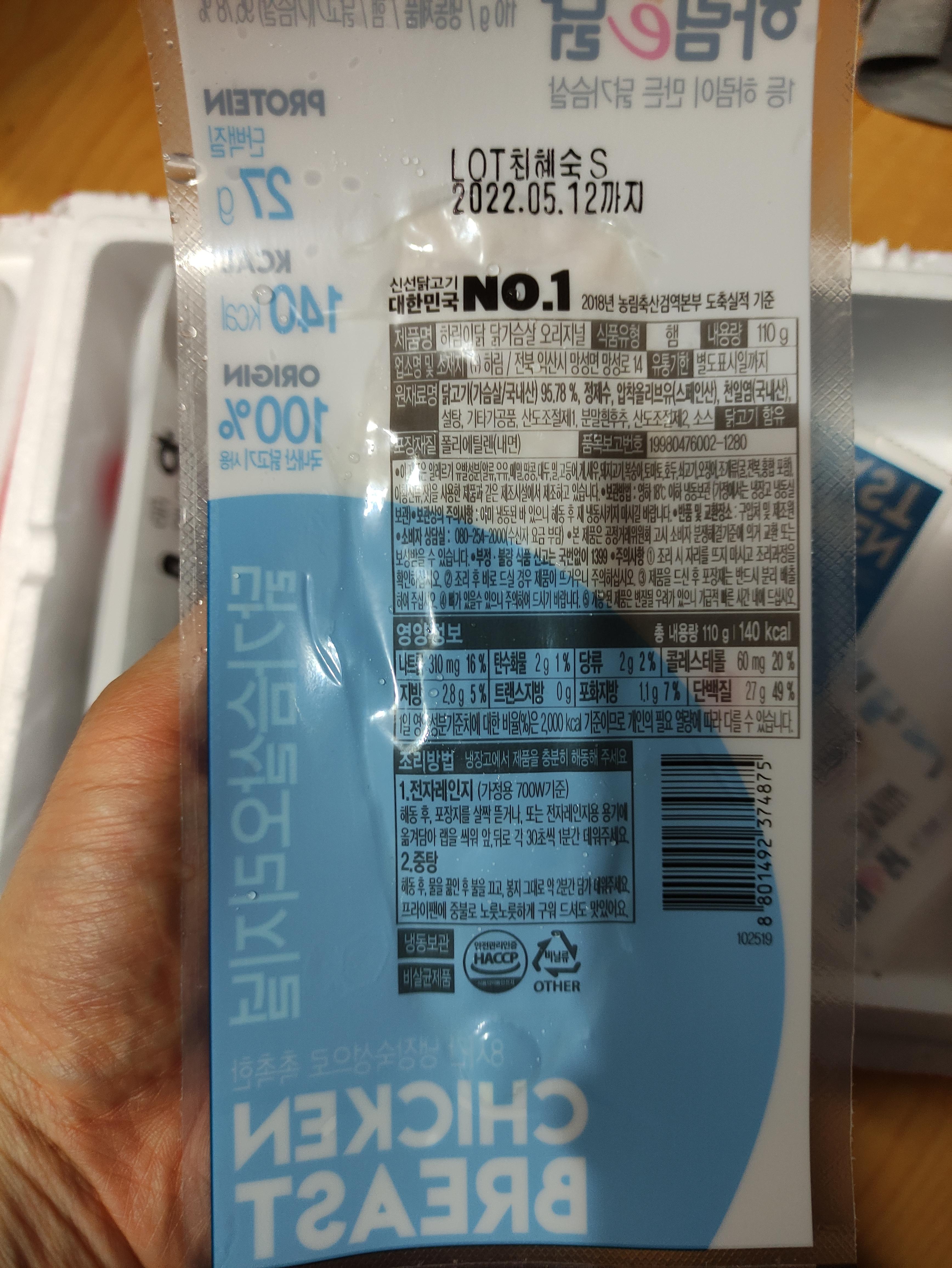 짜잔 하림이닭 닭가슴살 오리지널 7봉입니다. 보통 닭가슴살 하나당 용량이 100그람 110그람 나뉘어져있는데 100그람은 먹었을때 좀 작은감이 있더라고요. 그래서 110그램짜리 하림이닭으로 주문했죠 ㅎㅎ