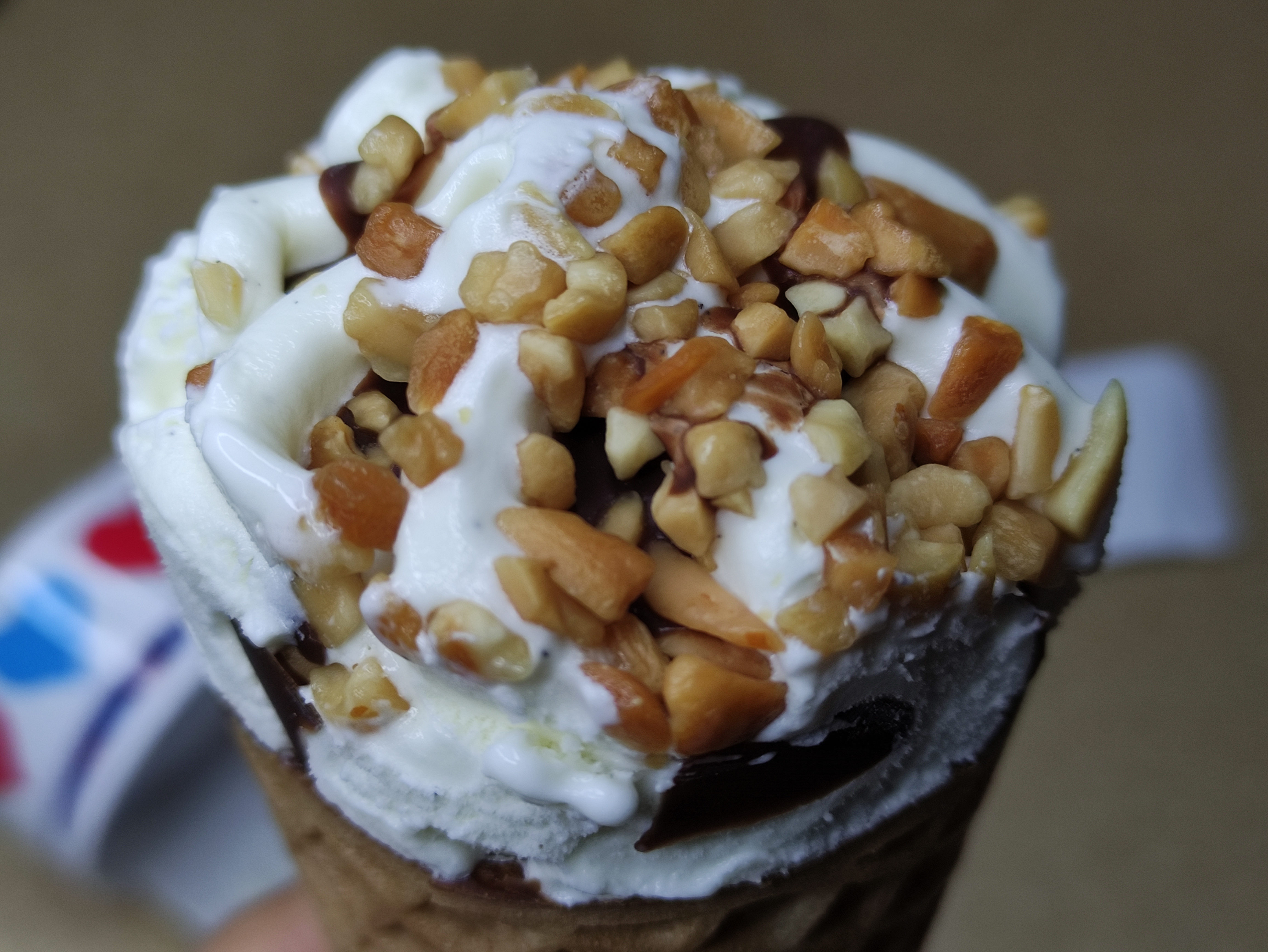 바닐라베이스에 상단부에는 초코렛, 그리고 그 위에 아몬드땅콩이 올려져 있어요.