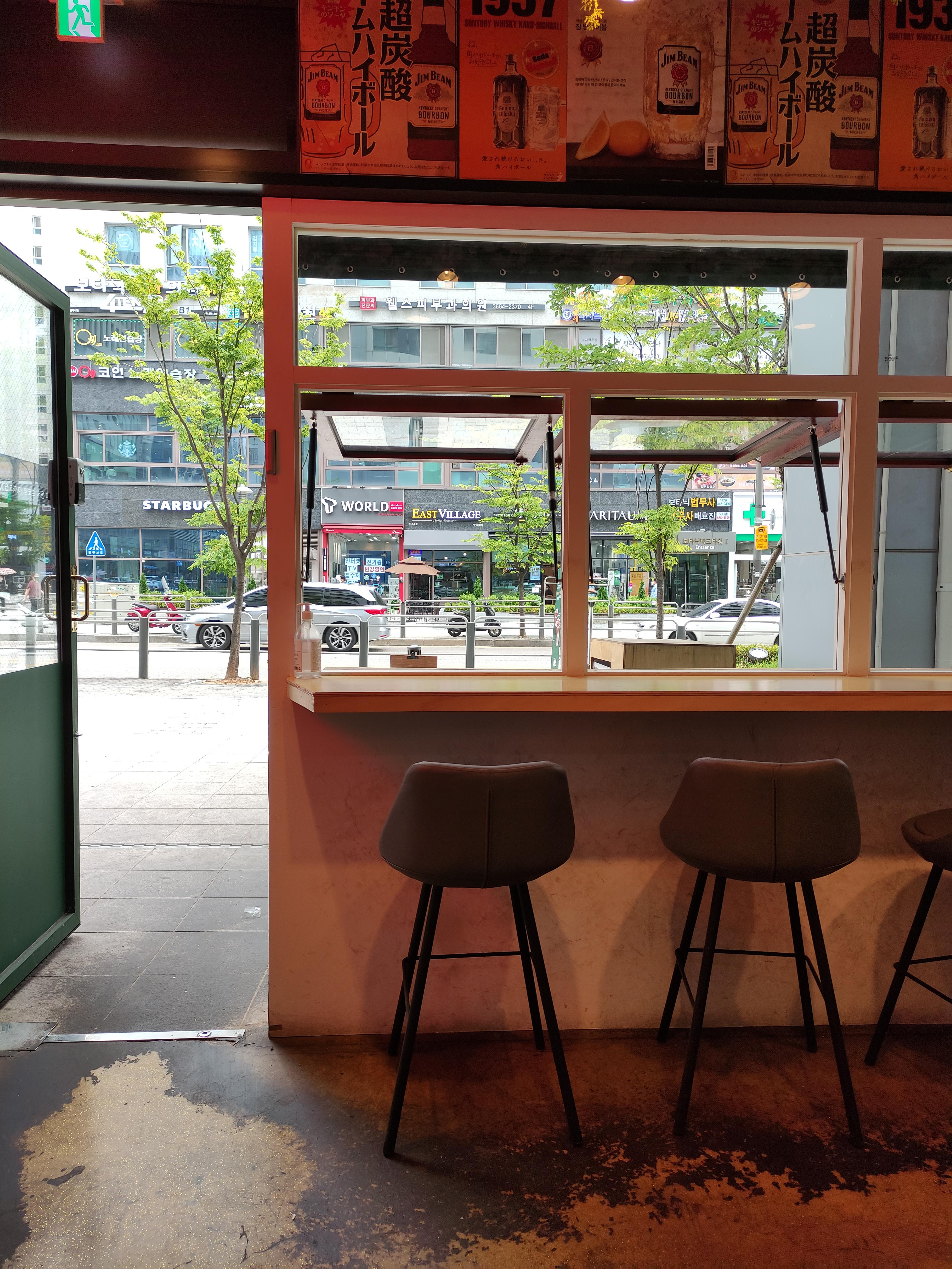 테이블은 위사진처럼 밖을 향한 바형태의 테이블이 있고 , 2인용테이블이 매장안에 3개있어요. 그리고 매장중앙에 주방이있고 그 앞에 바형태로 된 테이블이 하나 더 있습니다. 보통 커플손님이 많은가봐요.