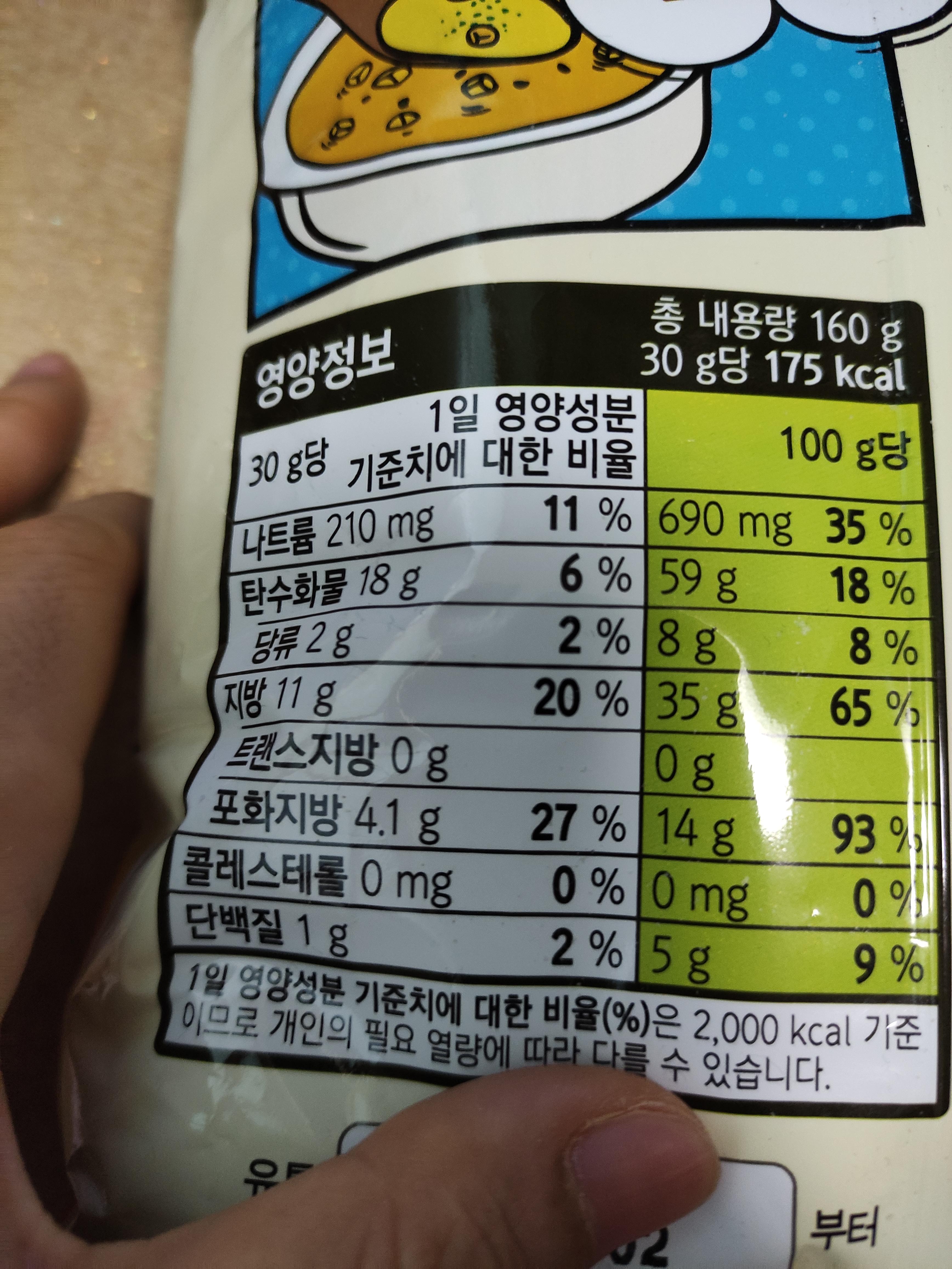 꼬북칩의 영양정보입니다. 지방과 포화지방이 함량이 좀 높네요.