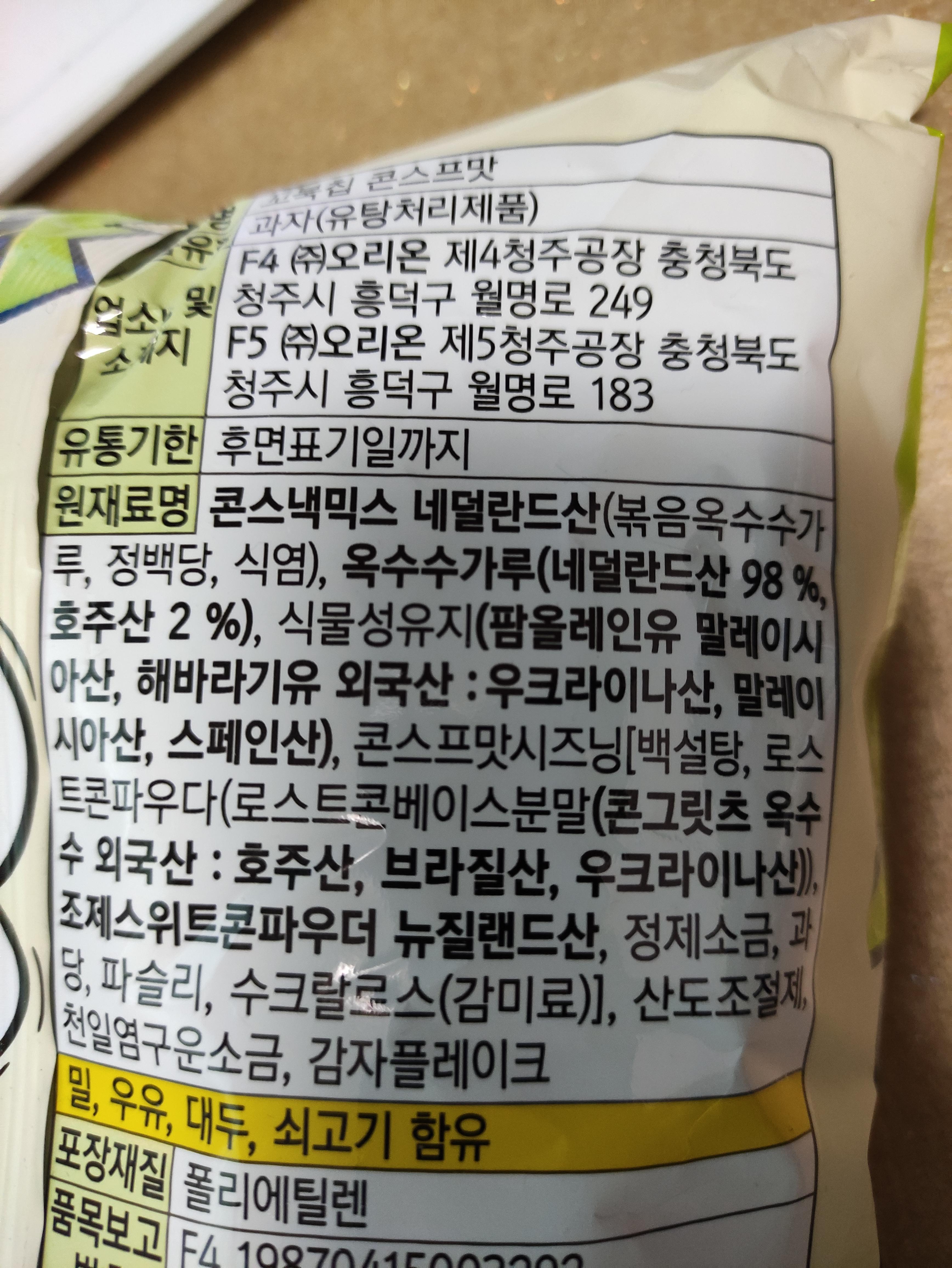 원재료로 콘스낵믹스, 옥수수가루 등이 들어가고, 알러지유발물질로 밀, 우유, 대두, 쇠고기가 들어있습니다.