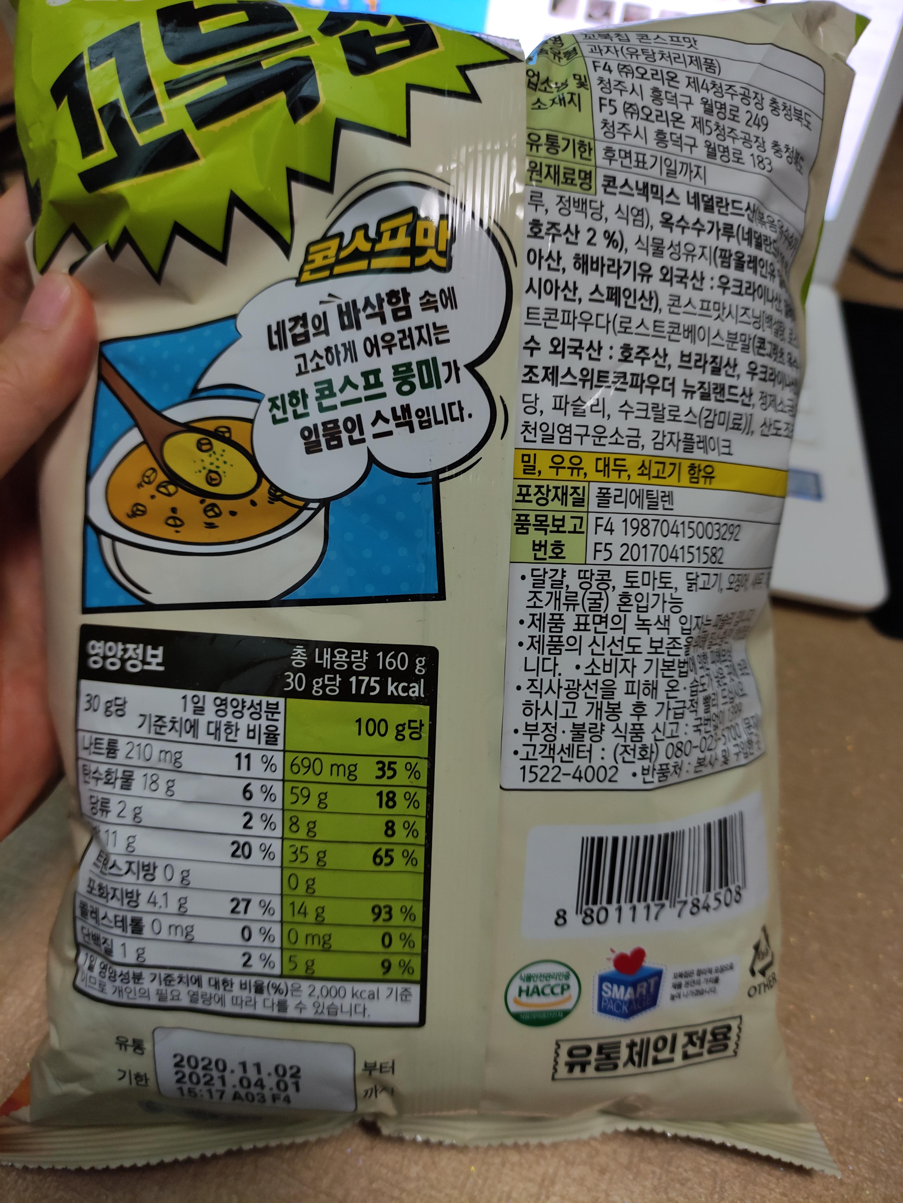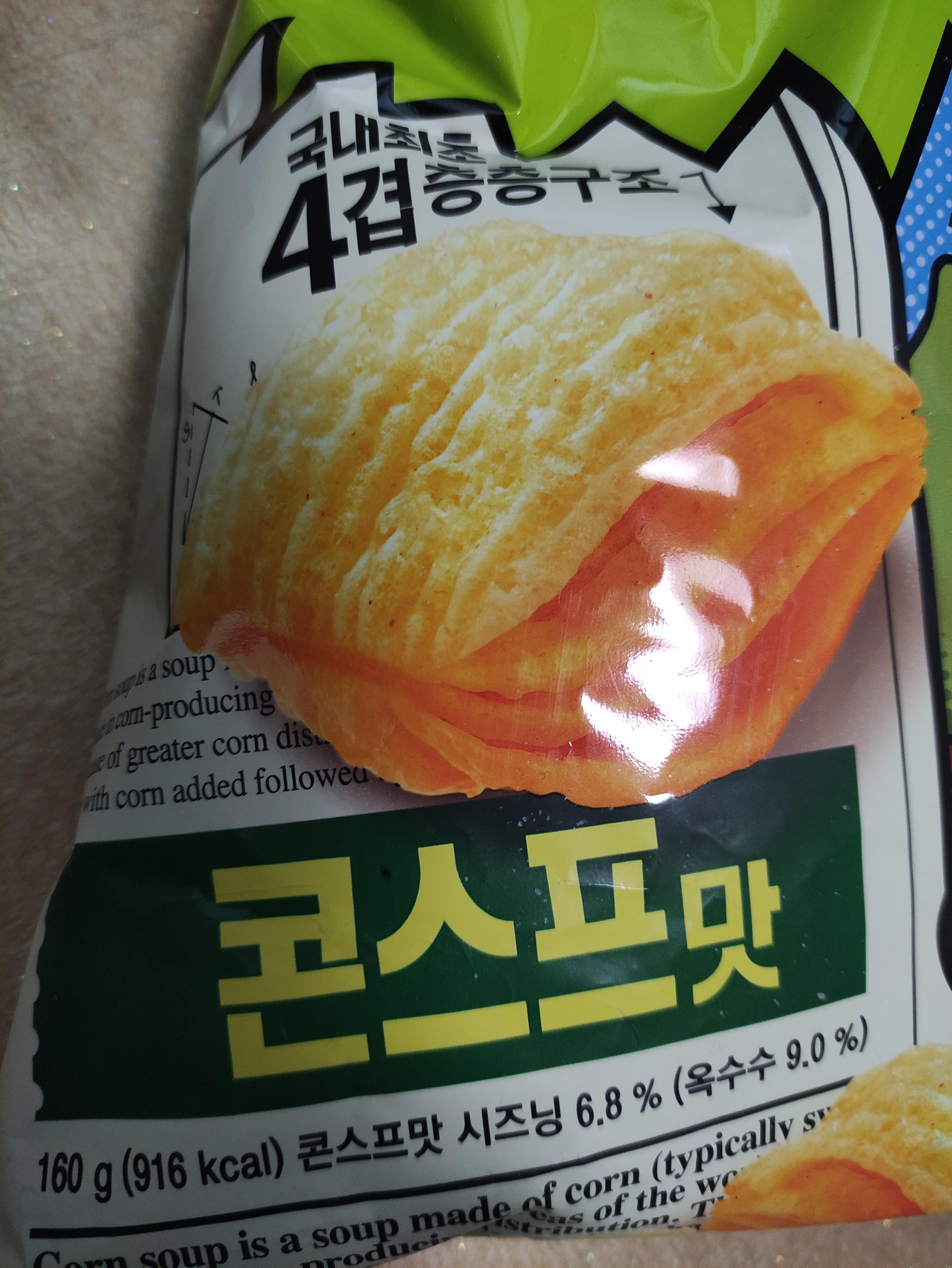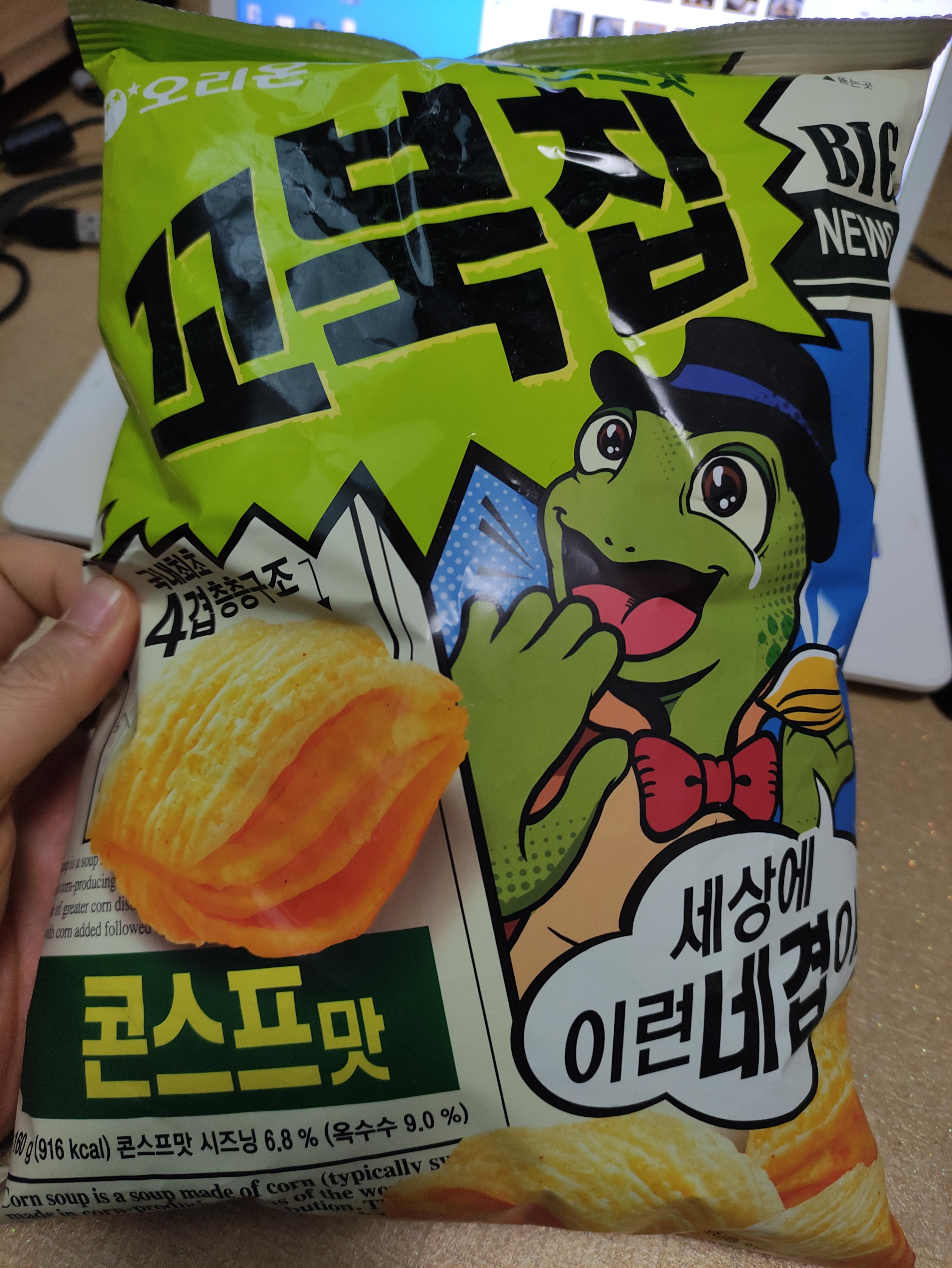 콘스프맛은 요즘 콘소메팝콘도 나와서 익숙하지만 저 네겹과자의 모양, 식감은 참 신기하네요. 바삭한 식감이 일품입니다. 옆에서 보니 약간 선그라스낀 거북이처럼 생기기도 했군요. ㅎㅎ;; 바삭바삭 꼬북칩 맛있게 잘 먹었습니다. 개인적으로 콘스프맛외에 다른맛이 나와도 좋을거 같다는 생각을 해봐요. 식감이 정말 좋아서 기억에 남네요. ㅎㅎ