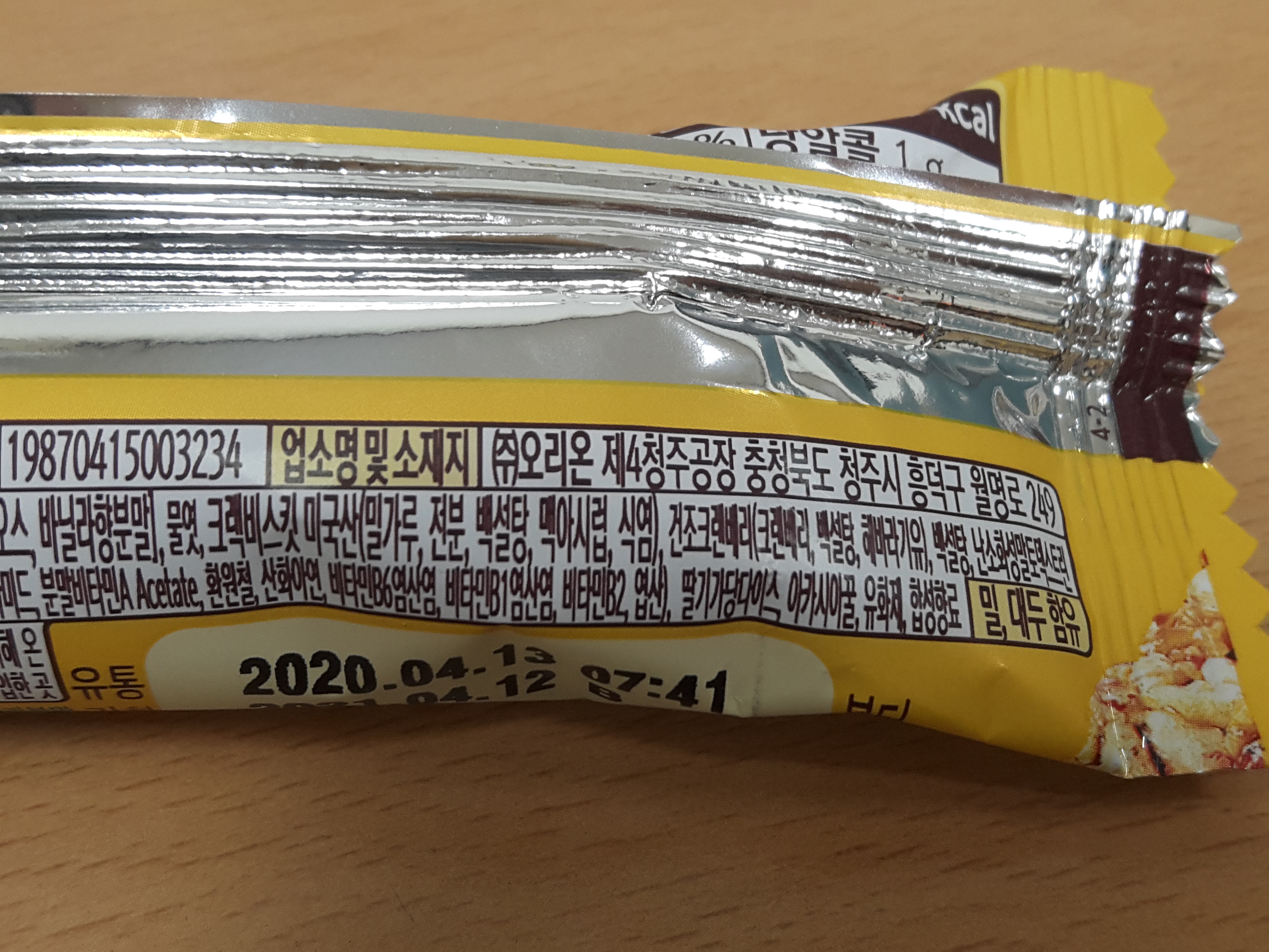 오리온 제4청주공장에서 제조하고요. 알러지유발물질로 밀과 대두가 함유되어 있습니다.