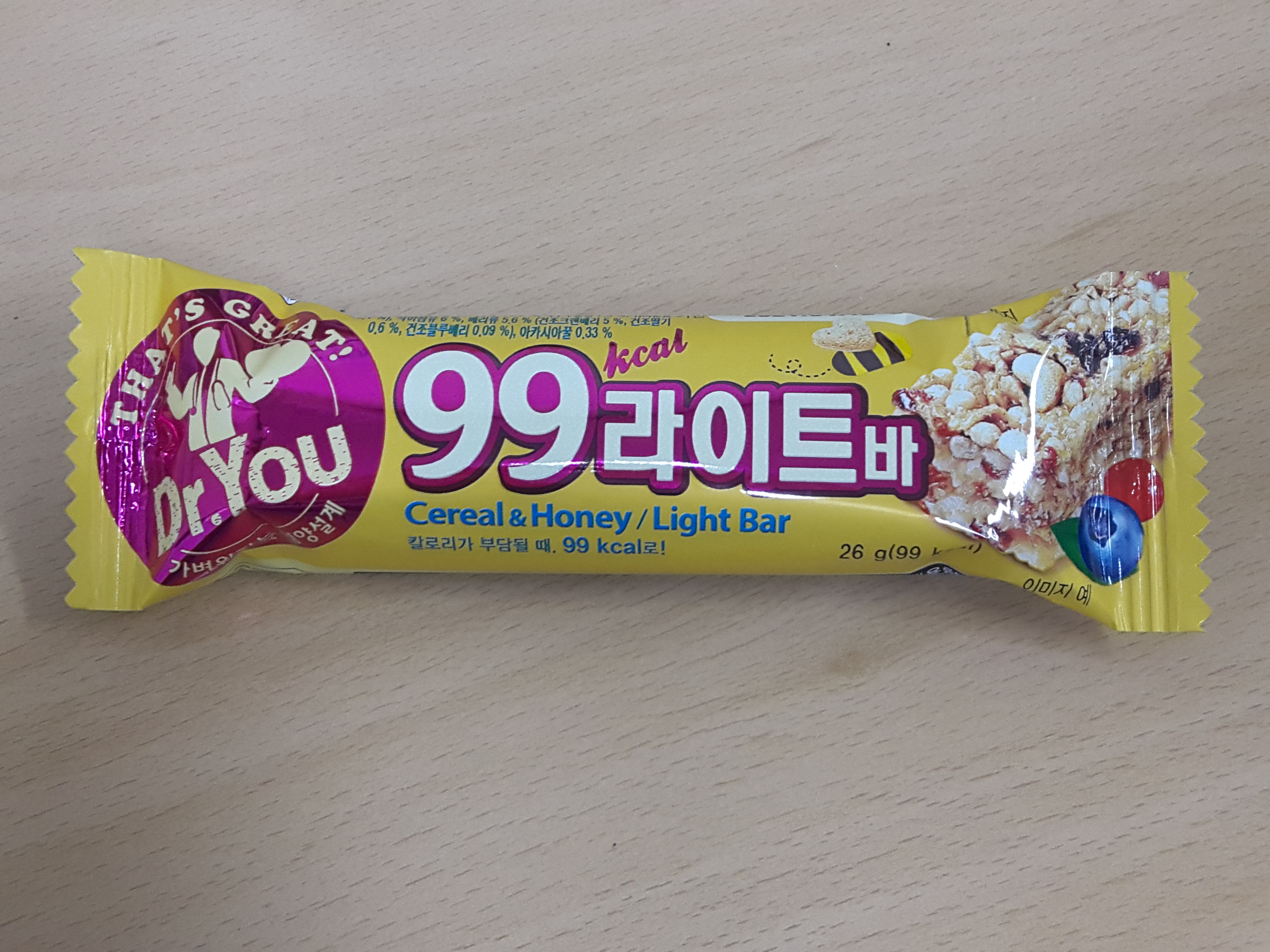 닥터유 99라이트바 입니다. 시리얼&허니를 적절히 조합한 식사대용, 건강식 바에요. 이름에 99가 붙은것처럼 99kcal로 보통 에너지바가 100칼로리 이상인 점을 생각하면 아주 칼로리가 낮은것이 특징이네요.