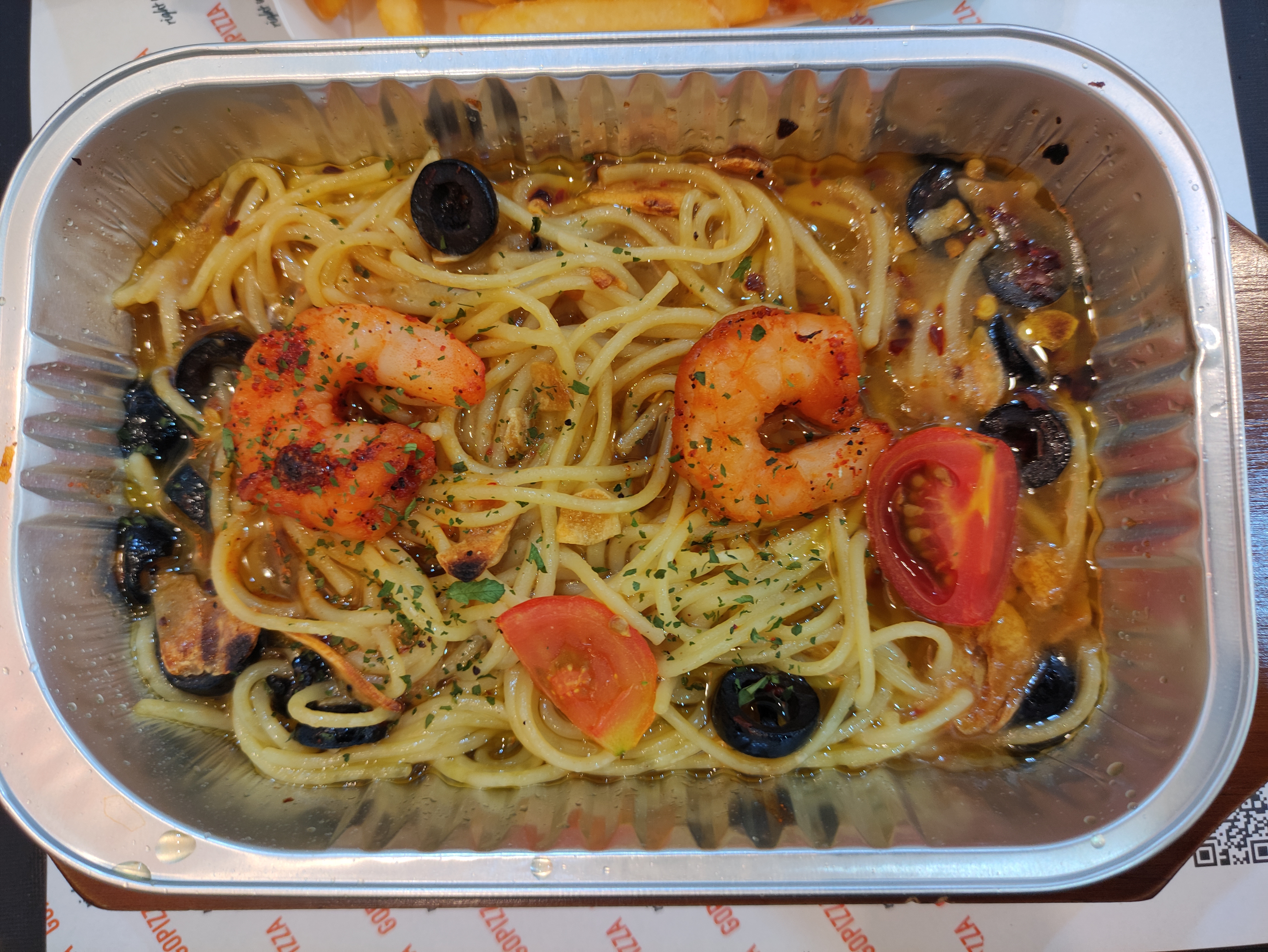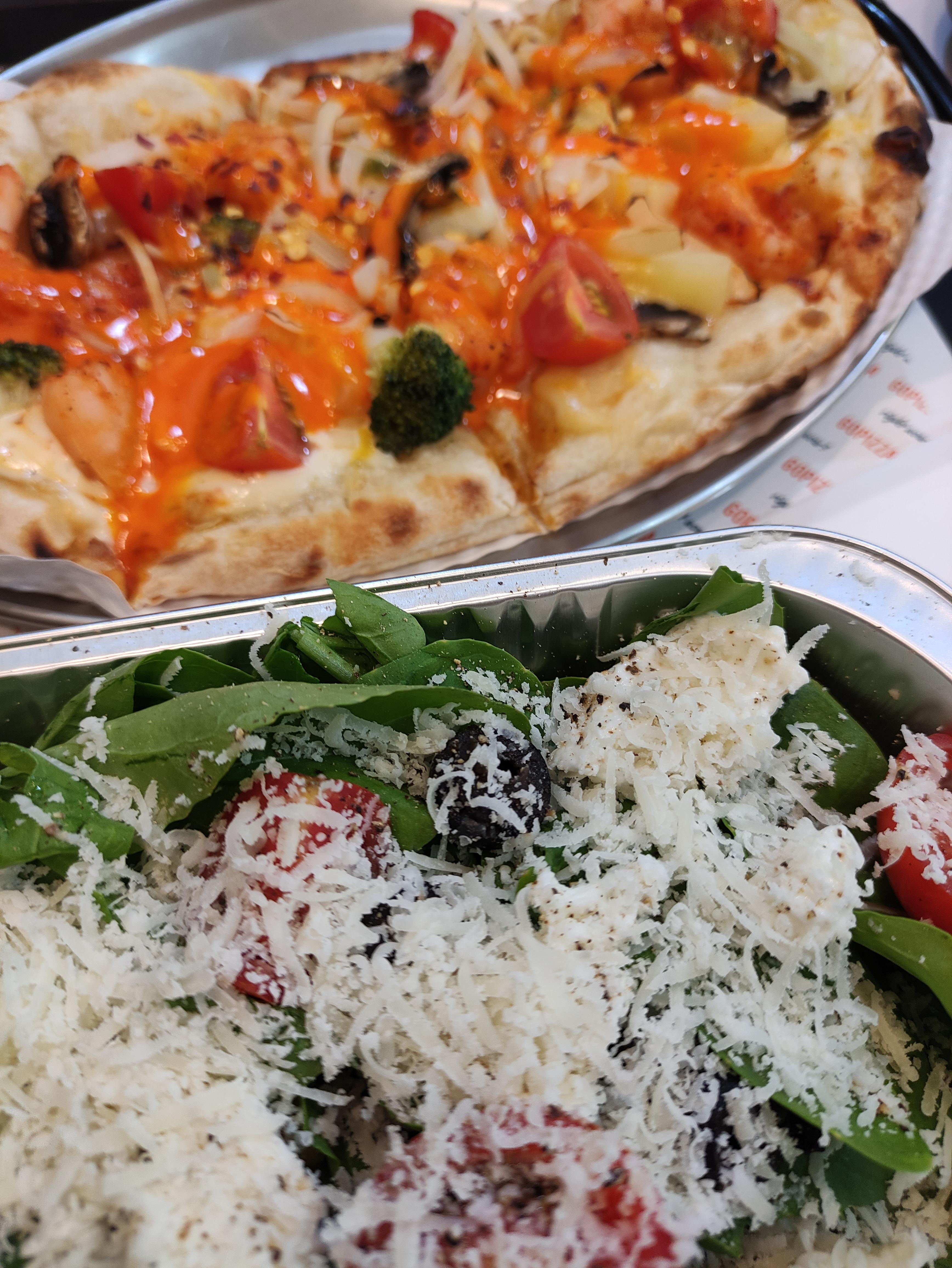 저는 1인피자와 감바스파스타, 그리고 포테이토, 샐러드를 주문했어요. 1인피자는 신메뉴인 스리라차쉬림프 피자를 주문했습니다.