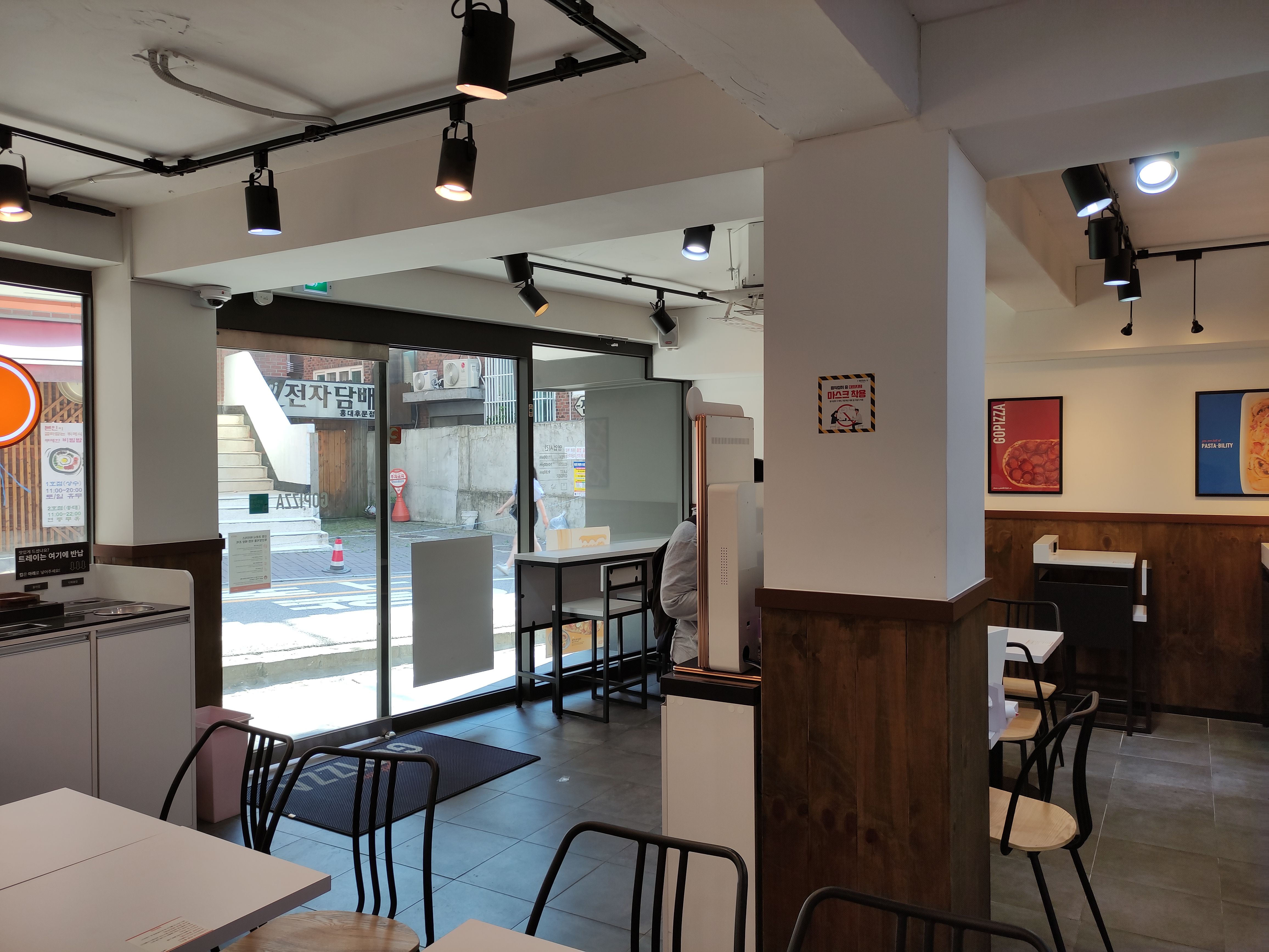 여기는 1인피자, 파스타 전문점이에요. 보통 피자하면 둥근 도우에 토핑이 가득올라간 3~4인 가족외식메뉴로 알고있지요. 여기는 그러한 패러다임을 깨고 혼자서도피자를 즐길수 있게 1인피자를 만들었어요. 우리나라에서 1인피자를 거의 처음으로 출시했다고해요.
